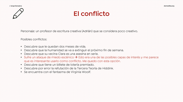 De todos los personajes que he anotado en mi libreta de ideas, y basándome en mi propia experiencia personal, el protagonista de mi historia será: un profesor de escritura creativa.
