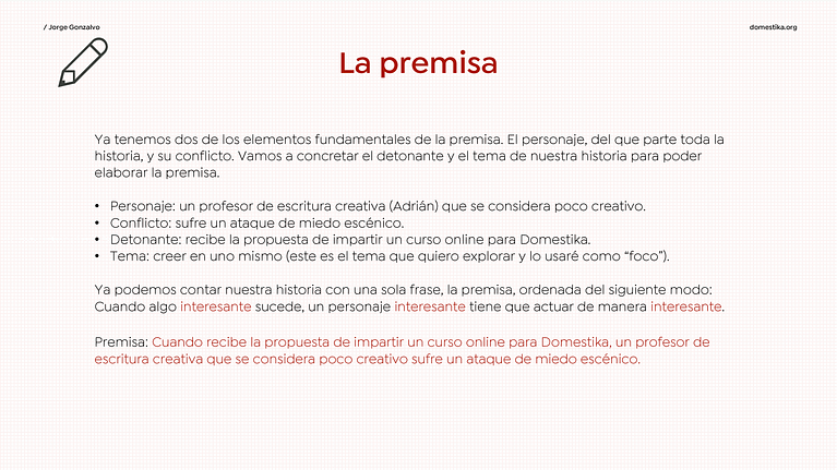 Una historia interesante es aquella que le sucede a un personaje interesante. Una de las formas de construir la premisa que me gusta mucho y que hemos visto en este curso es: