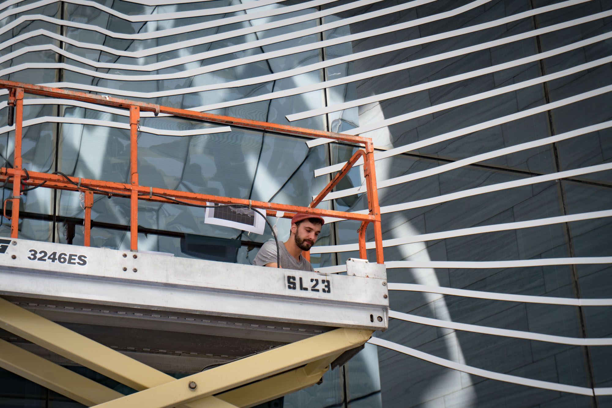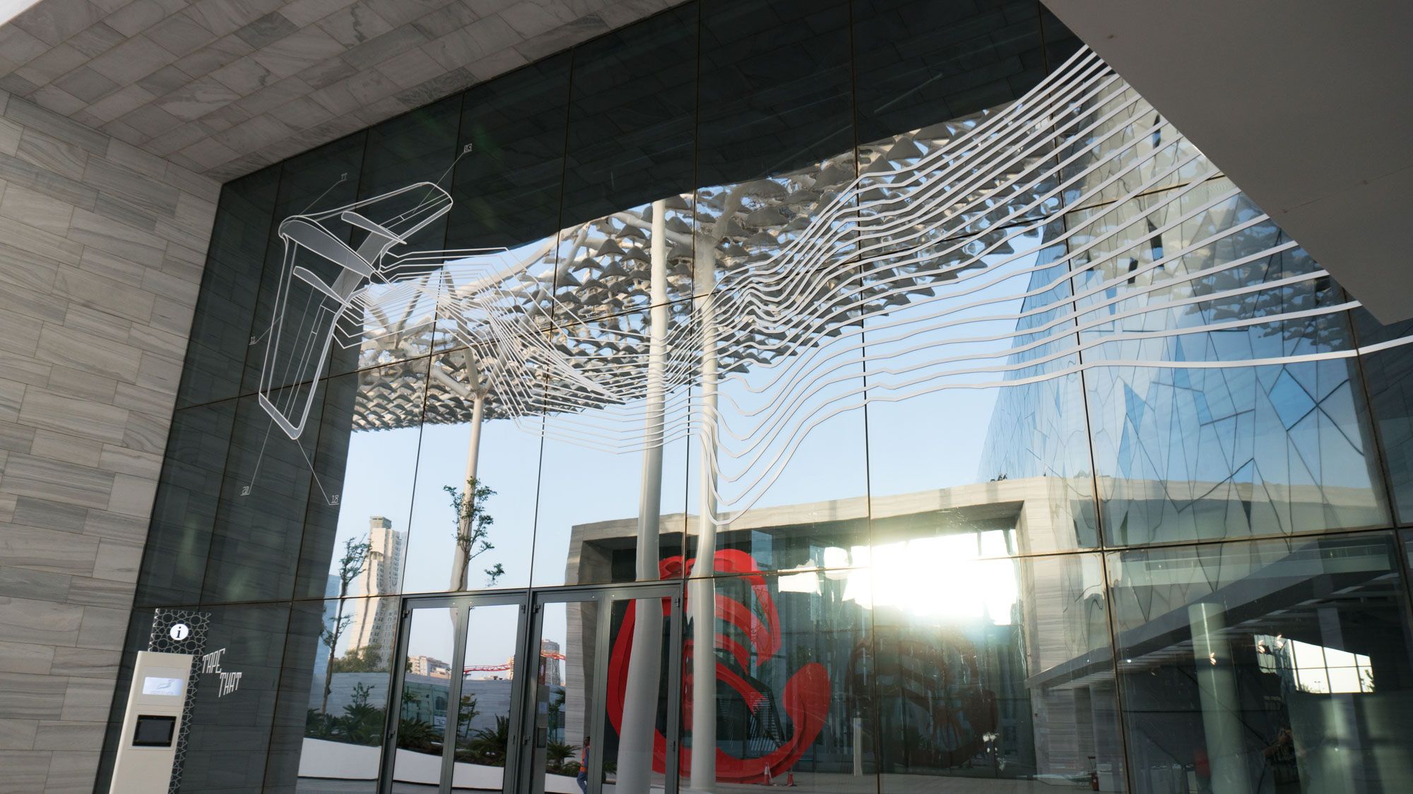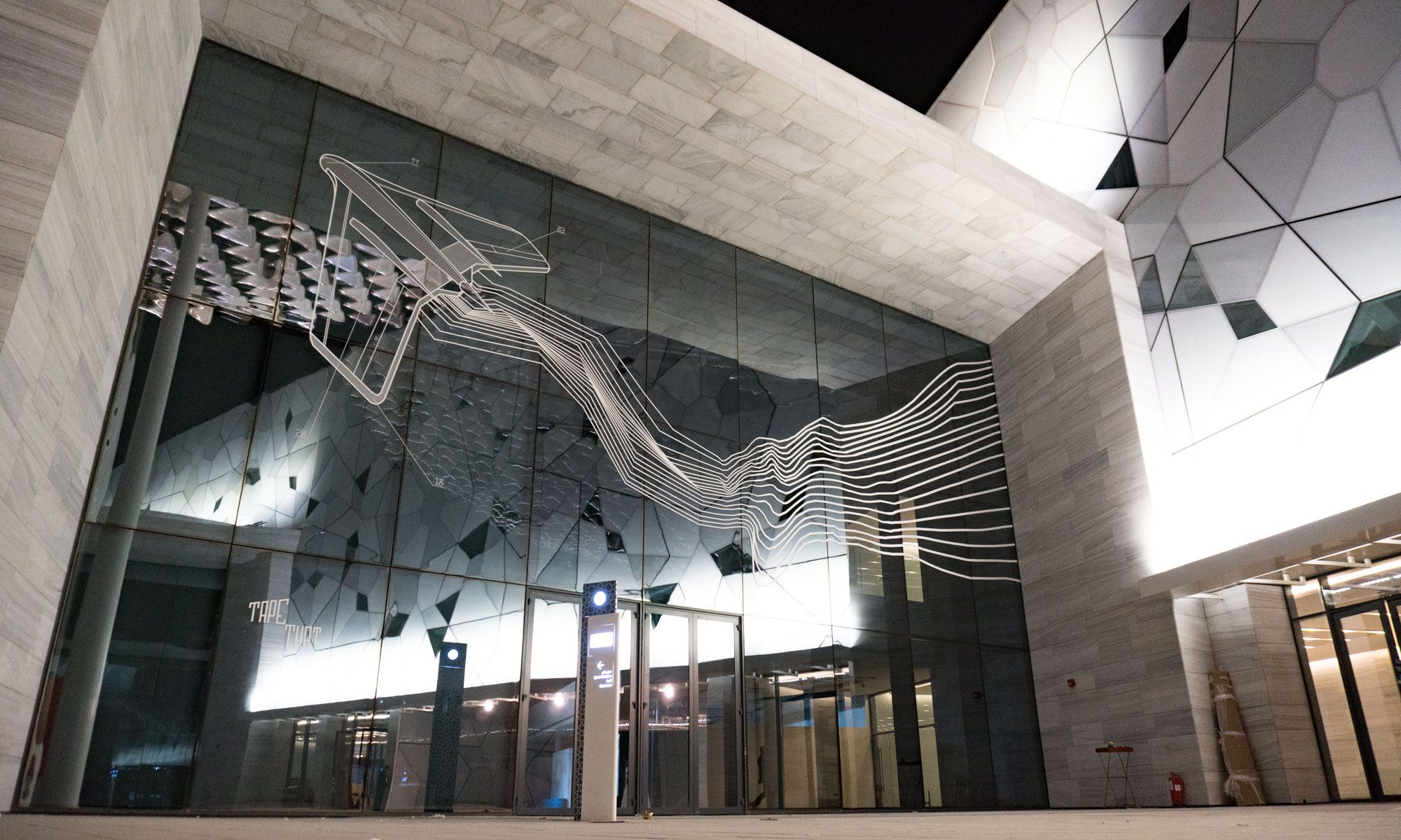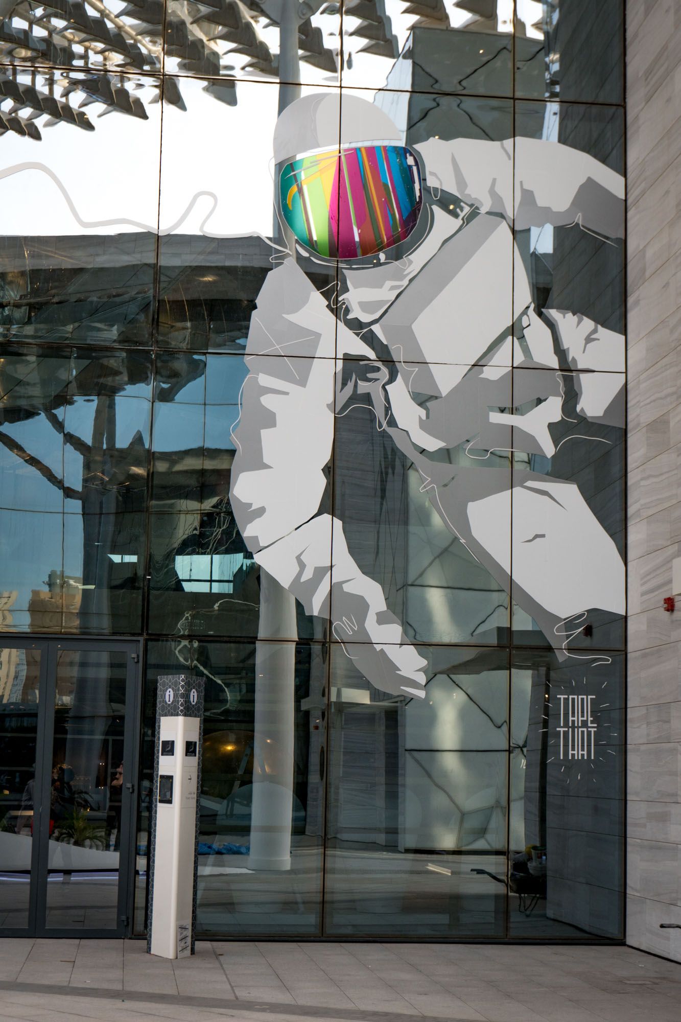 Wir hatten ein großartiges Erlebnis in Kuwait, einem Land, in dem Tape Art fast völlig unbekannt war. Das Sheikh Abdullah Al Salem Cultural Centre in Kuwait City ist ein brandneuer und riesiger Komplex von Museen, Galerien und Arbeitsräumen, der der Öffentlichkeit zur kostenlosen Bildung angeboten wird. In Vorbereitung der offiziellen Eröffnung des Zentrums wurden wir eingeladen, zwei Fassaden und den Flur des Zentrums für bildende Künste zu gestalten und einen Workshop mit lokalen Kunststudierenden abzuhalten. Unser Wandbild an der Fassade des Museums für Wissenschaft und Raumfahrt zeigt einen 7 m hohen Astronauten. Nachts lassen die reflektierenden Lichter auf der Innen- und Außenseite des Glases den Astronauten scheinbar im freien Raum schweben. Für die Besucher scheint es so, als ob sie ihn aus dem Inneren einer Raumstation betrachten würden. Das zweite Wandbild zeigt auf spielerische Weise die Entwicklung der Technologien in den Bereichen Transport und Robotik. Ein futuristisches Flugzeug ist im Begriff, nach einem abenteuerlichen Flug die Struktur der Fassade zu durchbrechen.