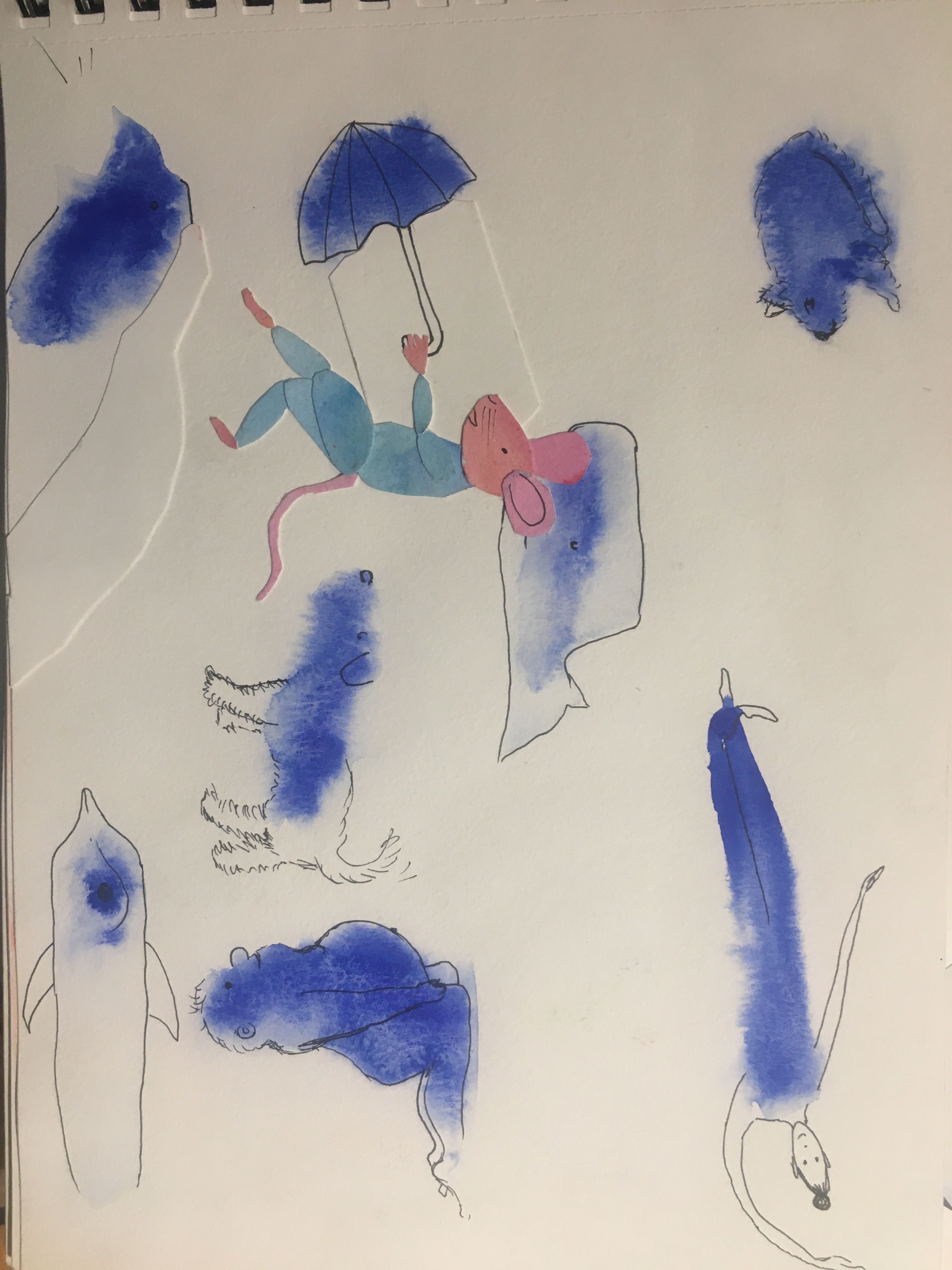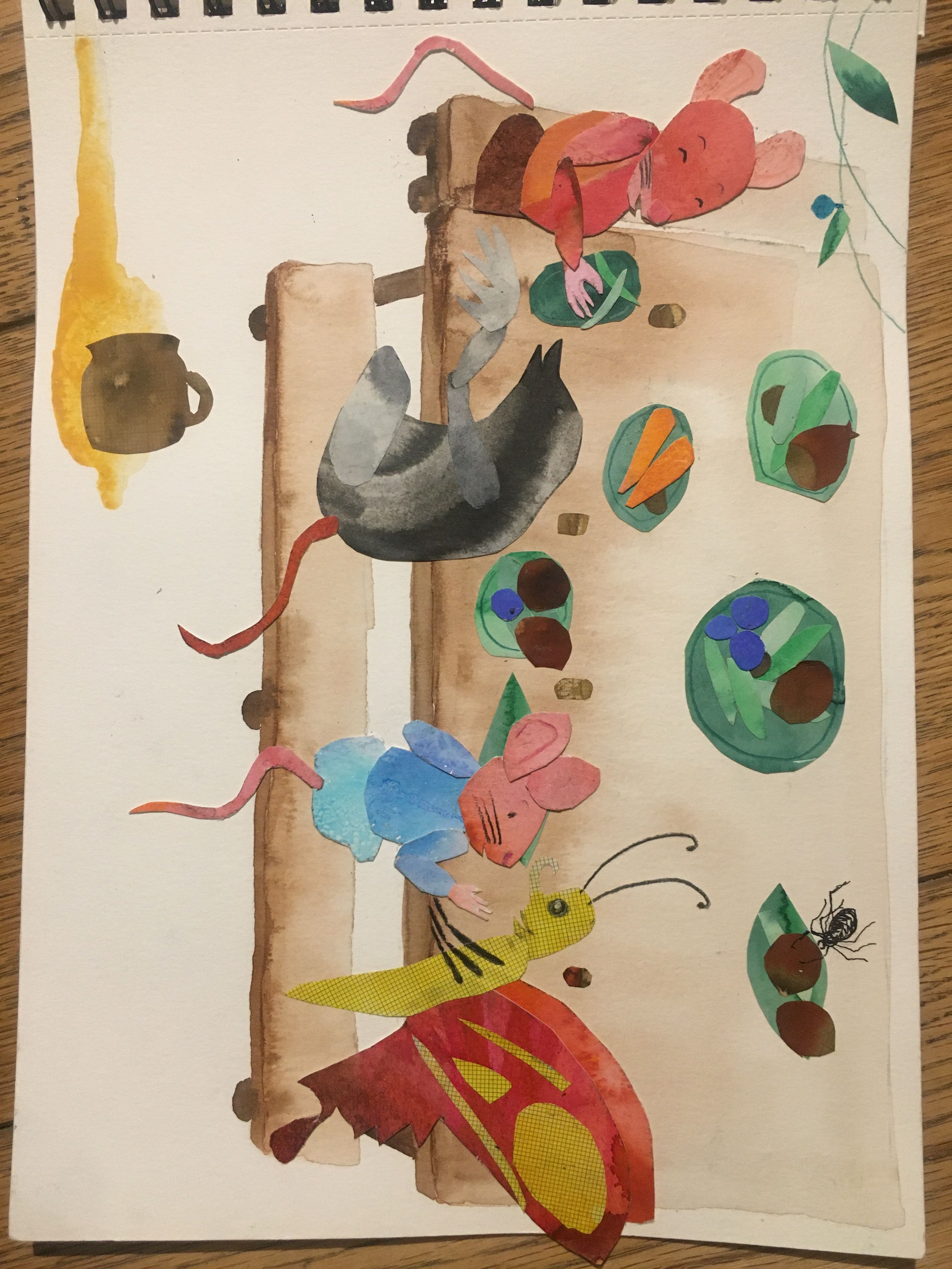 ¡Wow wow! Aparentemente un trabajo tan simple pero tan brillantemente elaborado, que una gran imaginación. Me encantan muchas cosas de esto, y desearía poder hojear las páginas yo mismo. Rana de collage brillante y pinceles pintados bellamente colocados en la línea. Súper topo y hormigas apareciendo a través de las formas de los ejercicios. Encantador ratón montando en el avión, la belleza de tu perro mojado sobre mojado y hermosos pájaros y arañas. Y luego los personajes se reúnen para un picnic final: ¡maravilloso! Me encanta todo. Muchas gracias por compartir.