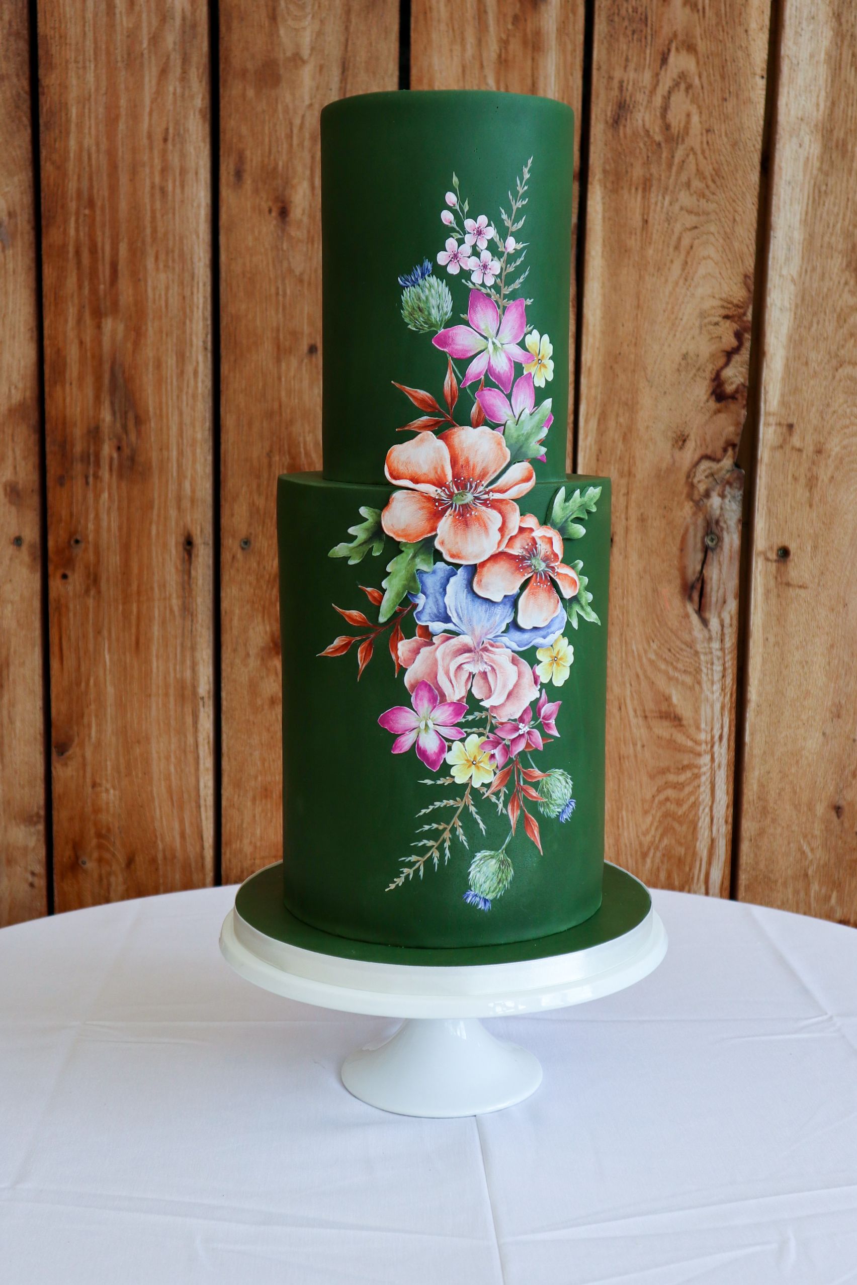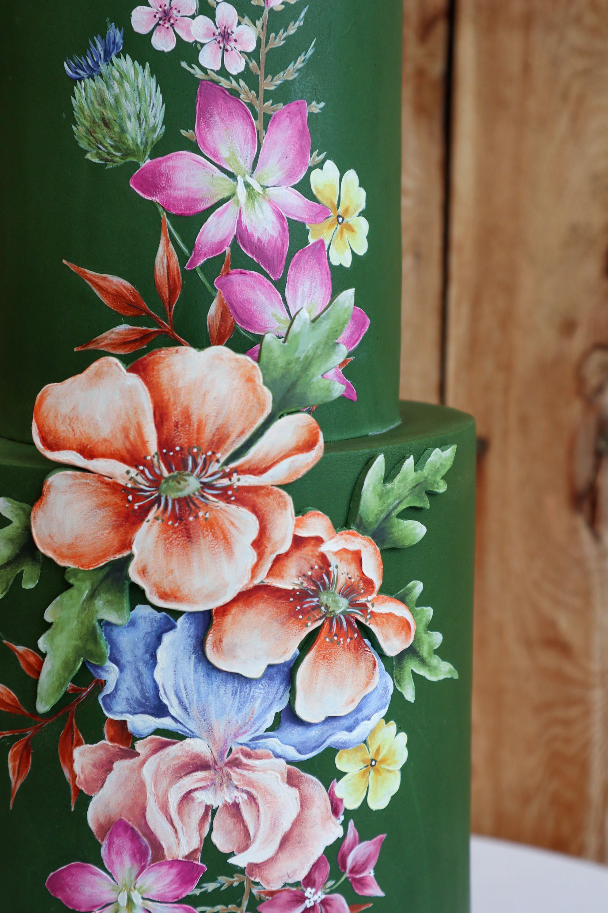 This real wedding cake was designed for a couple who loved travel - each of the flowers featured in the hand painted design are national flowers of places they have visited! I love painting on dark coloured backgrounds and cocoa butter paint is perfect for this as because the paint is opaque the colours still really pop!