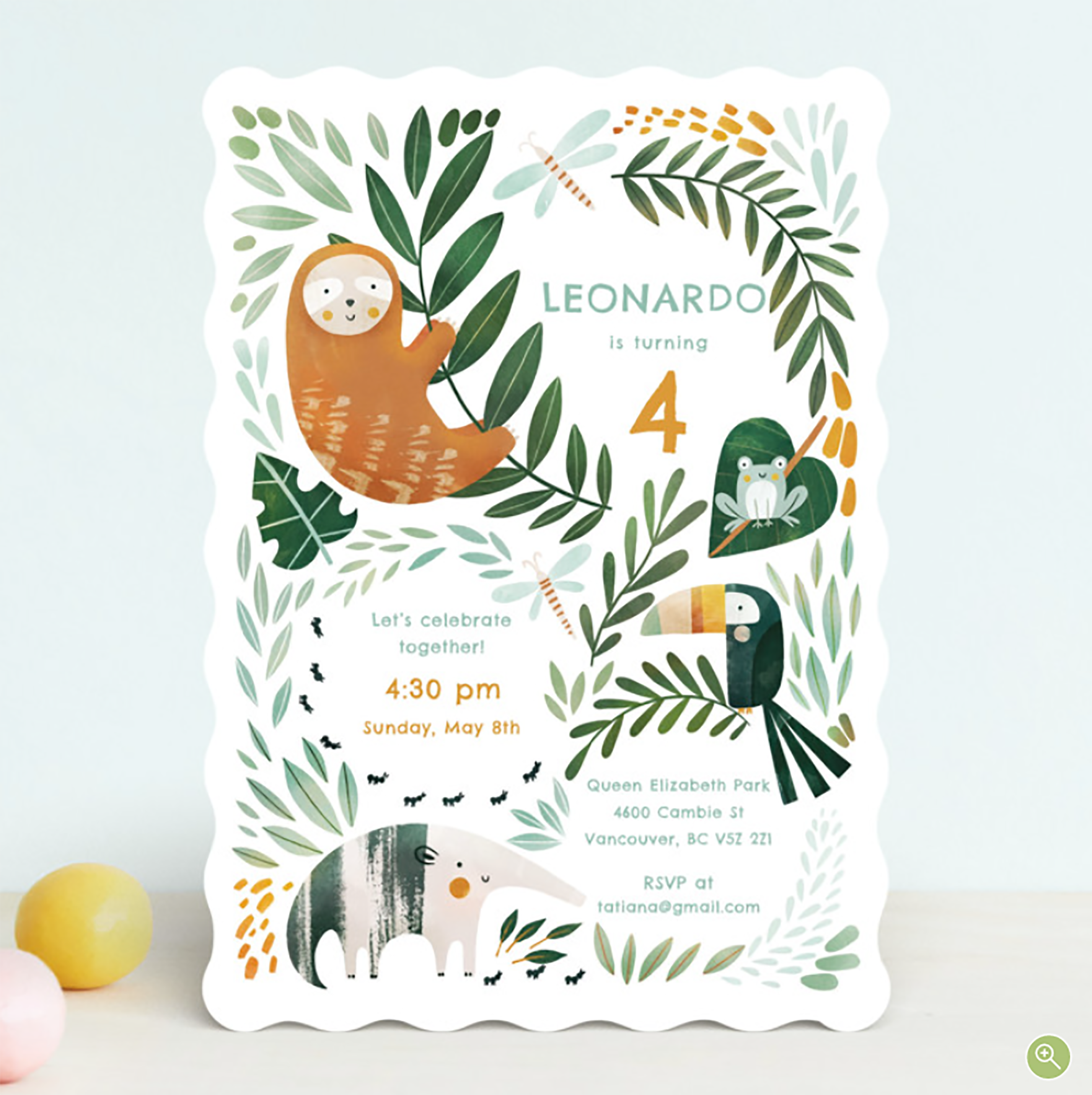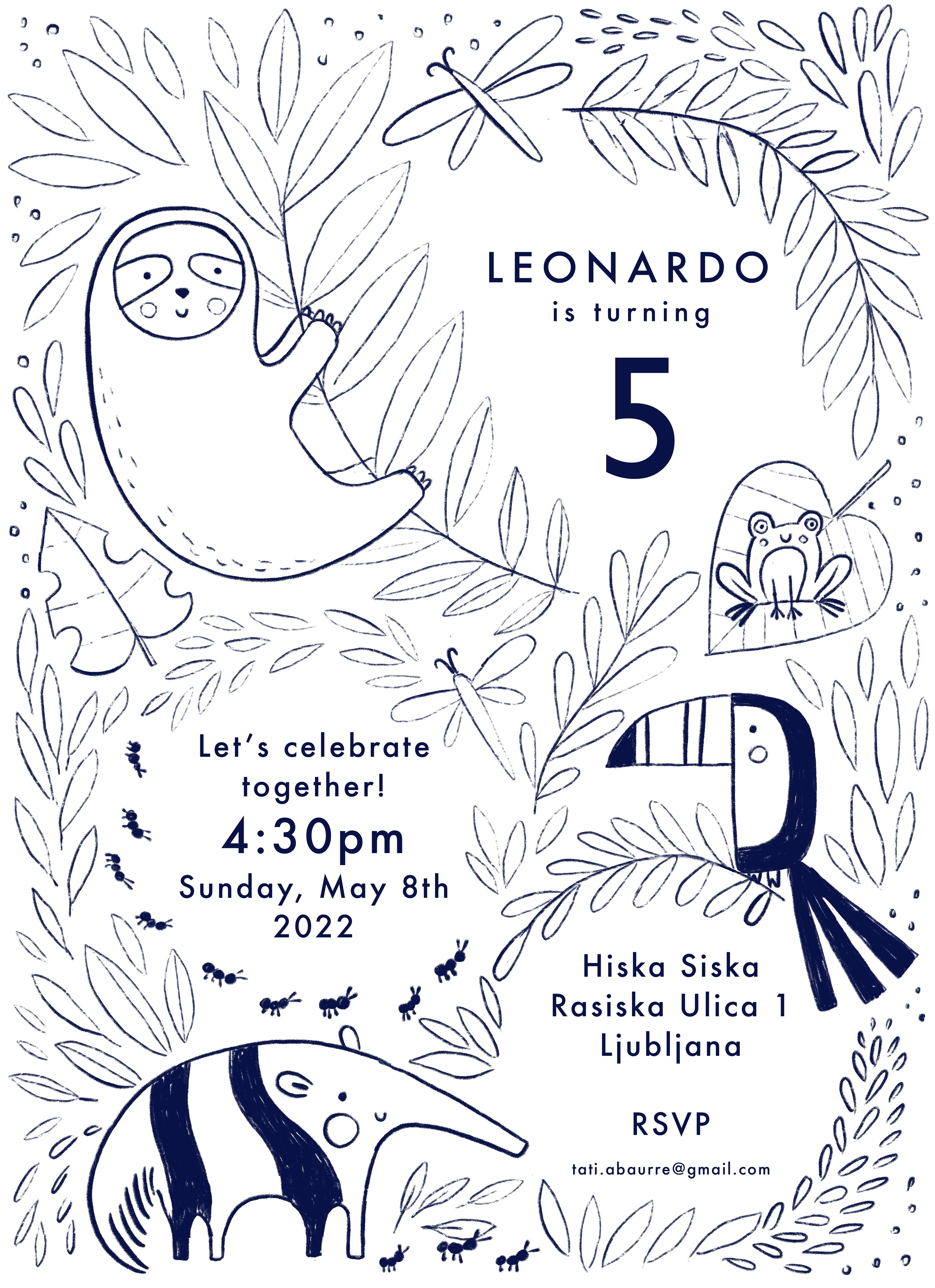The Sloth Jungle birthday invite was created for a Minted competition and won 3rd place. It includes the main illustration and coordinating elements for envelope, favour stickers and a pattern for the envelope lines. It's a fun and cute pattern featuring beautiful animals of Brazil.