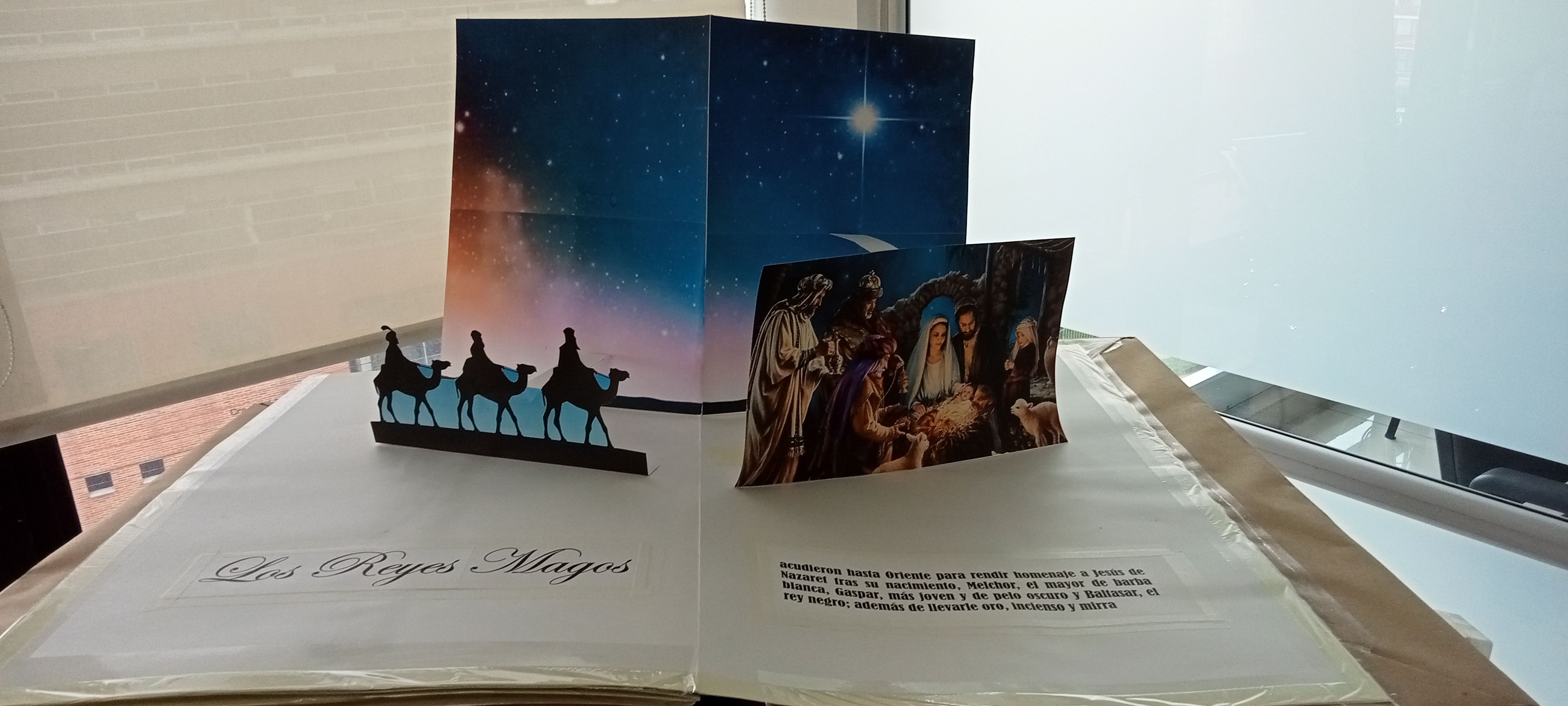 Gracias un proyecto que me permito realizar un concepto de libro de forma interesante; con motivo de la navidad y del concurso de decoración que se realiza en mi entidad aproveche lo aprendido para realizar un libro de 4 hojas con las cuatro etapas más importantes de la navidad, anunciación, viaje a Belén, nacimiento del Niño Jesús y visita de los reyes magos; cada hoja tiene una medida de 45x65cm libro cerrado.