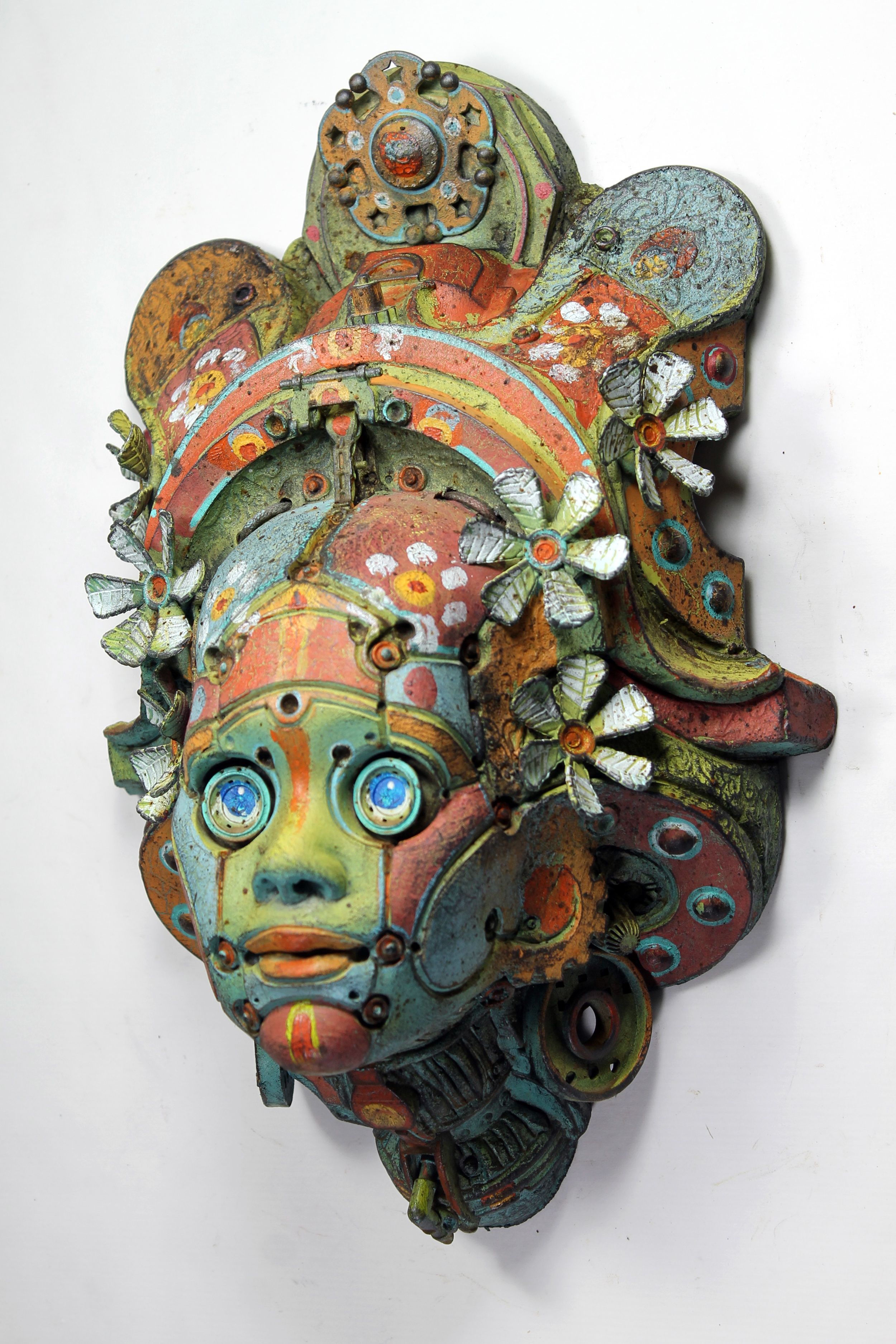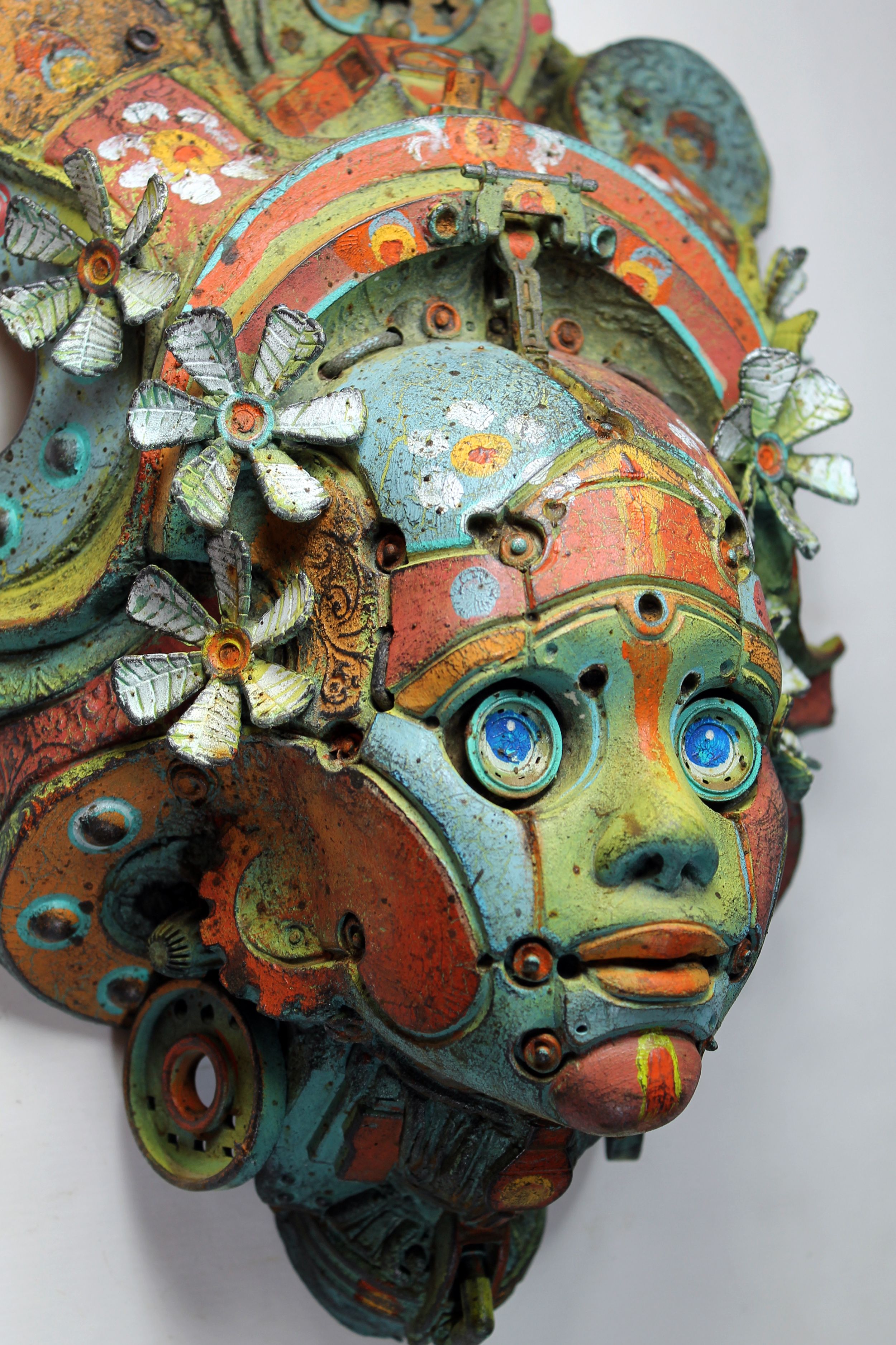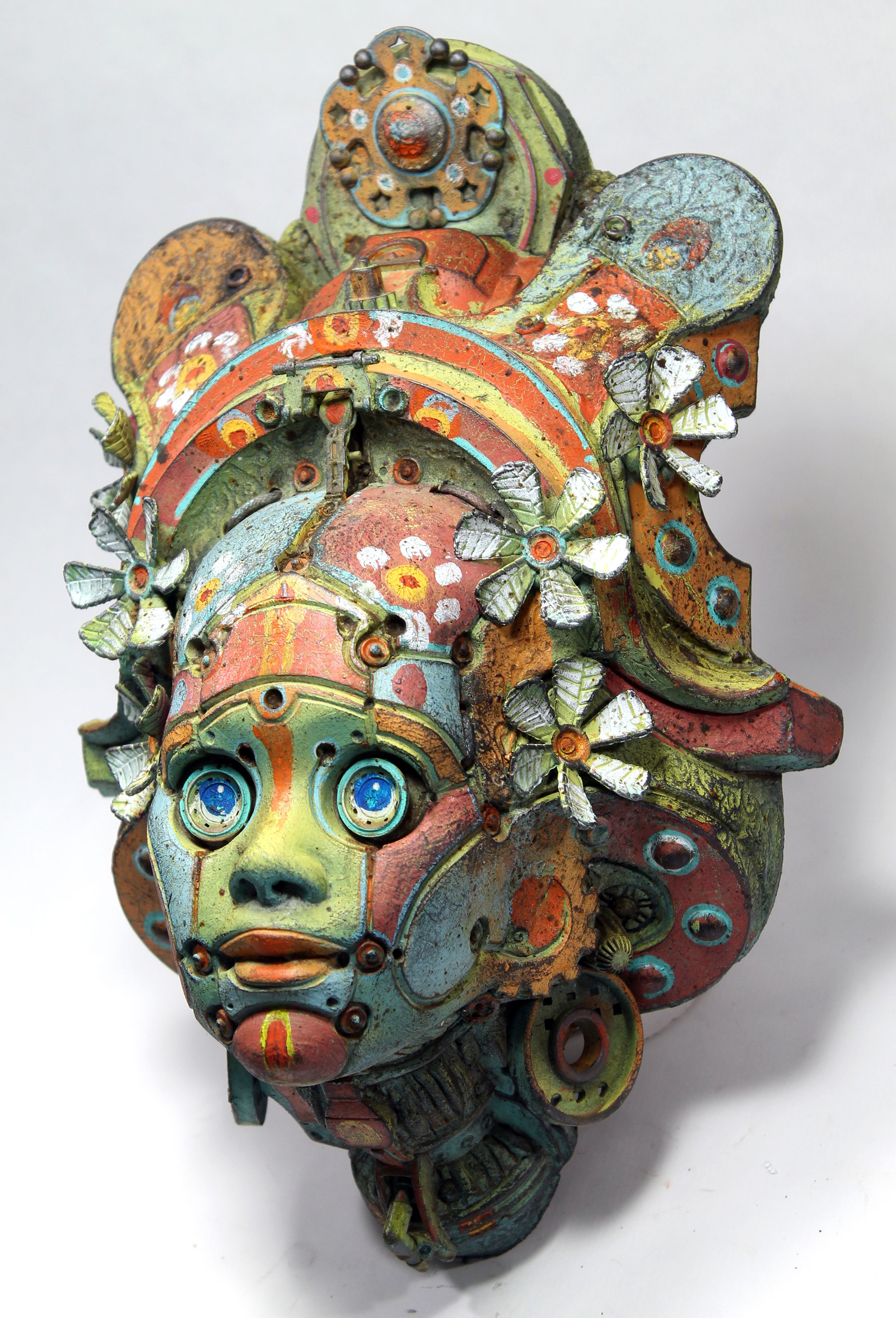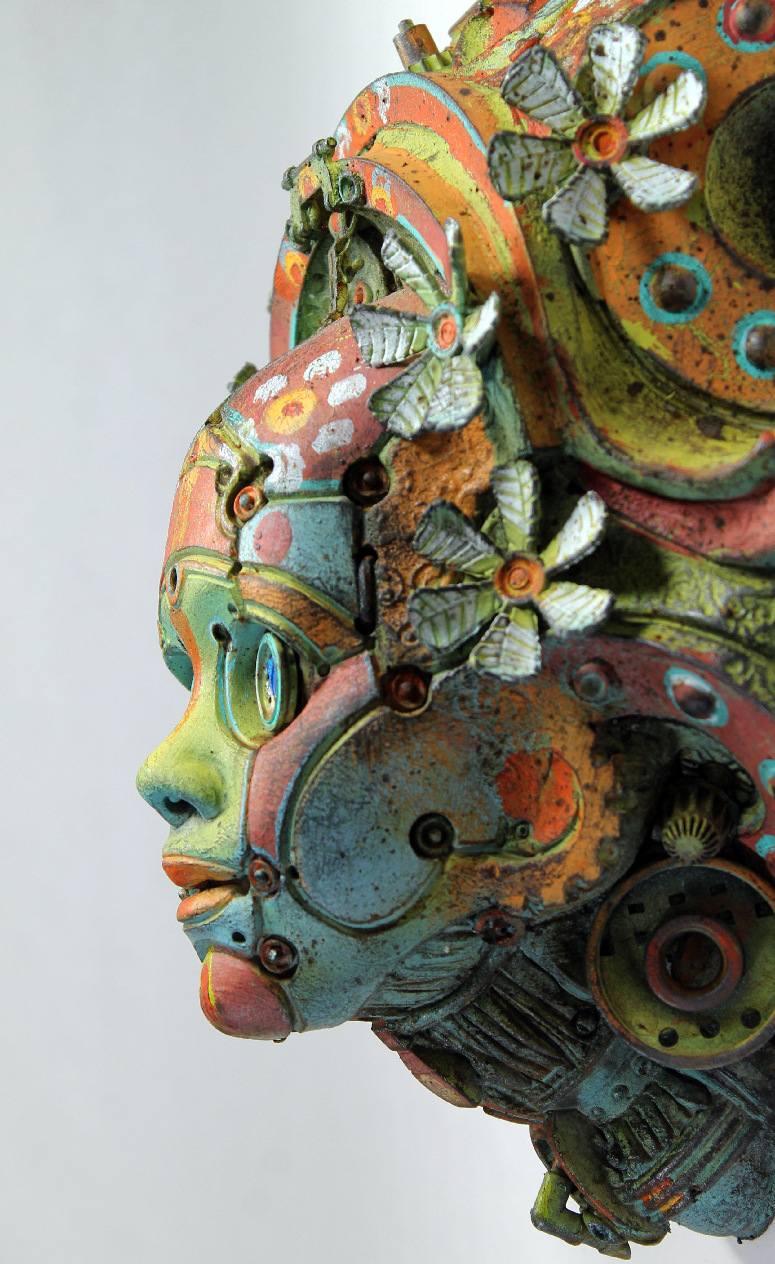 Para esta escultura combiné el modelado en arcilla refractaria, escayola tallada y objetos ensamblados. La copia final es en resina de poliuretano con detalles en masilla epoxi y objetos encontrados.