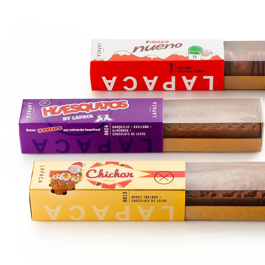 Para ello realizamos un diseño minimalista para los turrones más elegantes y un diseño más simpático y oscense para los "turrones homenaje" a las chocolatinas de toda la vida (Finger Nueno, Huesquitos y Chichar).