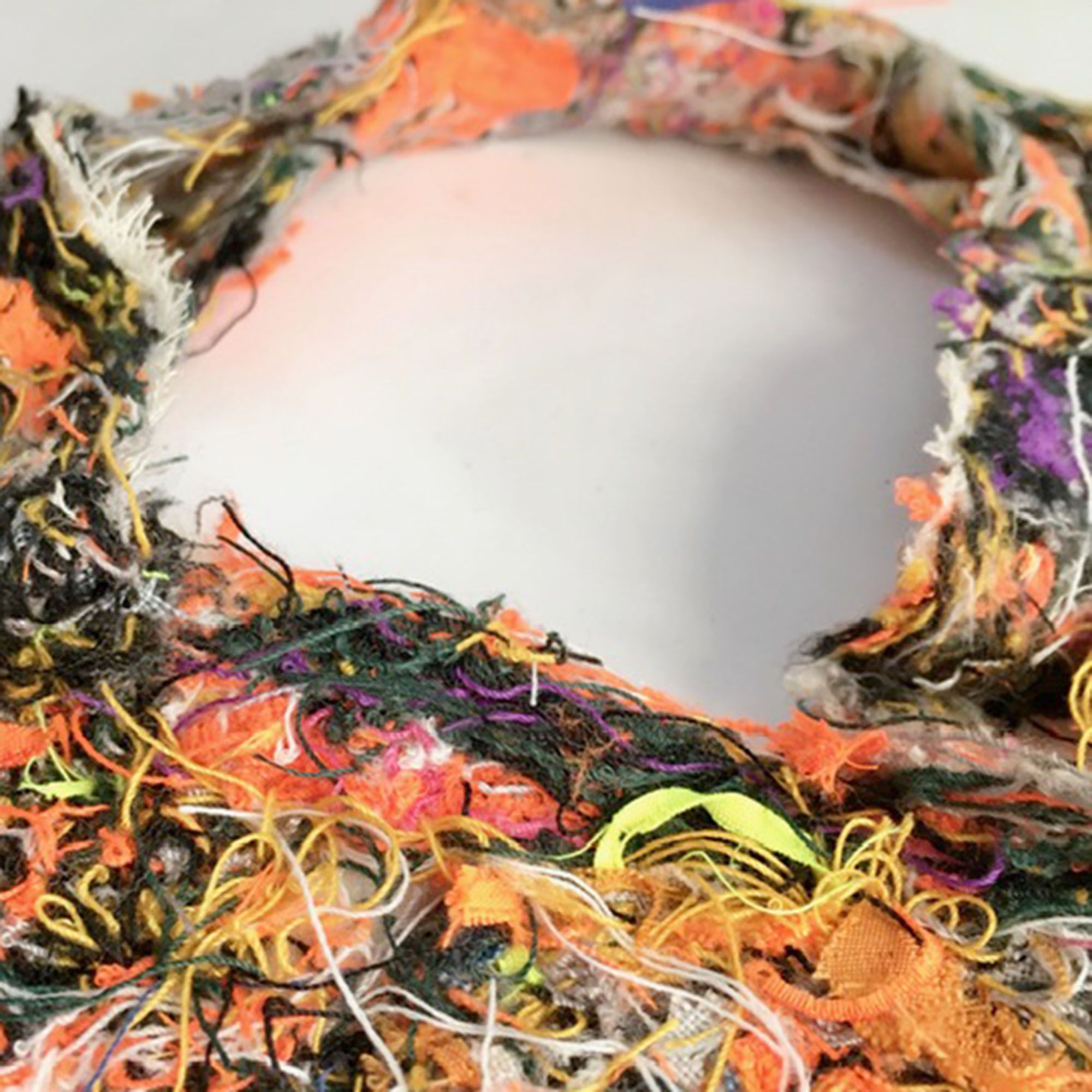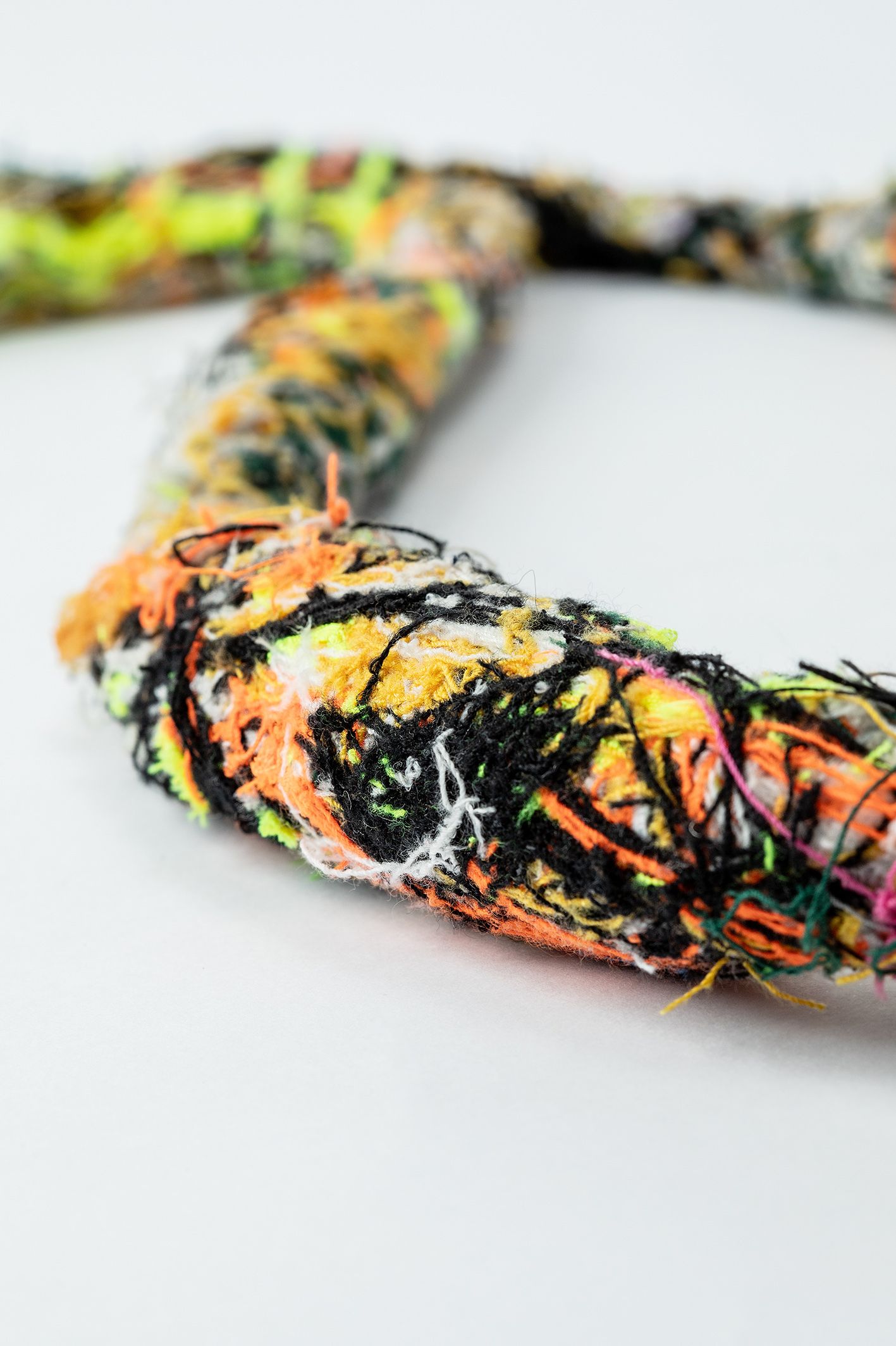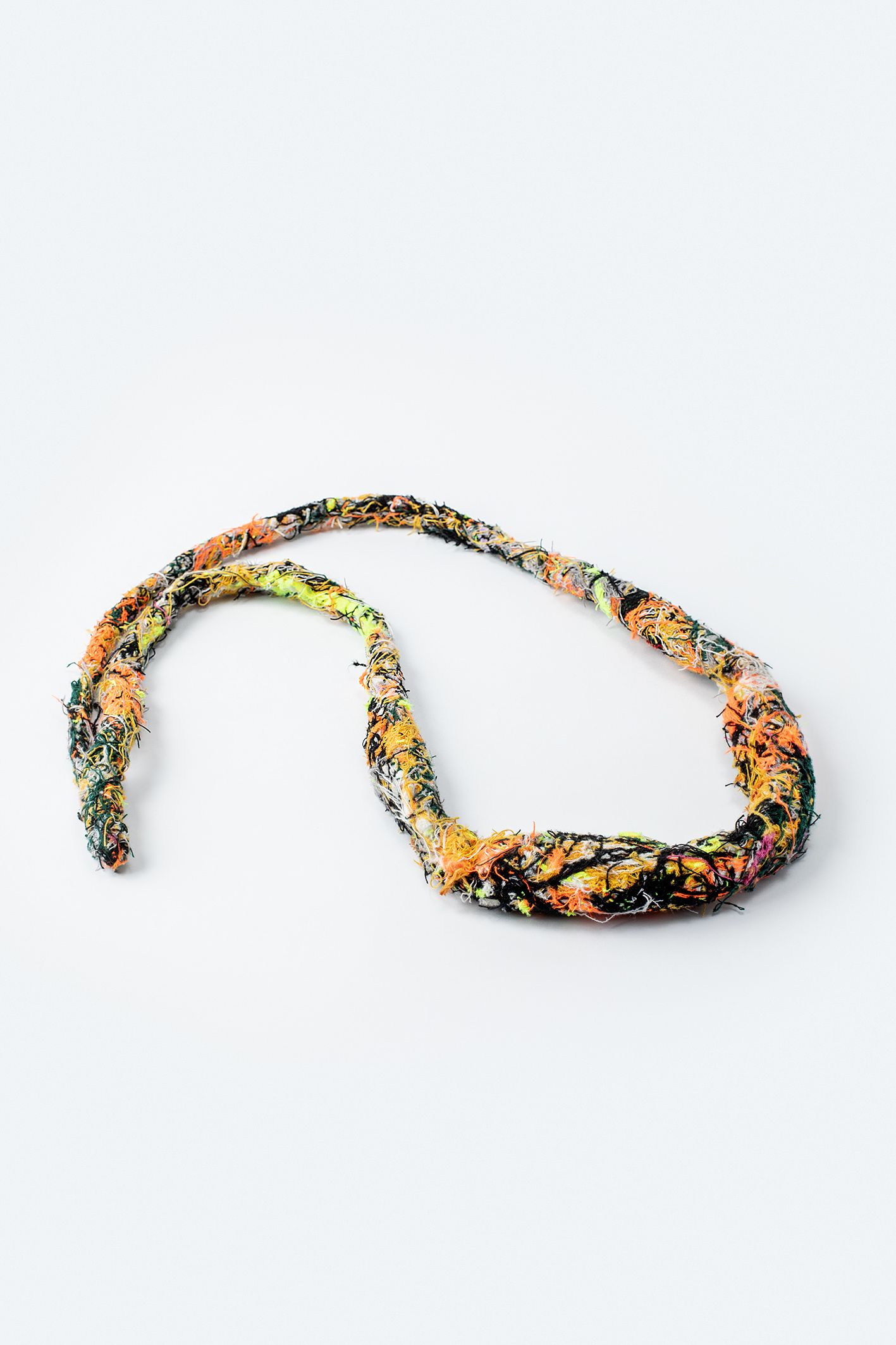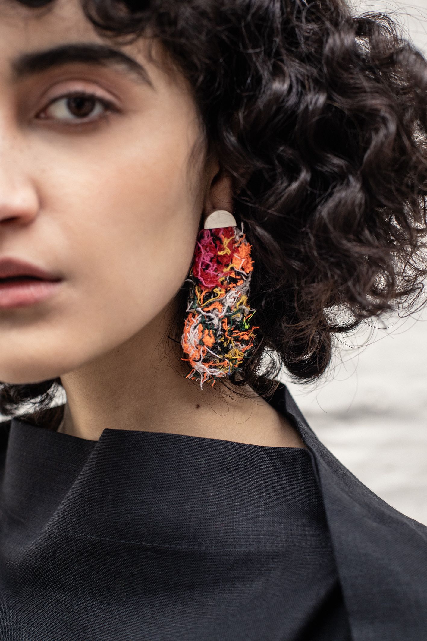 Las piezas diseñadas y creadas son el inicio de una experimentación, donde trabajé partir de hilachas, “merma” de textiles en desuso y una entretela que se utiliza en interior de las corbatas, “ el excedente, lo que no se ve, lo que no se quiere”. A través de la técnica de fieltro seco, se entrelazan las hilachas, para la creación una nueva materia, una membrana creada a partir de una unión colaborativa que, de manera individual e independiente, aparentemente no tiene valor. Se crearon dos piezas: un par de aros y un collar, terminaciones en plata 950 hecho a mano.