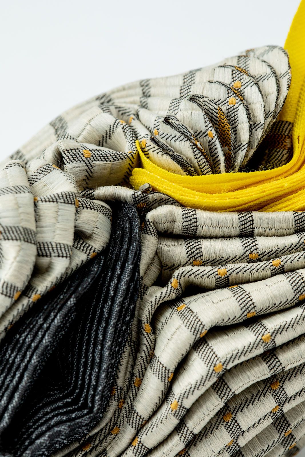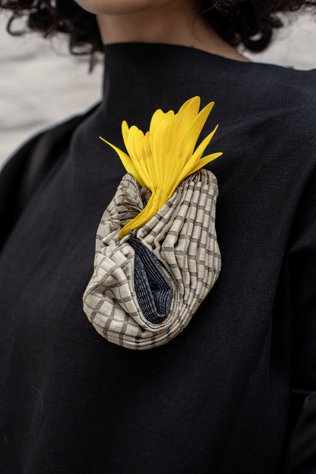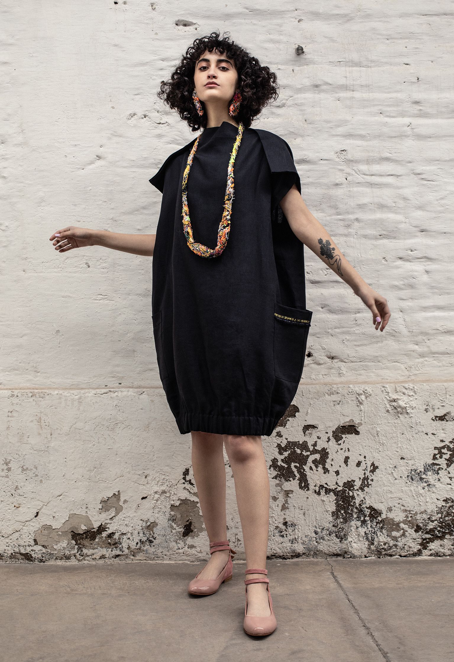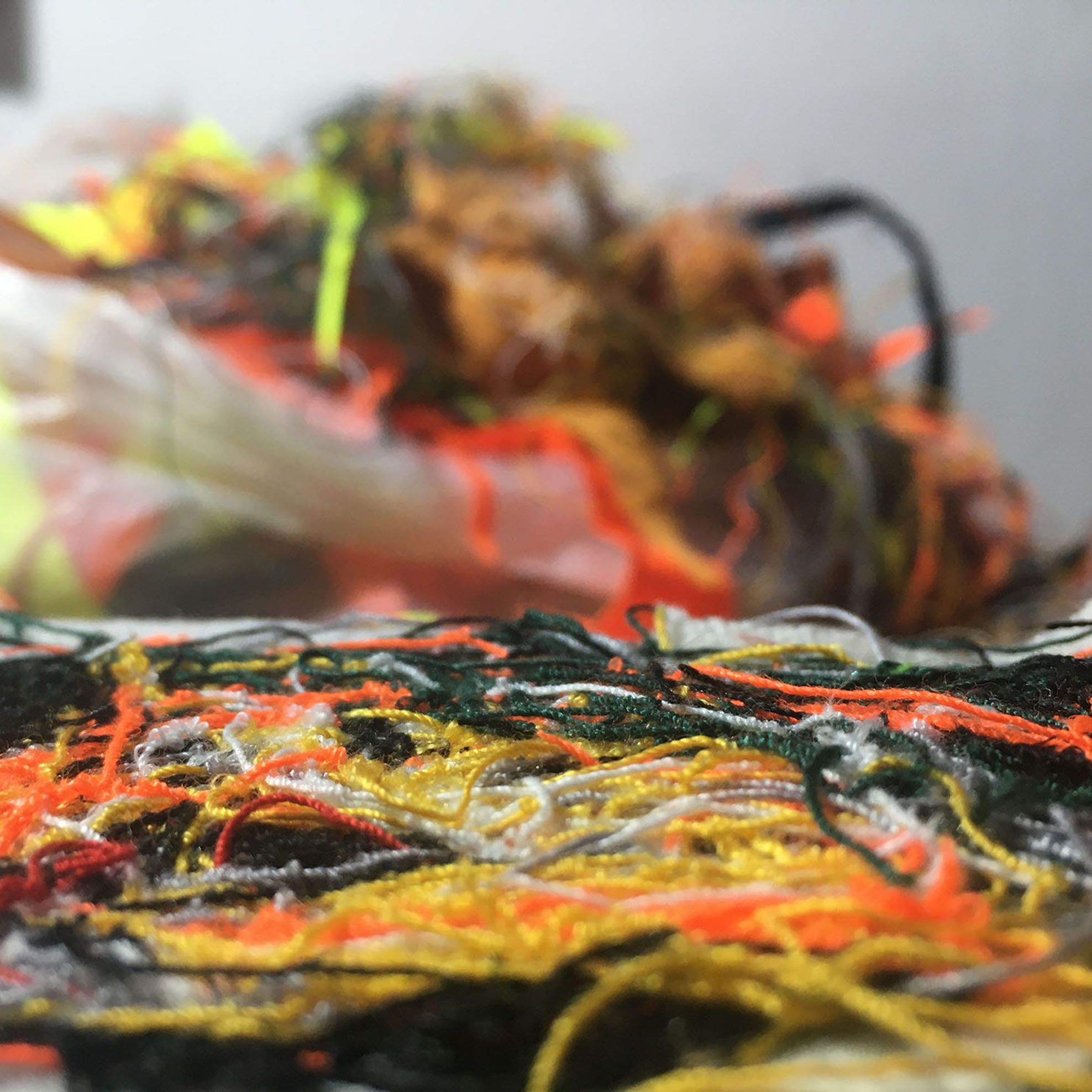 Las piezas diseñadas y creadas son el inicio de una experimentación, donde trabajé partir de hilachas, “merma” de textiles en desuso y una entretela que se utiliza en interior de las corbatas, “ el excedente, lo que no se ve, lo que no se quiere”. A través de la técnica de fieltro seco, se entrelazan las hilachas, para la creación una nueva materia, una membrana creada a partir de una unión colaborativa que, de manera individual e independiente, aparentemente no tiene valor. Se crearon dos piezas: un par de aros y un collar, terminaciones en plata 950 hecho a mano.