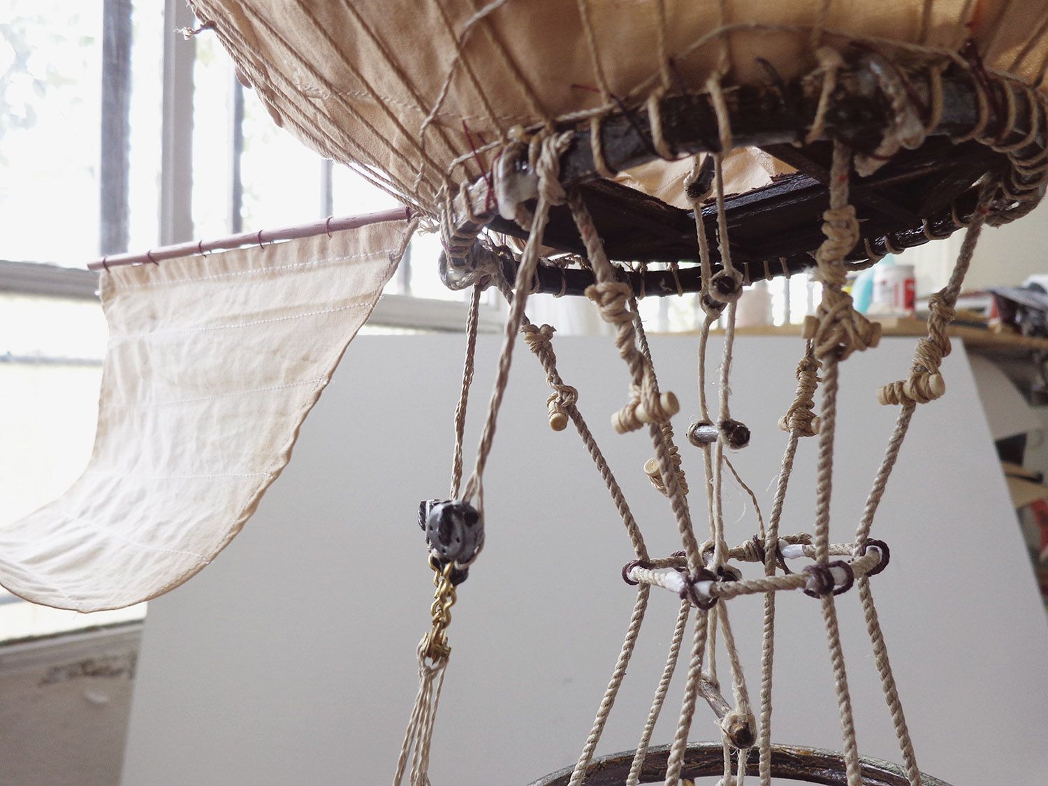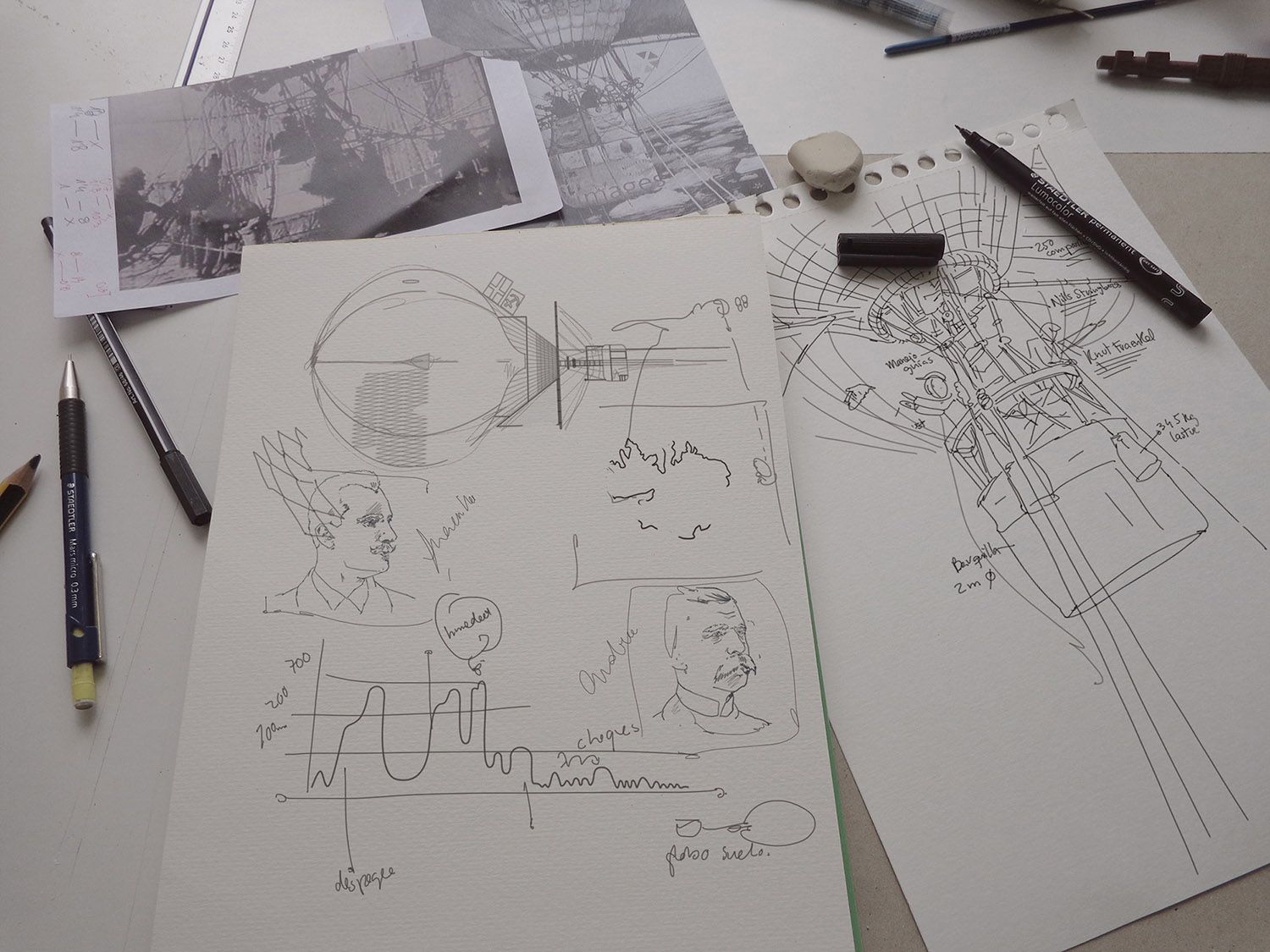 Empecé haciendo bocetos de la figura principal para construirla a escala, luego investigué sobre el tema para incluir todos los detalles, (desde el funcionamiento del globo hasta un libro donde se recopilan parte de los diarios que Andrée escribió) e hice la escultura del globo. Para añadir los tres tripulantes tomé como modelo un amigo fotografiándole en las posibles poses que tendrían los protagonistas e hice bocetos. La forma de añadir los elementos ha sido un poco caótica, el orden lo he ido llevando según me atascaba en la escultura o en los elementos secundarios, etc..