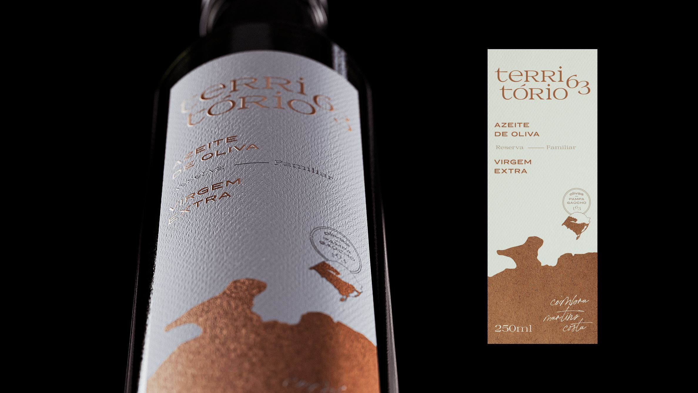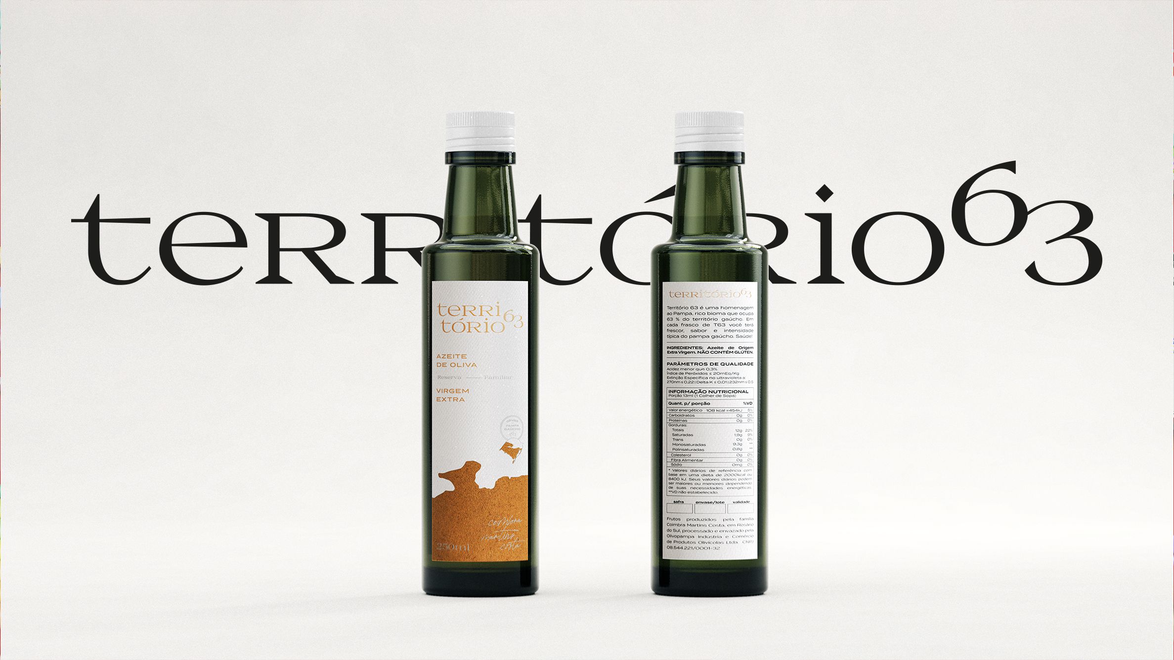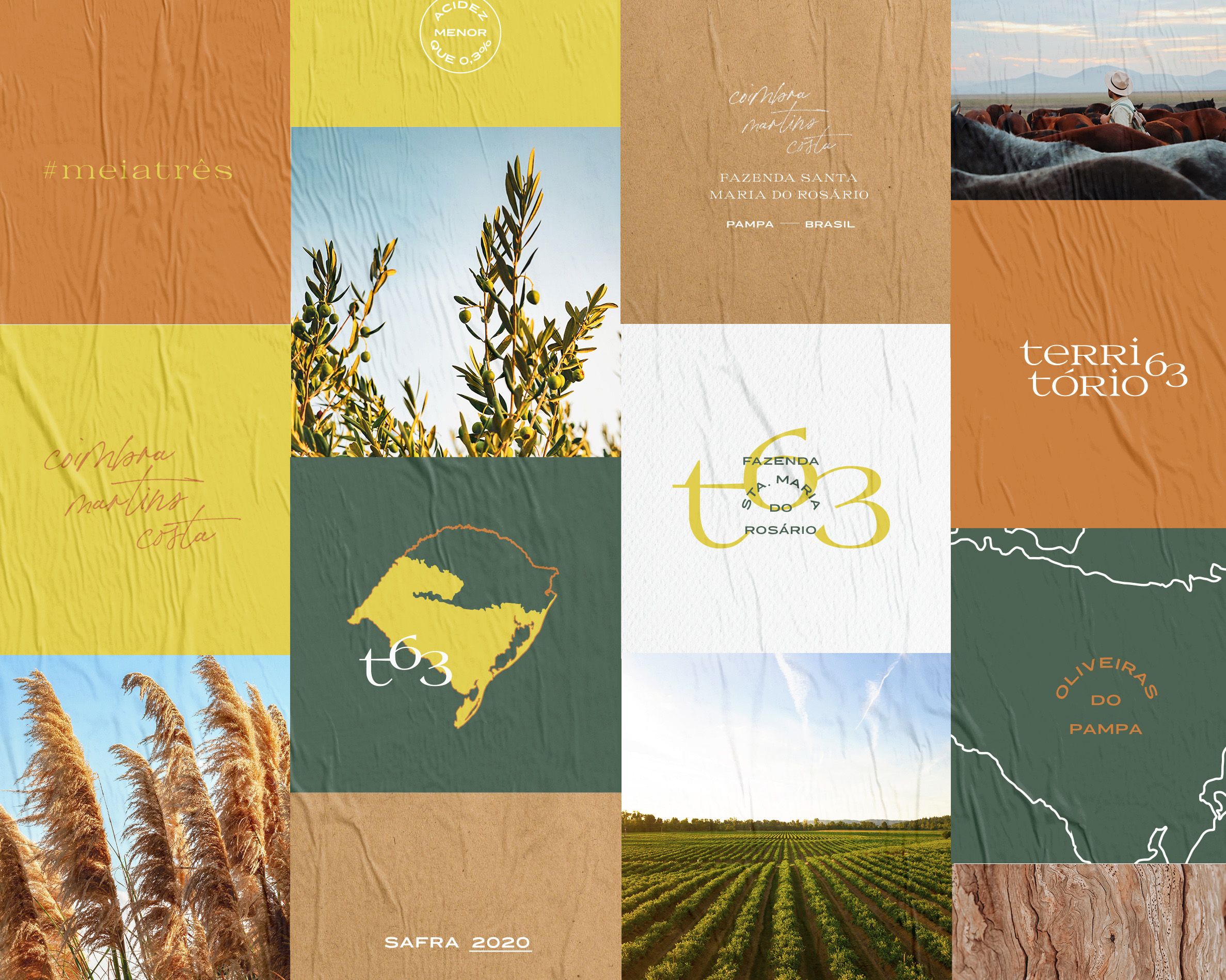 PT Território 63 é o Azeite Extra Virgem da estância familiar Coimbra Martins Costa, uma boutique de azeites que realiza o cultivo e seleção artesanal de olivas a fim de extrair um produto premium e singular, com o frescor, aroma e vitalidade do Pampa Brasileiro. Após uma reflexão sobre os objetivos do negócio, surgiu a necessidade de aprimorar a sua apresentação no mercado, transmitindo a história, tradição e produção dedicada, digna da reserva familiar.