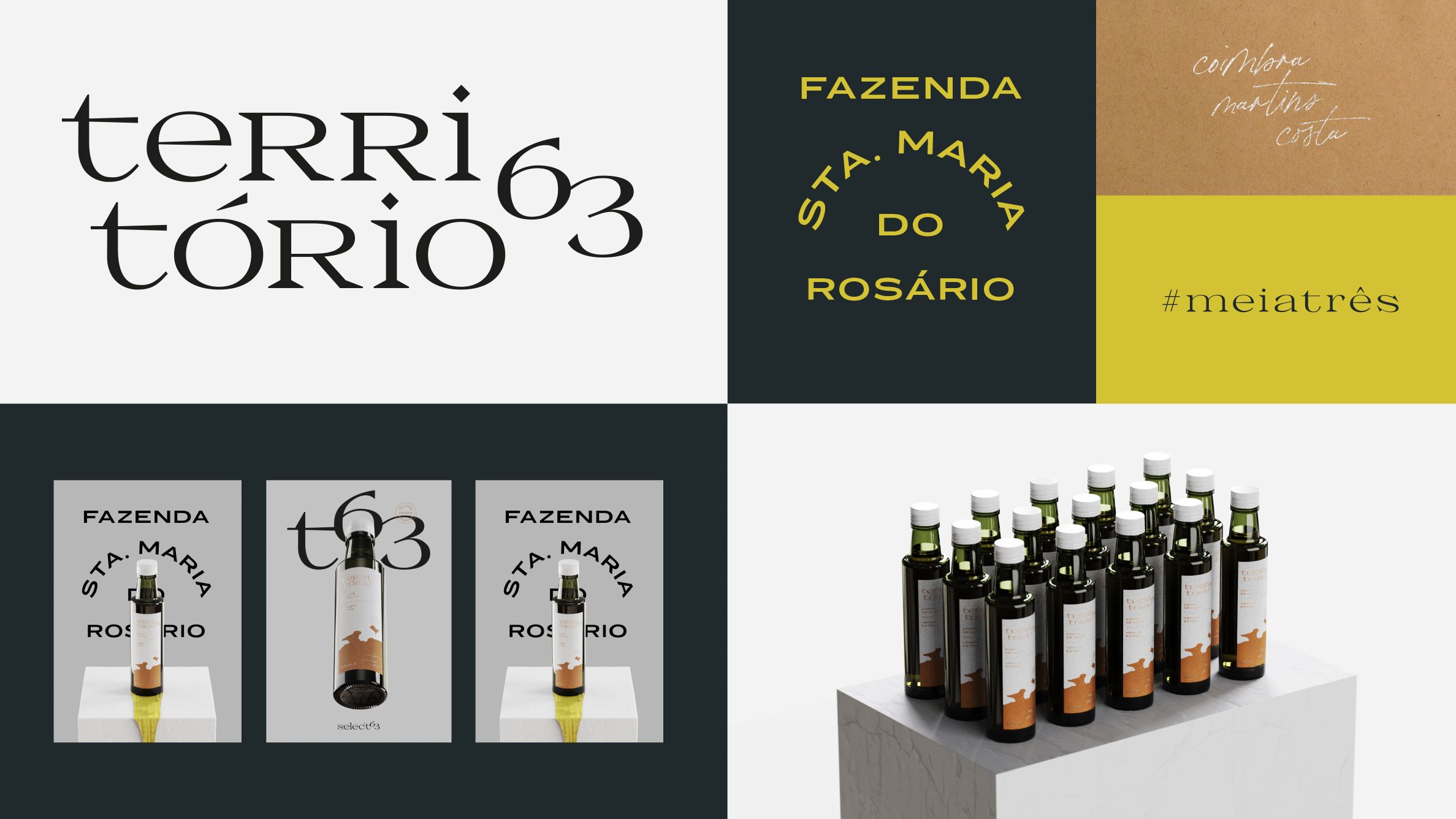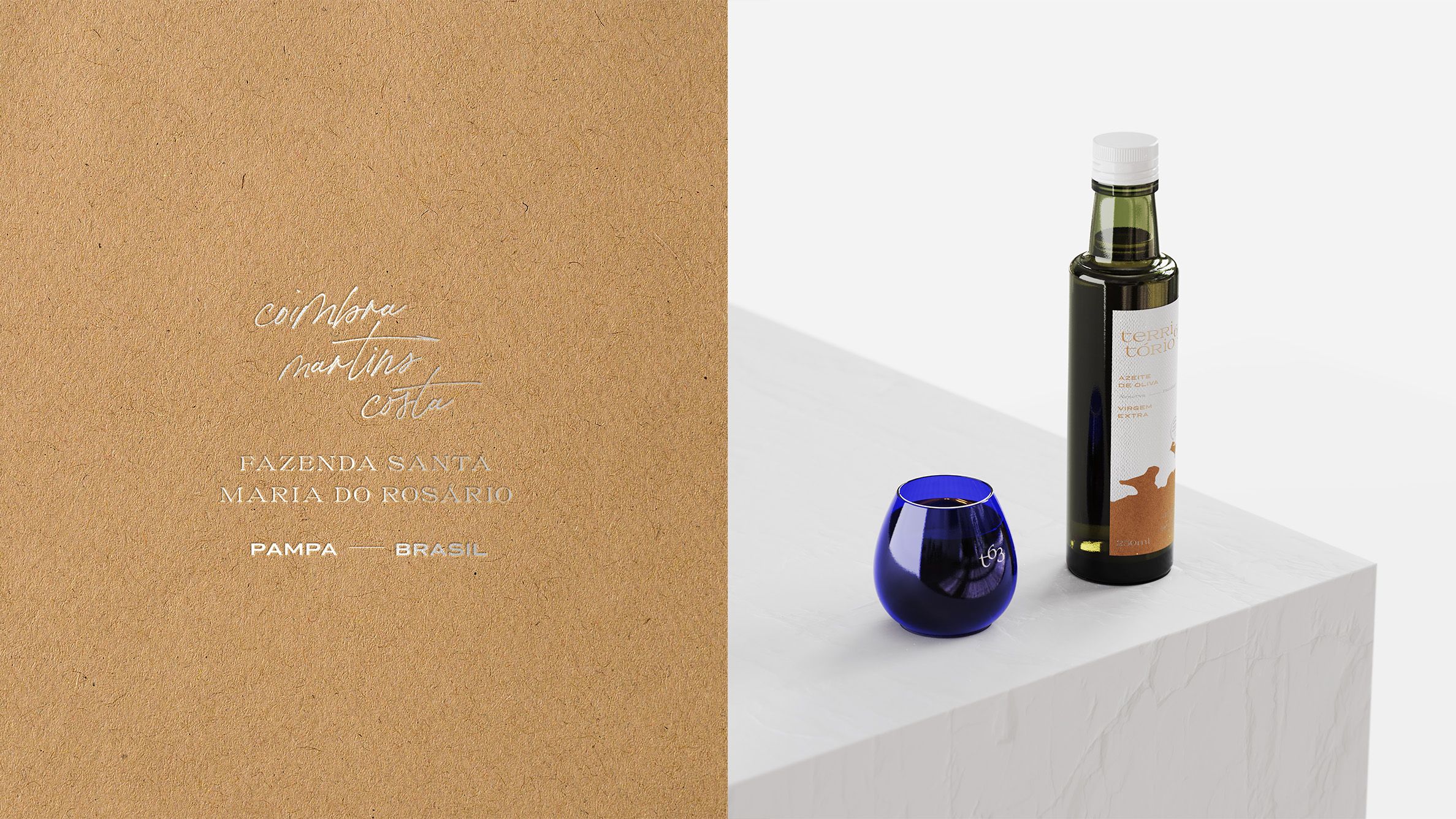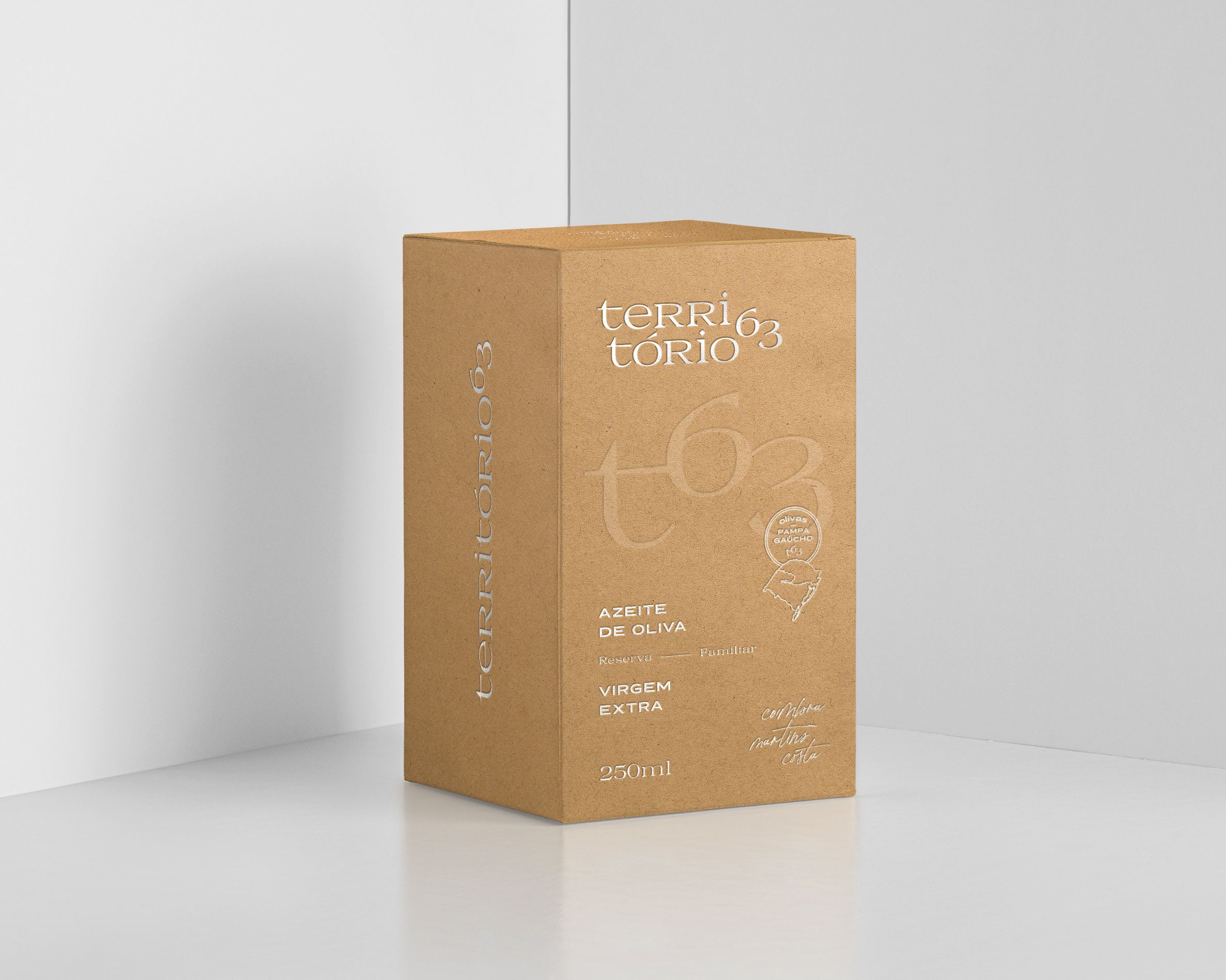 PT Território 63 é o Azeite Extra Virgem da estância familiar Coimbra Martins Costa, uma boutique de azeites que realiza o cultivo e seleção artesanal de olivas a fim de extrair um produto premium e singular, com o frescor, aroma e vitalidade do Pampa Brasileiro. Após uma reflexão sobre os objetivos do negócio, surgiu a necessidade de aprimorar a sua apresentação no mercado, transmitindo a história, tradição e produção dedicada, digna da reserva familiar.