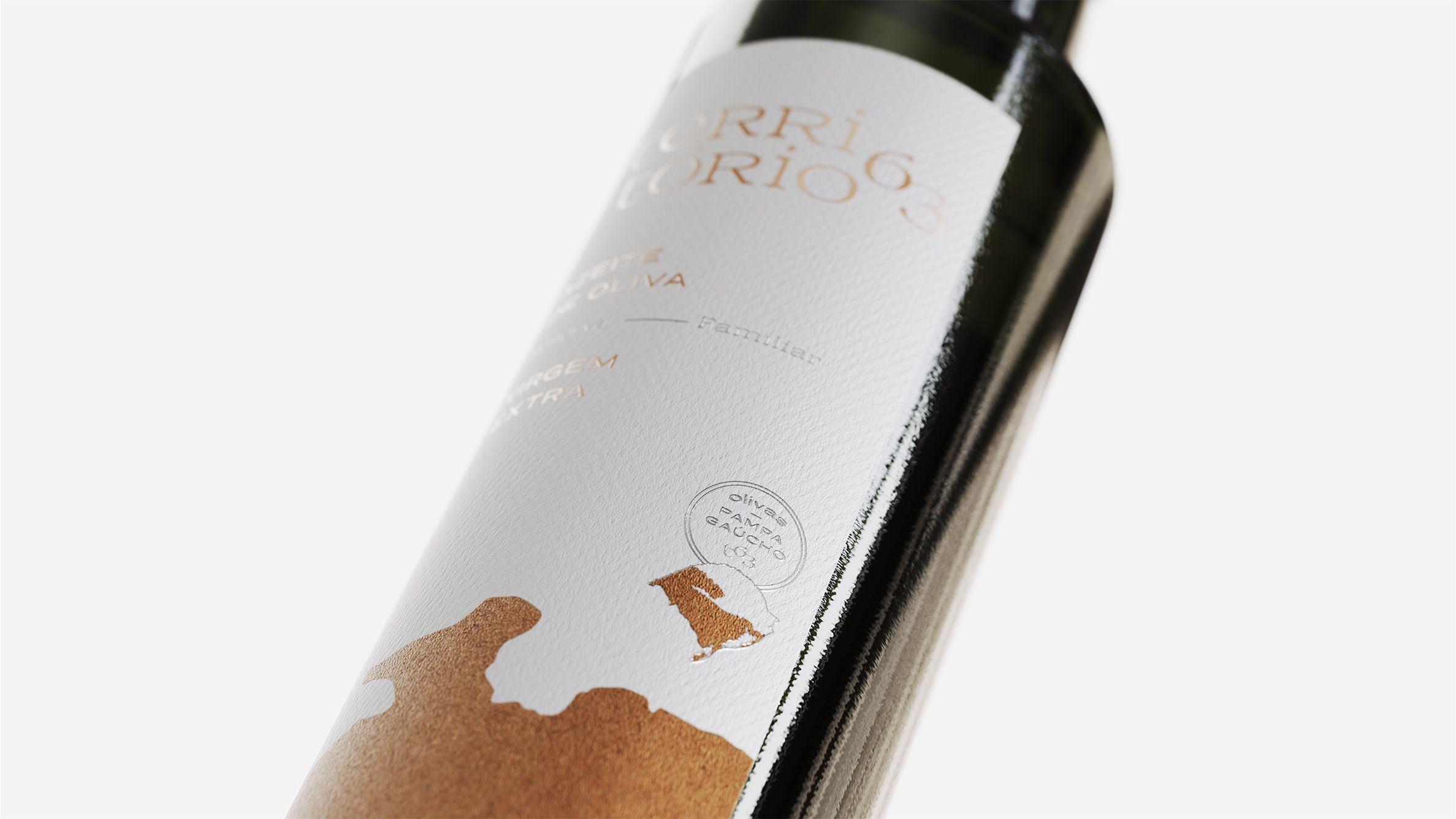 PT O projeto foi motivado pela necessidade do cliente de estabelecer uma apresentação visual à altura das propriedades ímpares do seu produto. Ao imergir no universo do cliente, ficou claro o quanto diferenciado é a produção da sua fórmula de azeite, que possui total controle sobre o termo Extra Virgem, certificando sua pureza em 10/10, ou seja, 100% sem falhas. O design da embalagem foca em uma abordagem minimalista e refinada, traduzindo traços do Pampa através da paleta de cores, texturas e o uso das linhas territoriais para composição gráfica. Dessa maneira, são transmitidos os atributos do produto e da marca, sustentados por um projeto gráfico que pode ser facilmente desdobrado em novos produtos no futuro.