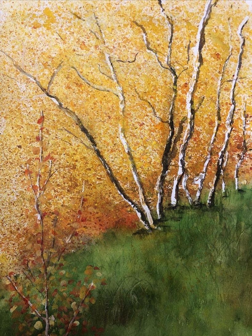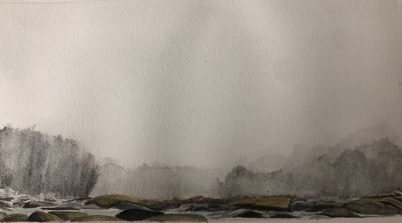 Still, I didn't quite have the courage to take one water, reflections, and gazillions of branches quite yet! So instead I did the first two images I've attached here. I really like how Surrounded by Gold (the first image) turned out. The trunks are perhaps a bit crude, but I enjoy the texture of the leaves and feel like this is a successful piece. The second one is a different story. I worked hard to find the layers and to give a sense of the heaviness of the weather and the distance of each layer of landscape. I'm not satisfied with how the trees turned out. I'd love to increase my skill - any ideas how to do that? I'm relatively pleased with the rocks. The grey is made from mixing colors, not a black/white grey. I'm wondering if I should have applied layers of color to make the grey so it would be more interesting. I'd welcome your input.