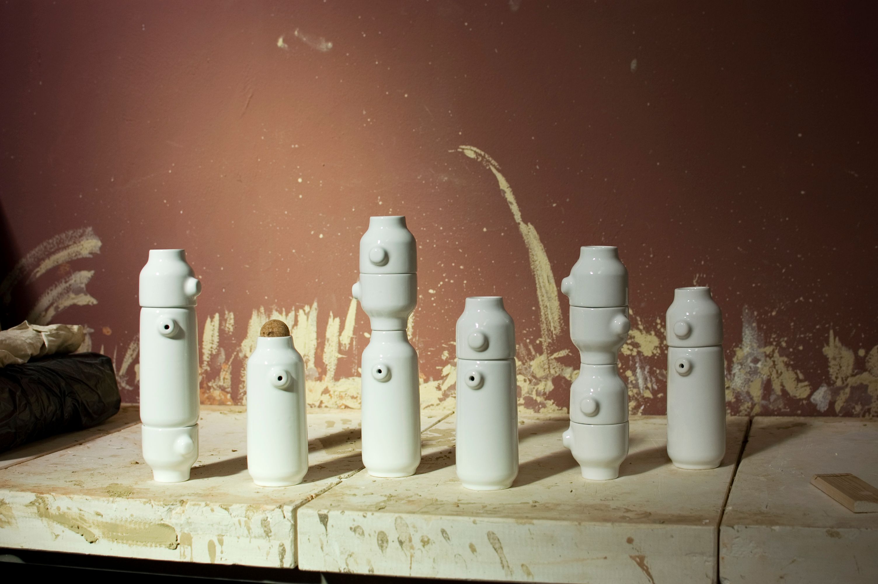 BOIBO, es un Set funcional y decorativo que nace de la unión del concepto BOtella Y BOtijo. Mezcla la virtud decorativa que ha tomado el botijo y el aspecto funcional de una botella. De ahí que BOIBO no solo es un recipiente contenedor de líquido si no que pudiera modularse para convertirse en una pieza meramente decorativa. Ideada para ser una pieza práctica en nuestras casas, es perfecta para contener líquidos: vino, sake, agua, aceite, orujo… usándose a modo de aceitera, botijo, licorera…posee una abertura superior que está diseñada para facilitar la entrada de líquidos al recipiente. La modularidad de las piezas permite crear composiciones personales a la hora de su almacenaje, piezas que invitan al usuario a crear un mundo fantástico, acercándose a una función meramente decorativa. Una cerámica funcional, minimalista y emotiva donde sugiere la participación del usuario. Surco , es una pequeña productora que nace con una idea fundamental, materializar objetos, interesada en explorar en cualquier tema dentro de la amplia disciplina del diseño. Siempre con especial cuidado en atender valores como la necesidad, honestidad, cariño, emoción y trabajo.