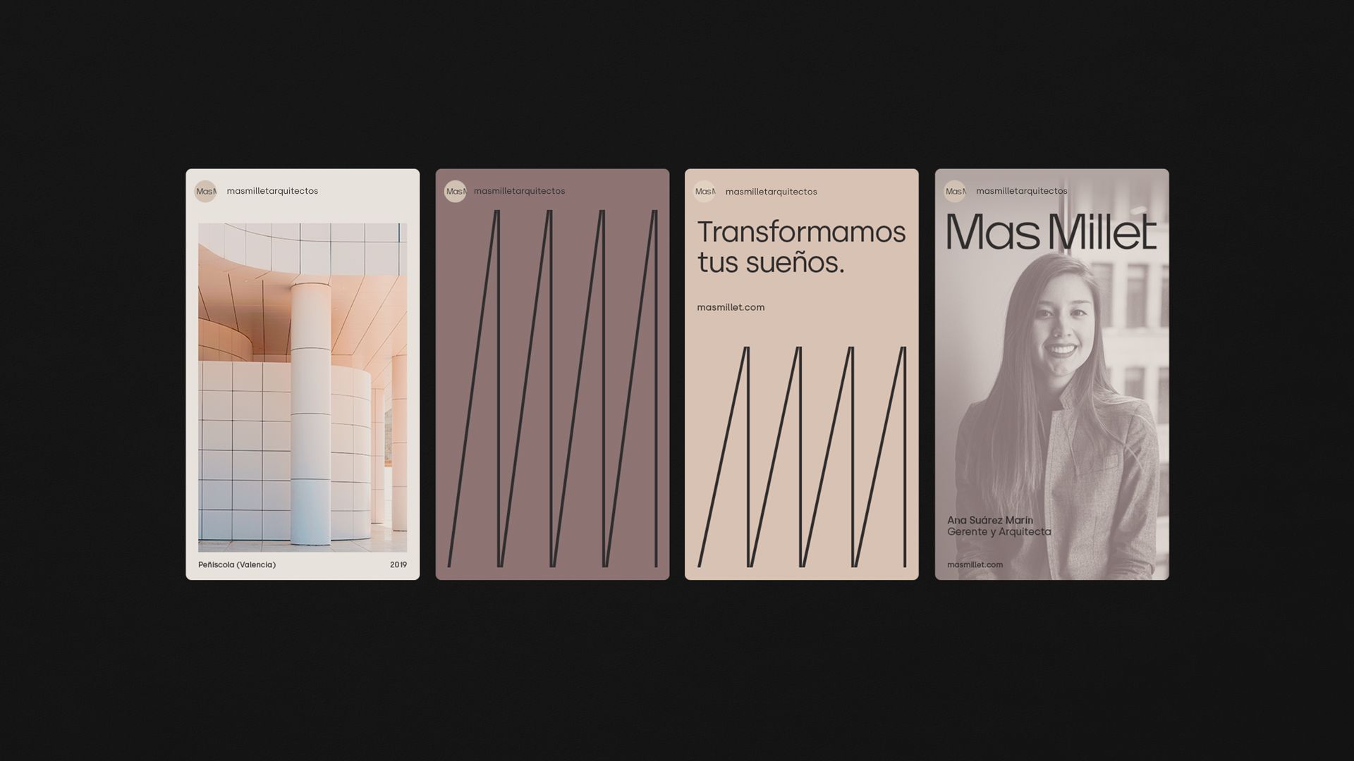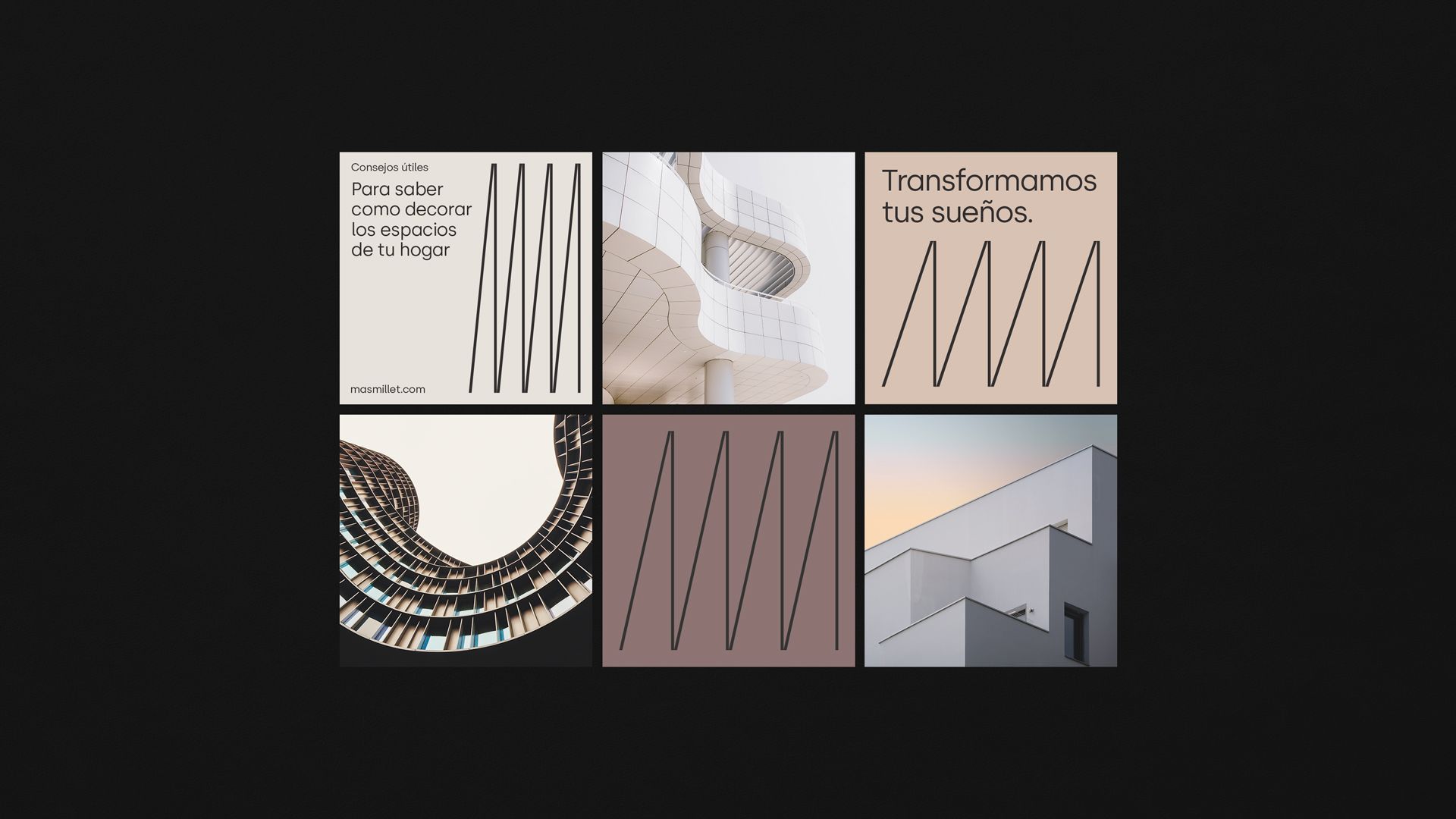 La propuesta conceptual de Mas Millet consiste en destacar la importancia de la arquitectura y el interiorismo, y su capacidad de adaptarse de manera versátil y eficaz a diferentes espacios y proyectos. El enfoque se centra en las iniciales del nombre del estudio, Mas Millet, que coinciden en la letra “M”, para representar de manera gráfica las dos disciplinas del estudio. A partir de estas letras, se busca transmitir la idea de adaptabilidad a cualquier tipo de entorno, mediante la adaptación de estas letras a diversos espacios. . Esto no solo refleja los valores y la personalidad de la empresa, sino que también crea una identidad visual versátil y representativa.