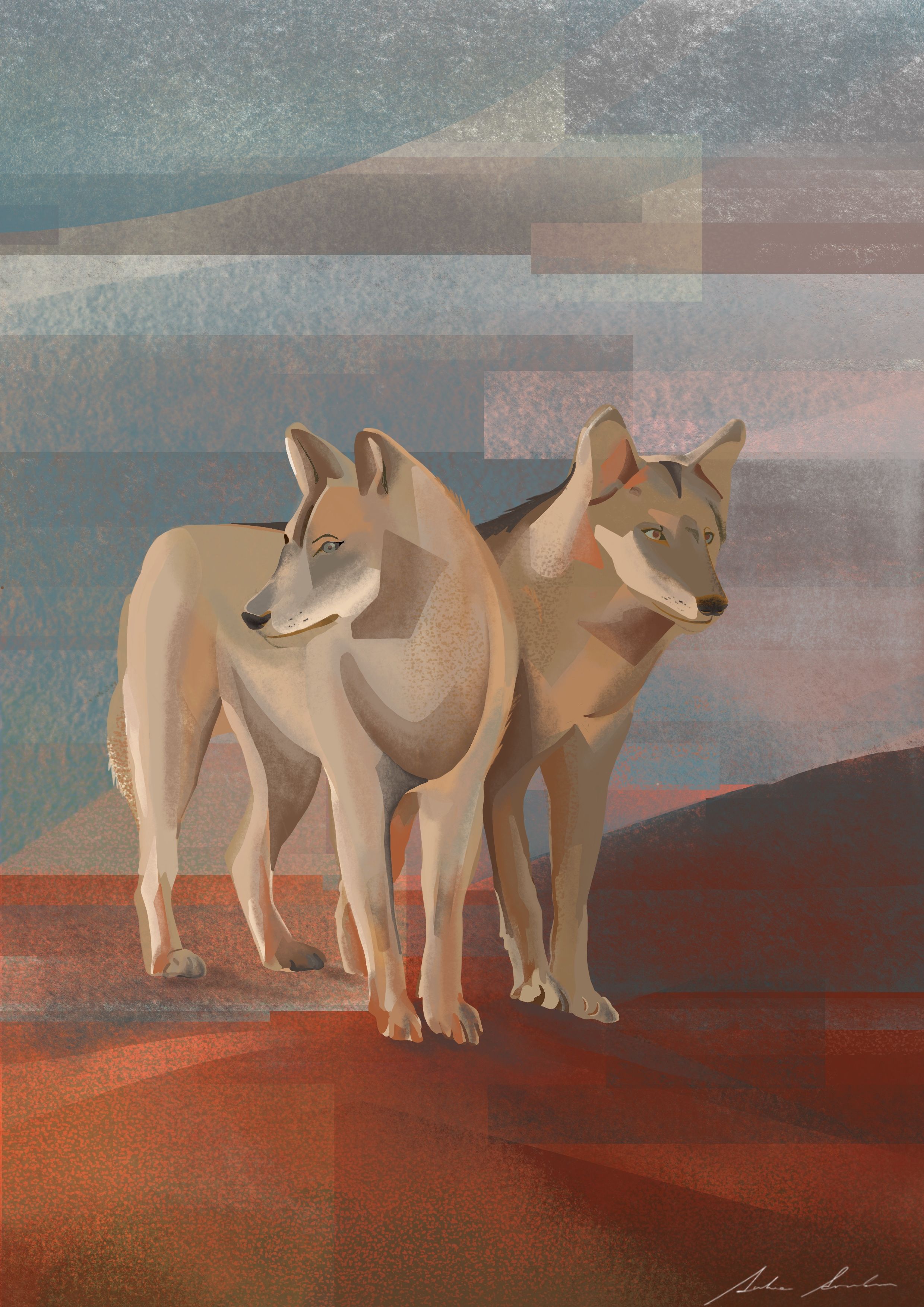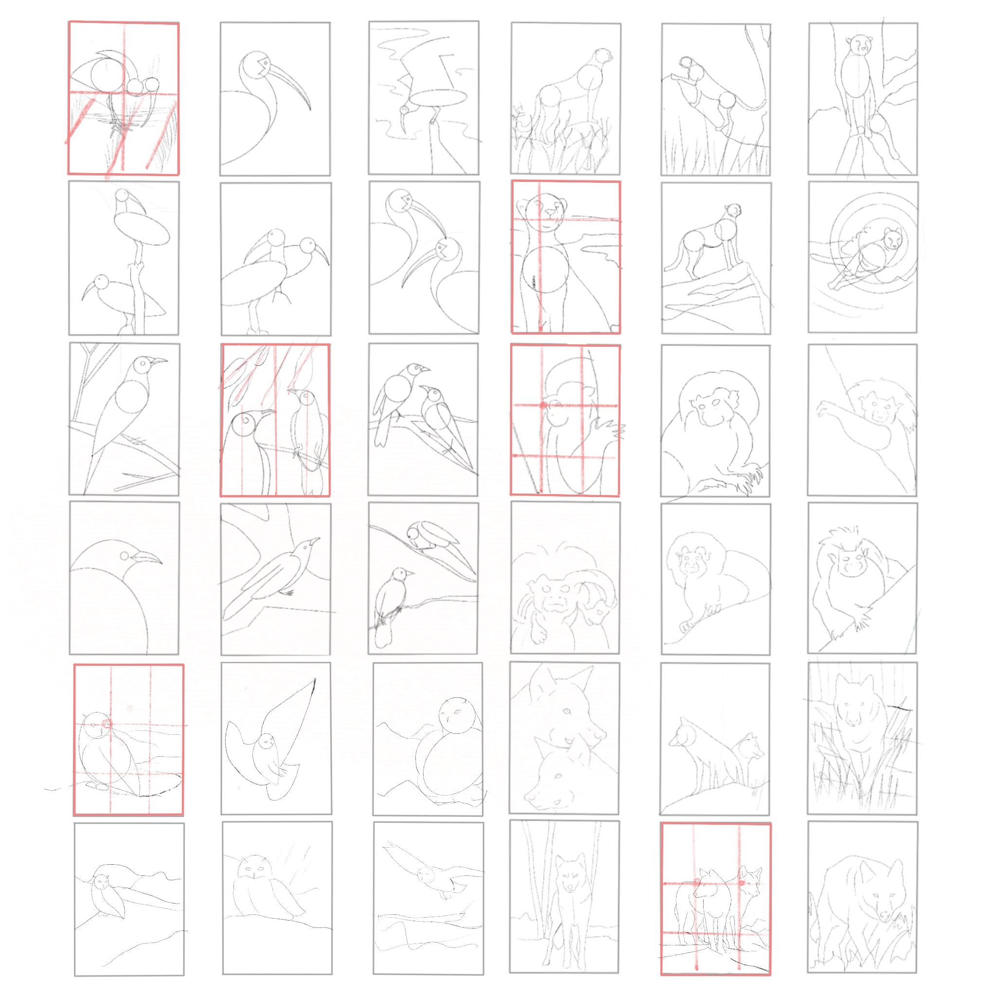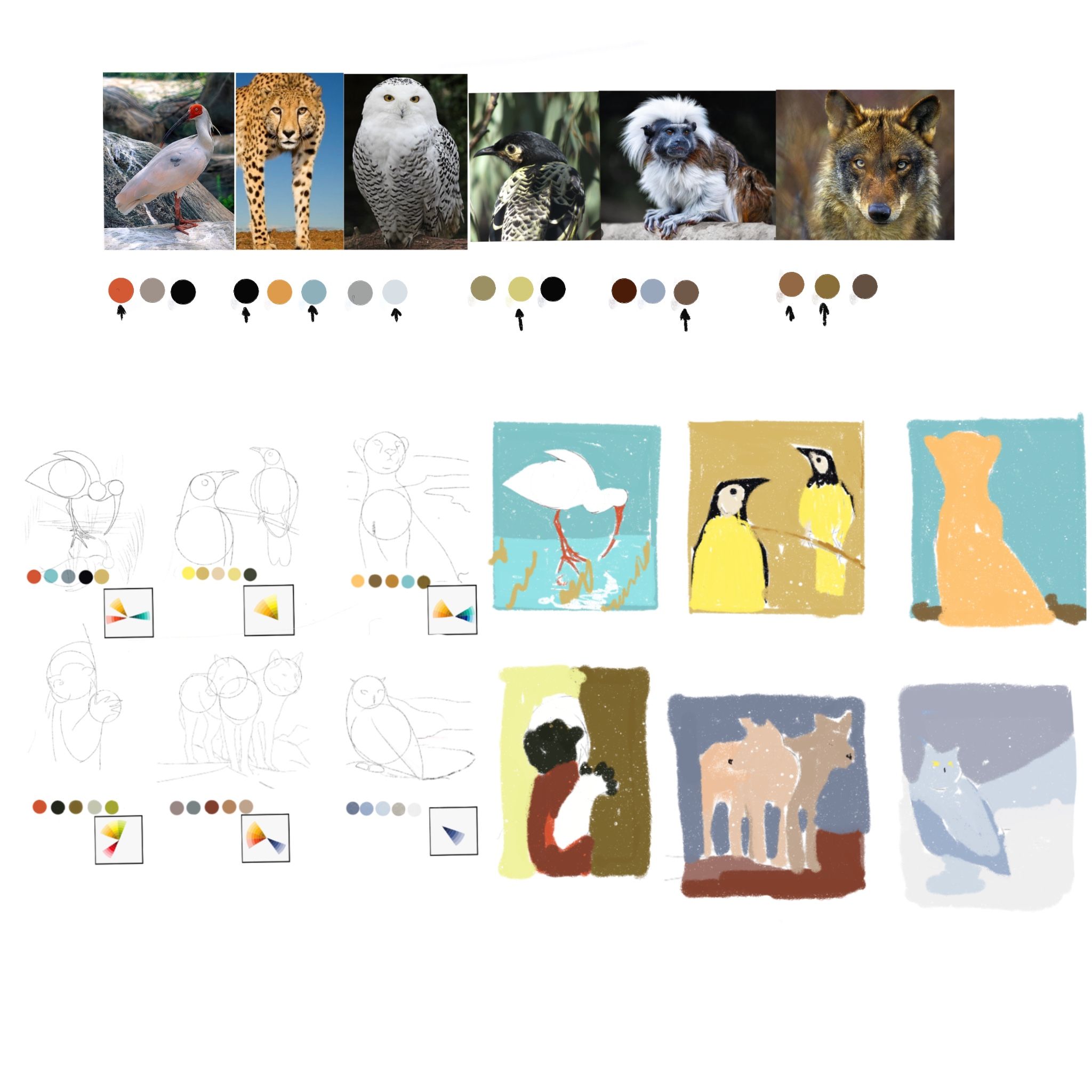 Empecé estudiando algunos animales como referencia visual y trabajé la composición probando diferentes miniaturas. Para poder mantener un estilo consistente en todas las imágenes utilice una paleta de colores en común, finalmente termine con el color y las texturas.
