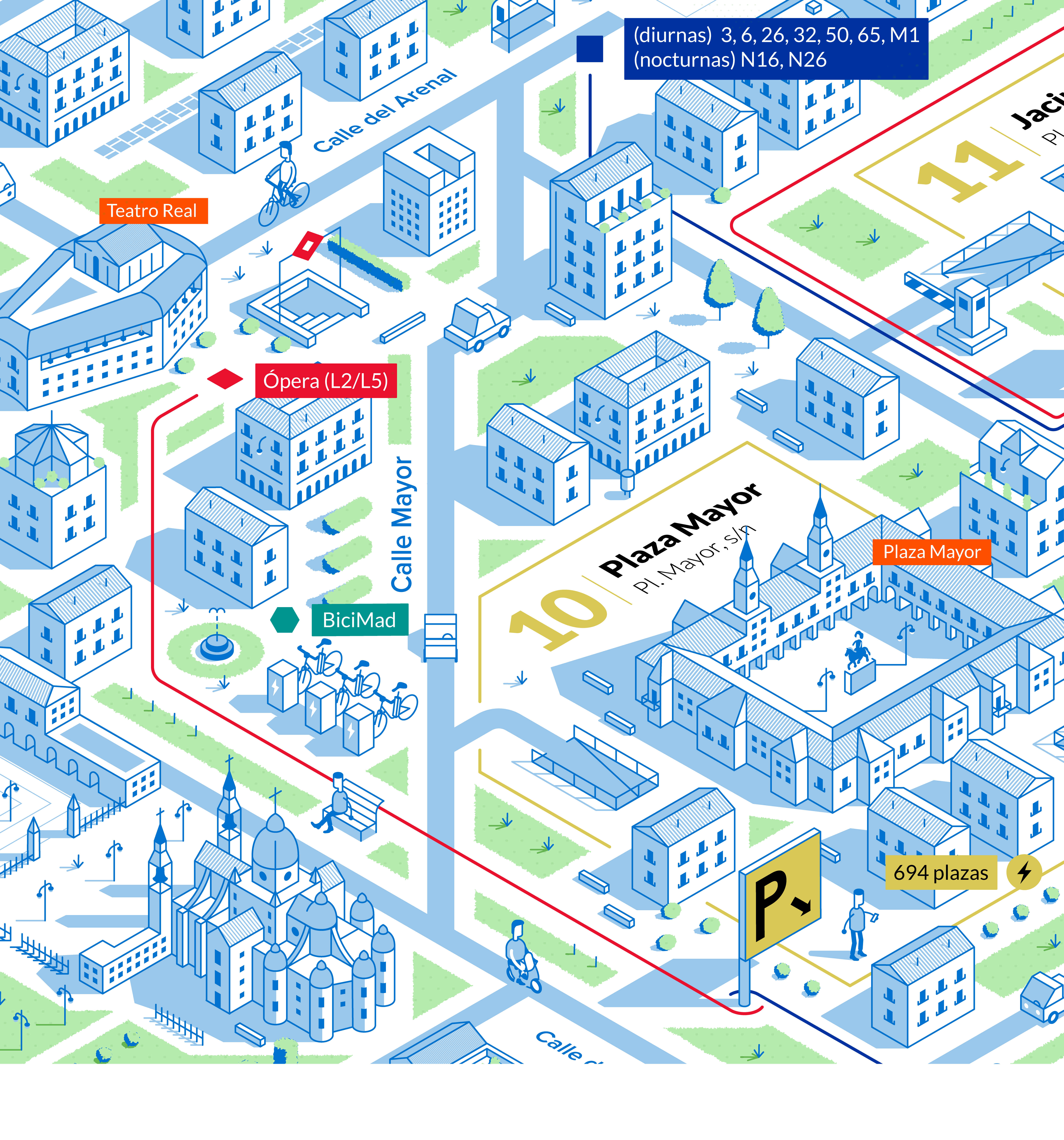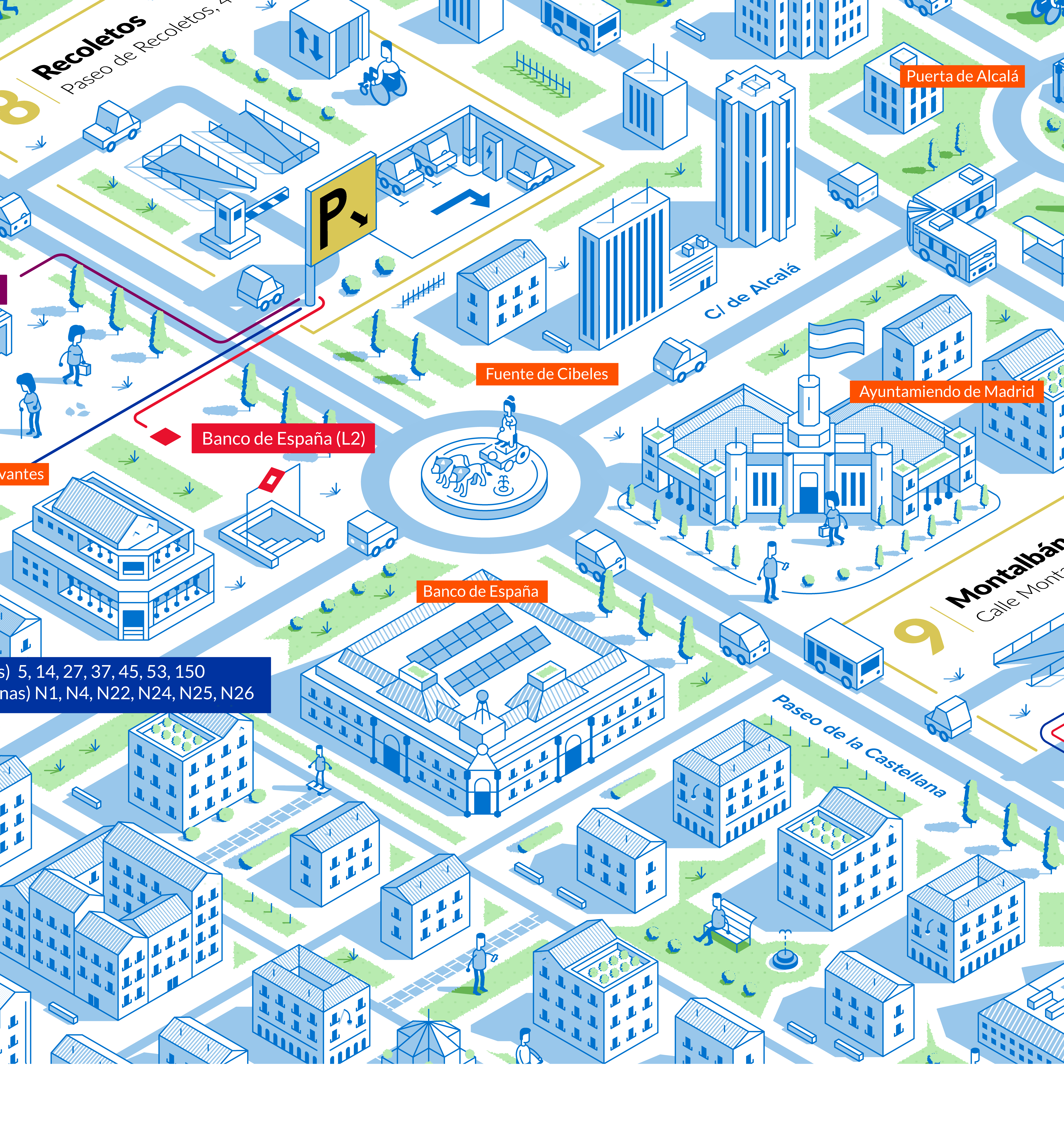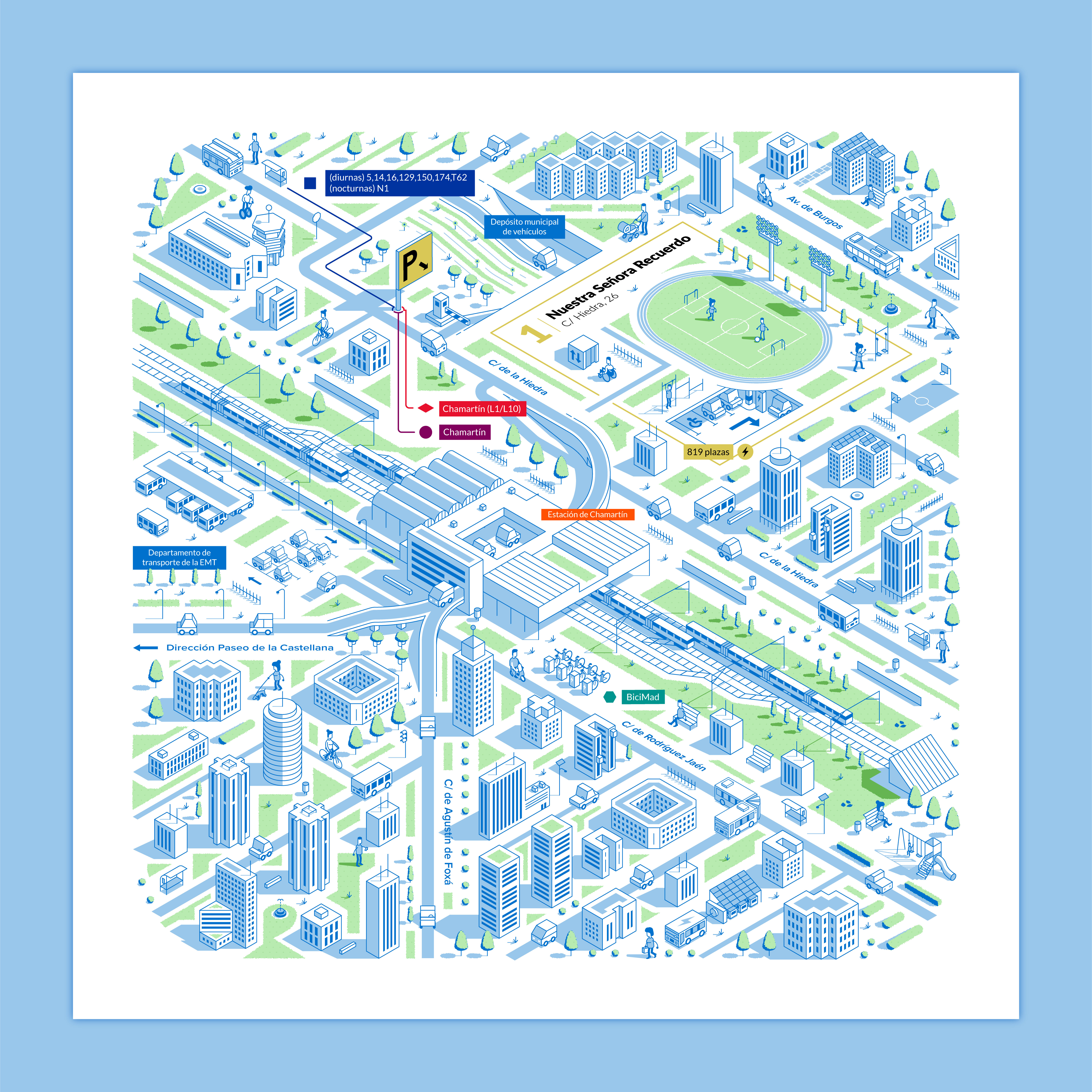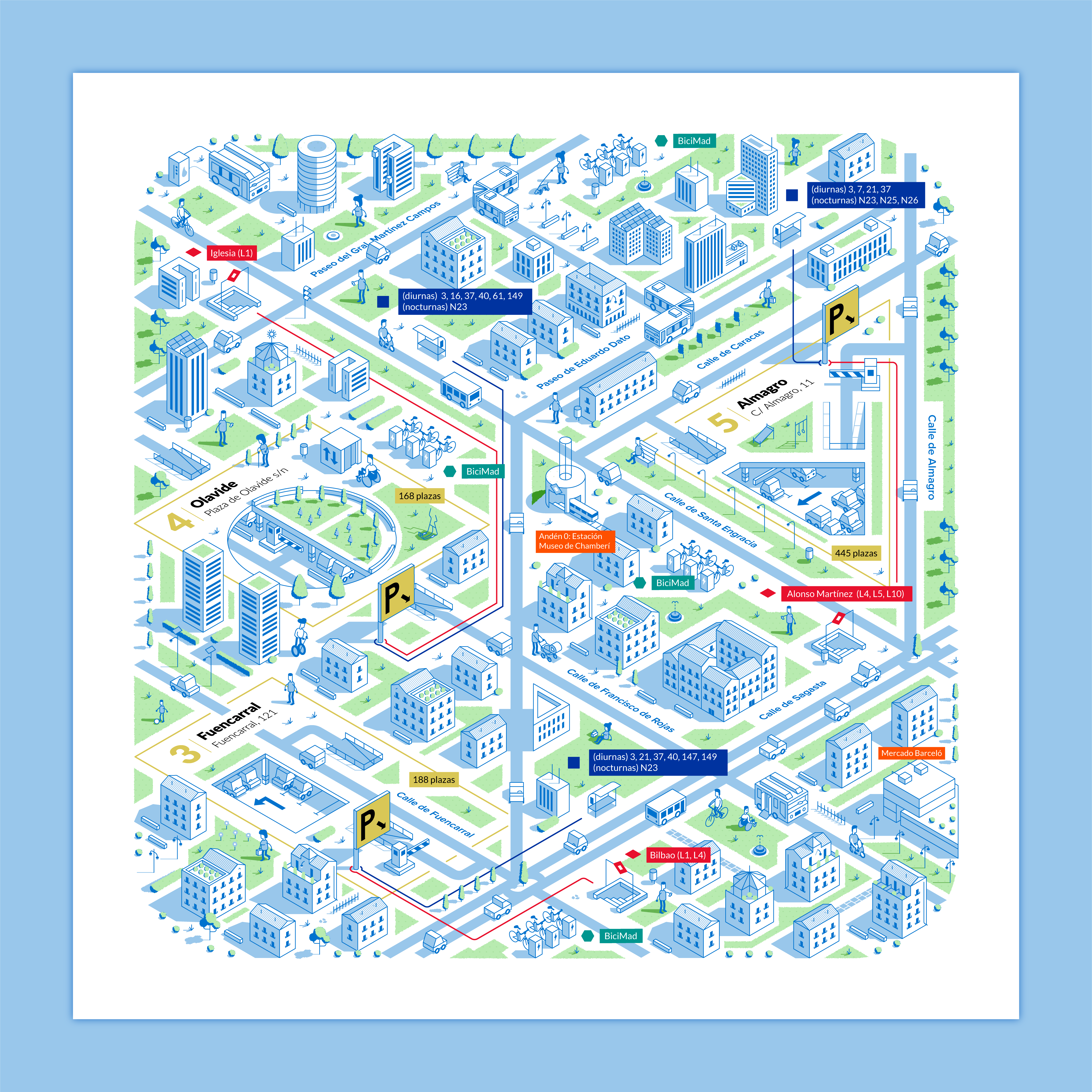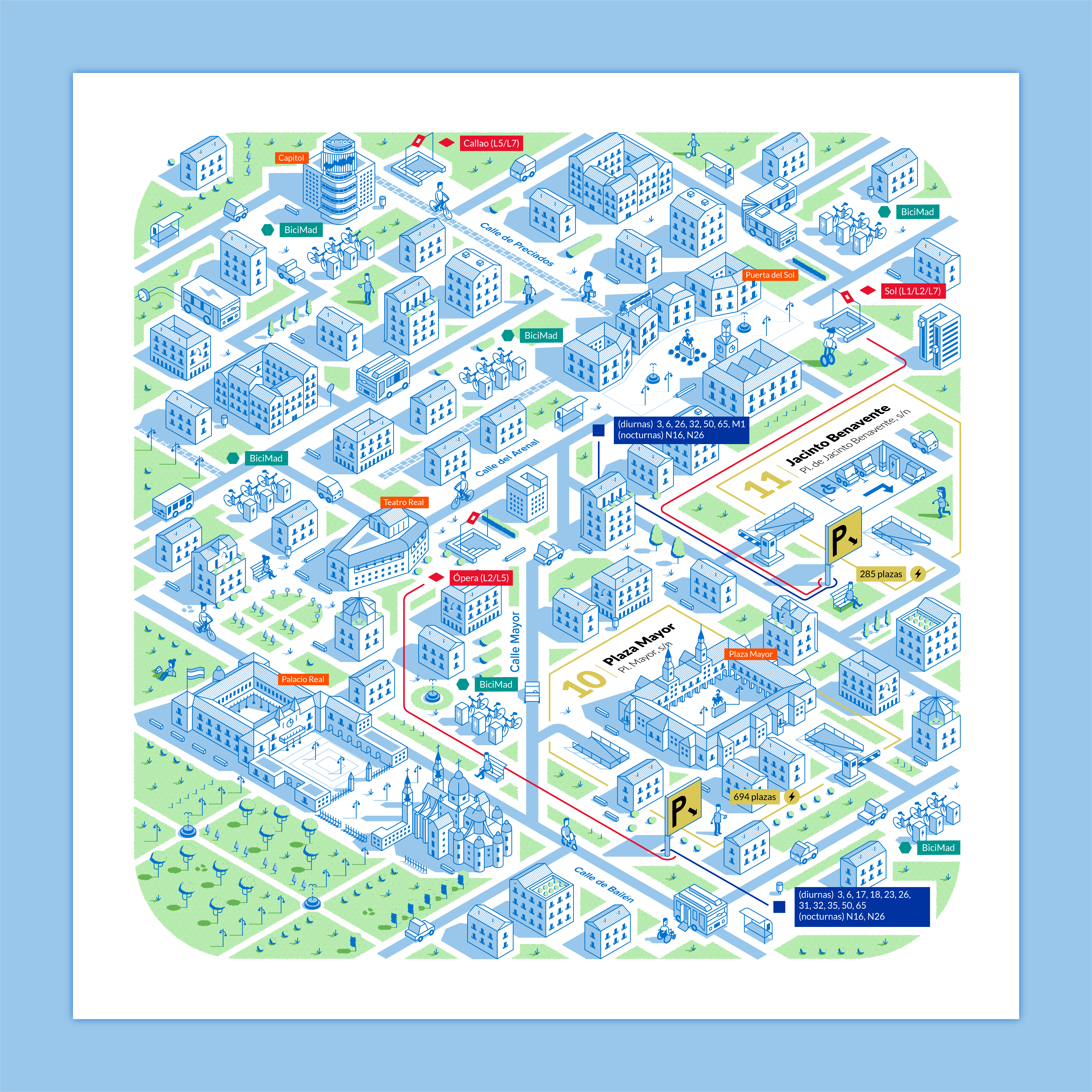 Nuestro objetivo era representar visualmente las conexiones de movilidad que ofrecen los aparcamientos de la EMT desde una perspectiva isométrica, mostrando las calles y edificios más emblemáticos de la zona.