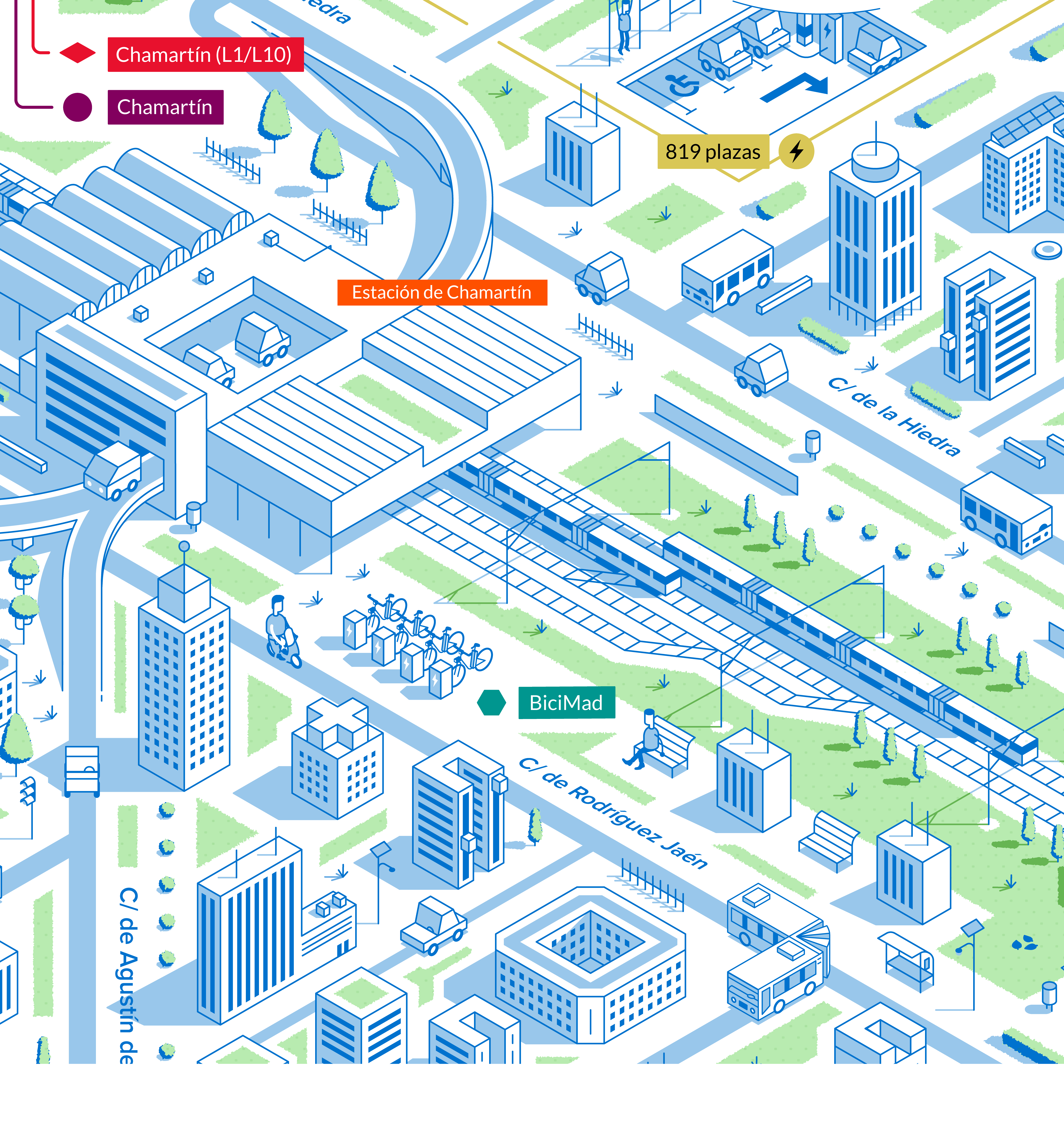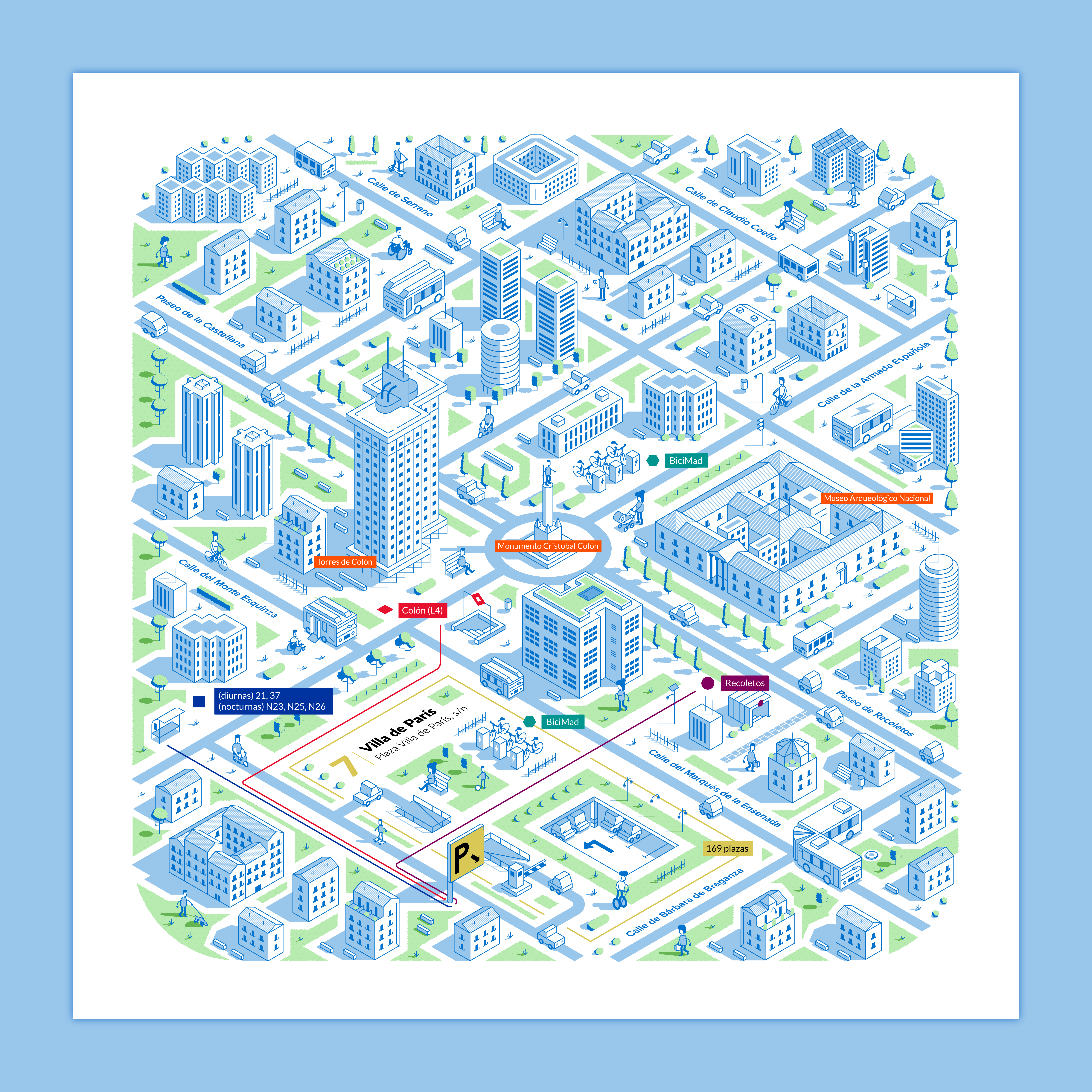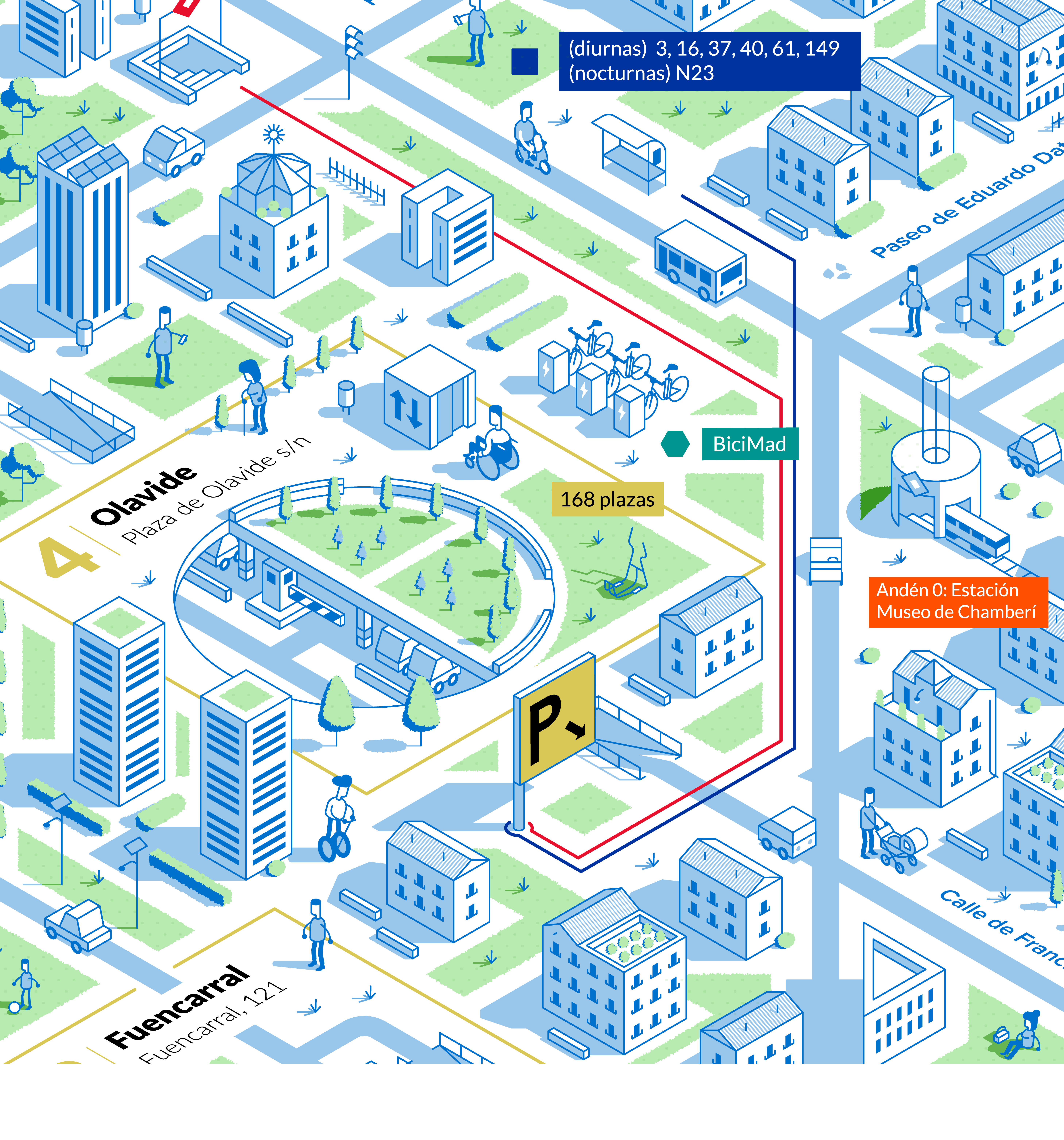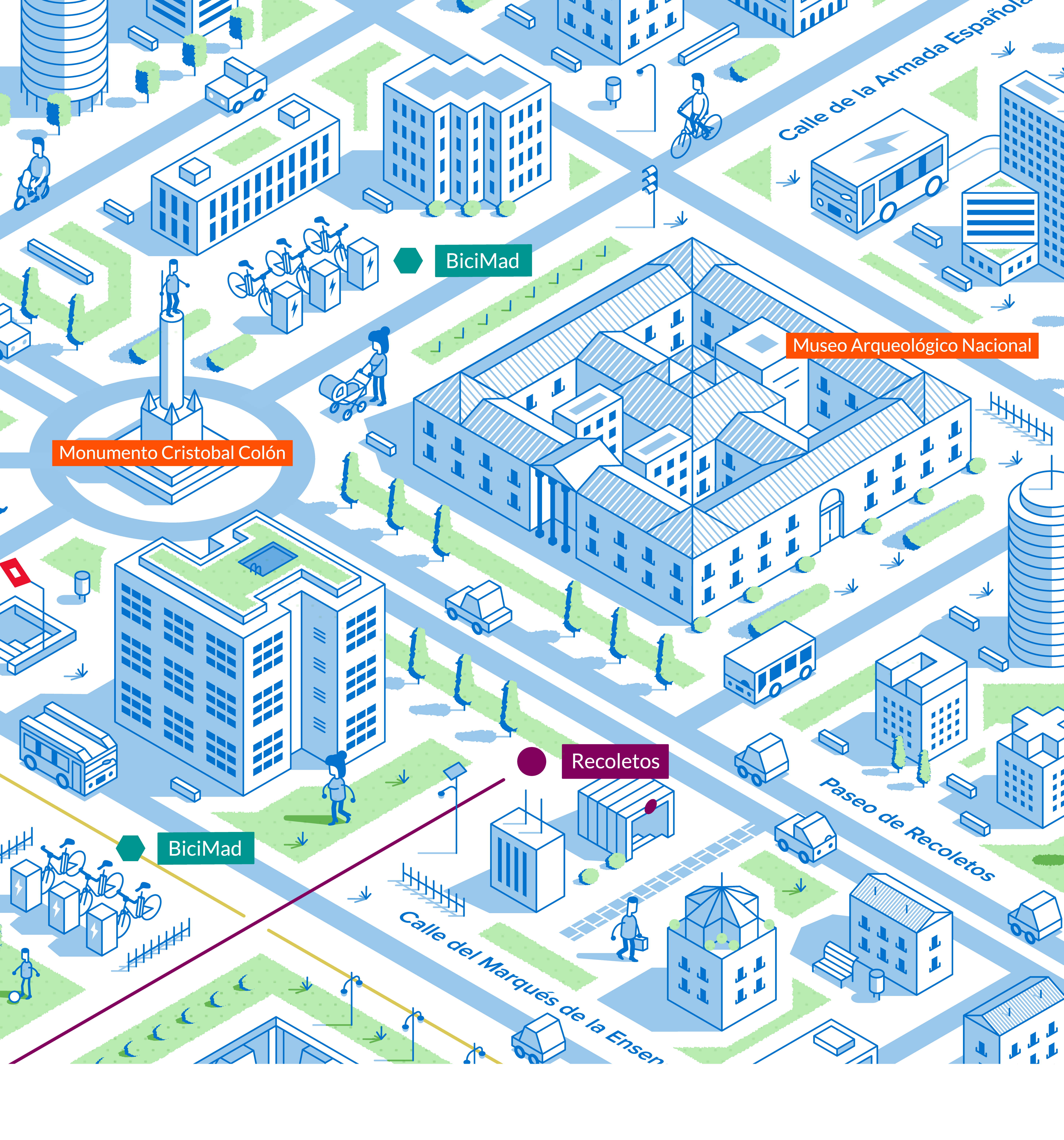 Nuestro objetivo era representar visualmente las conexiones de movilidad que ofrecen los aparcamientos de la EMT desde una perspectiva isométrica, mostrando las calles y edificios más emblemáticos de la zona.