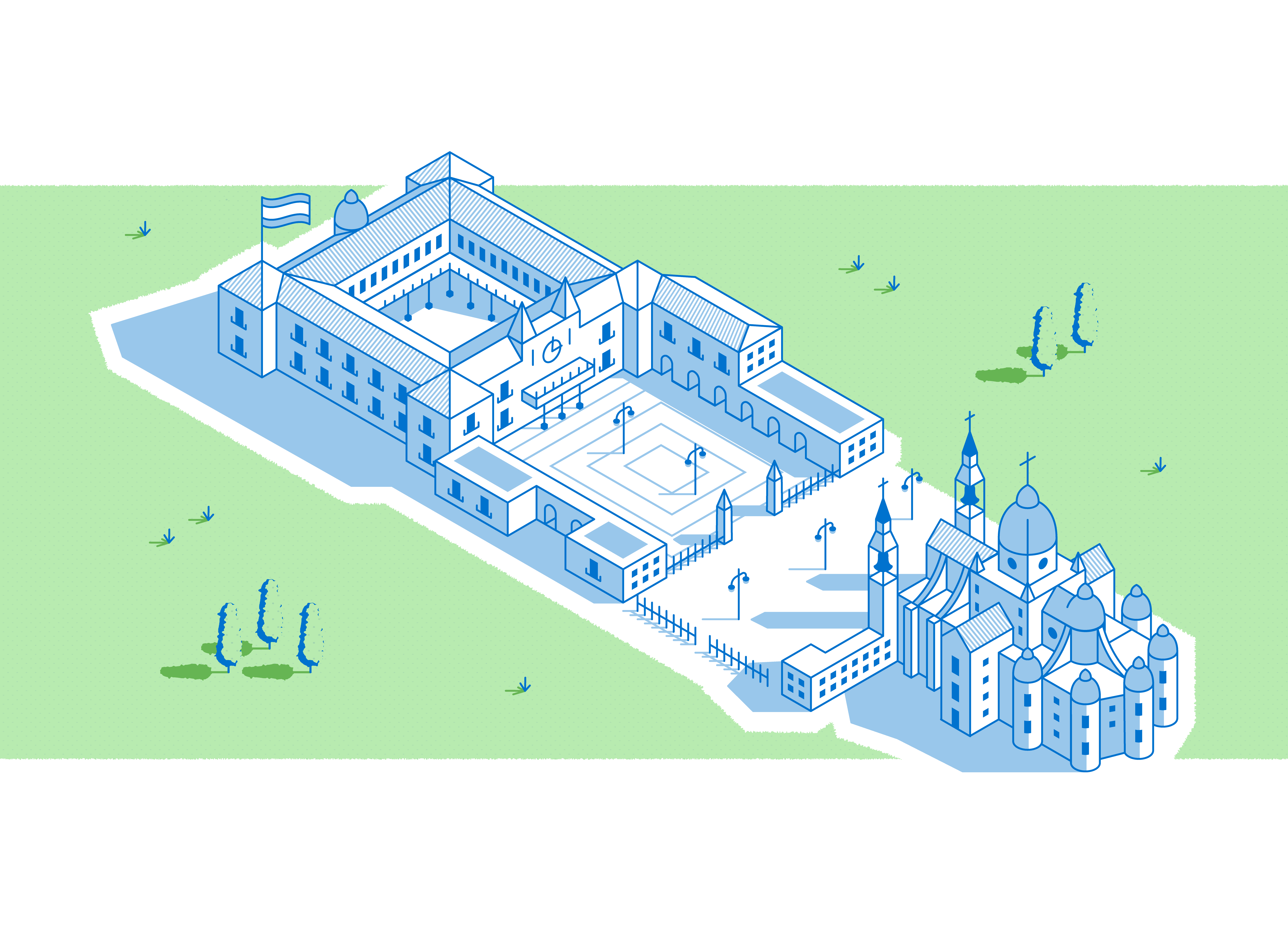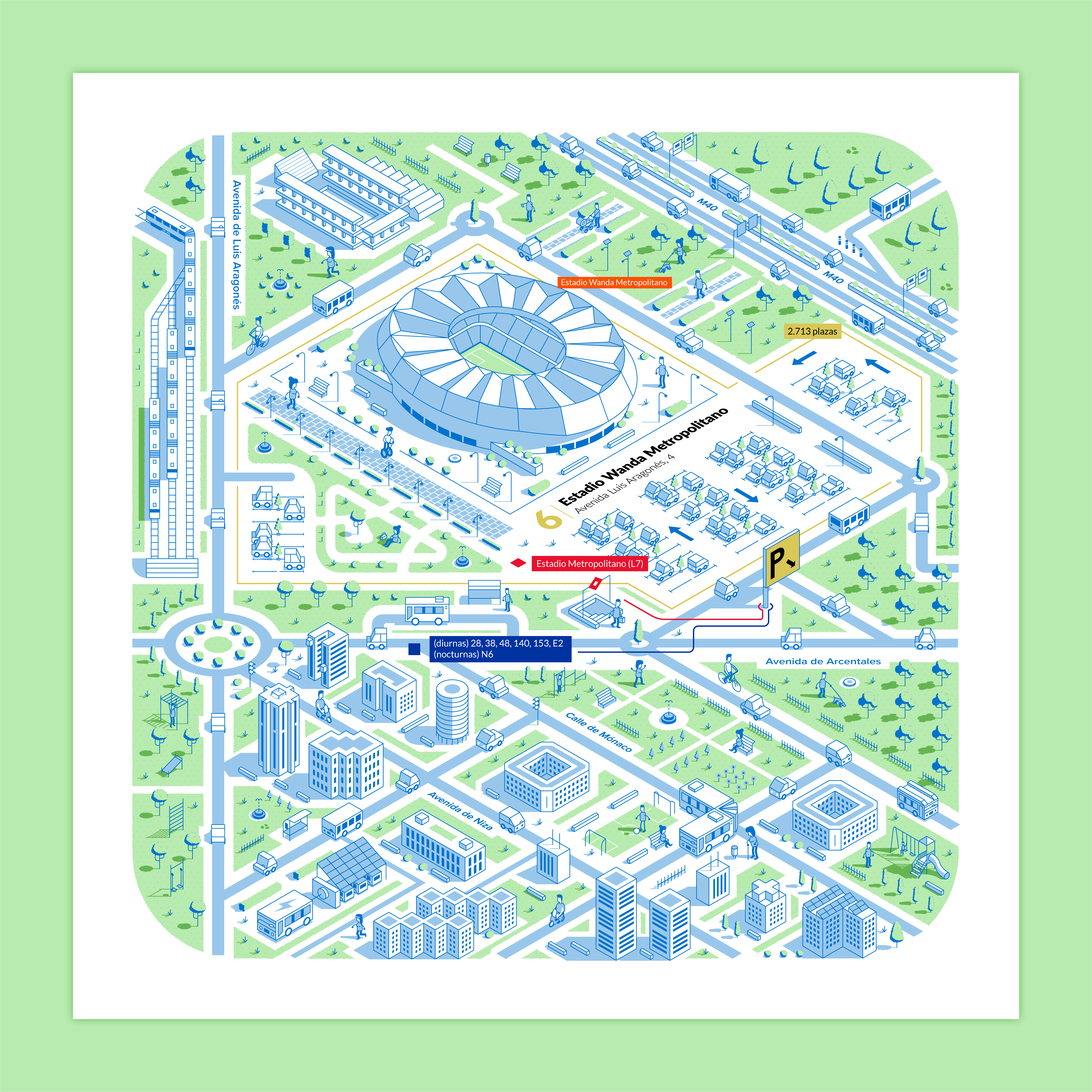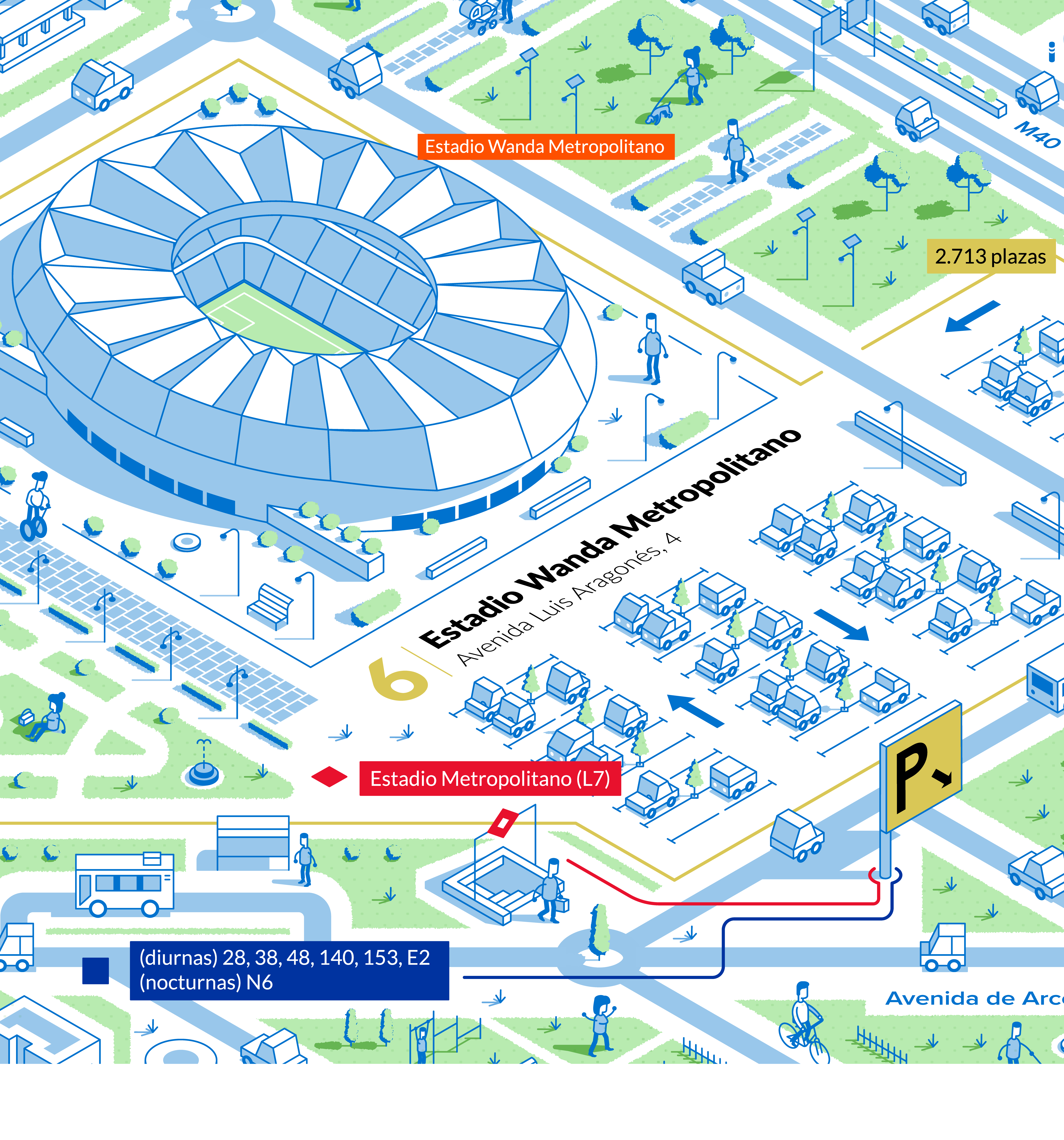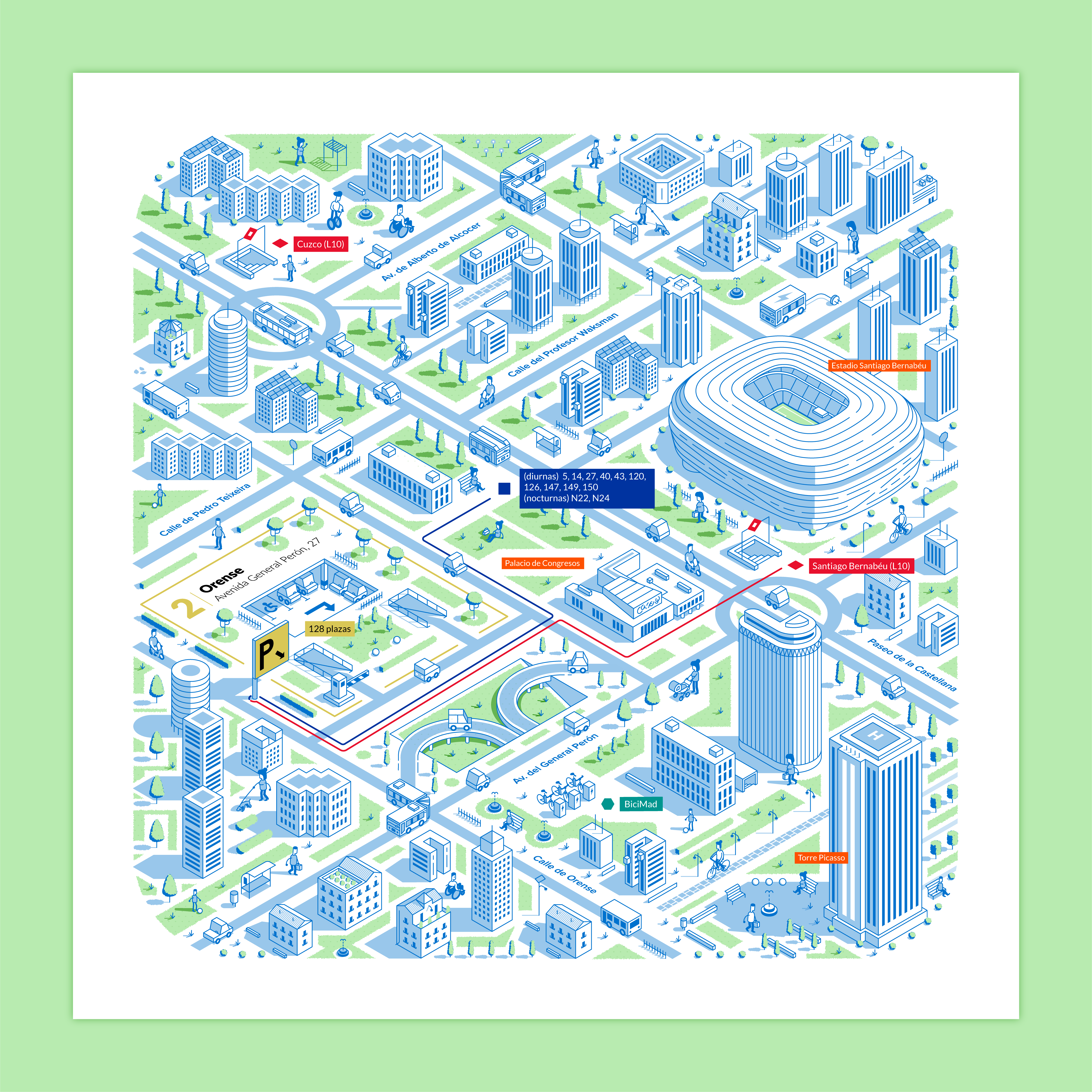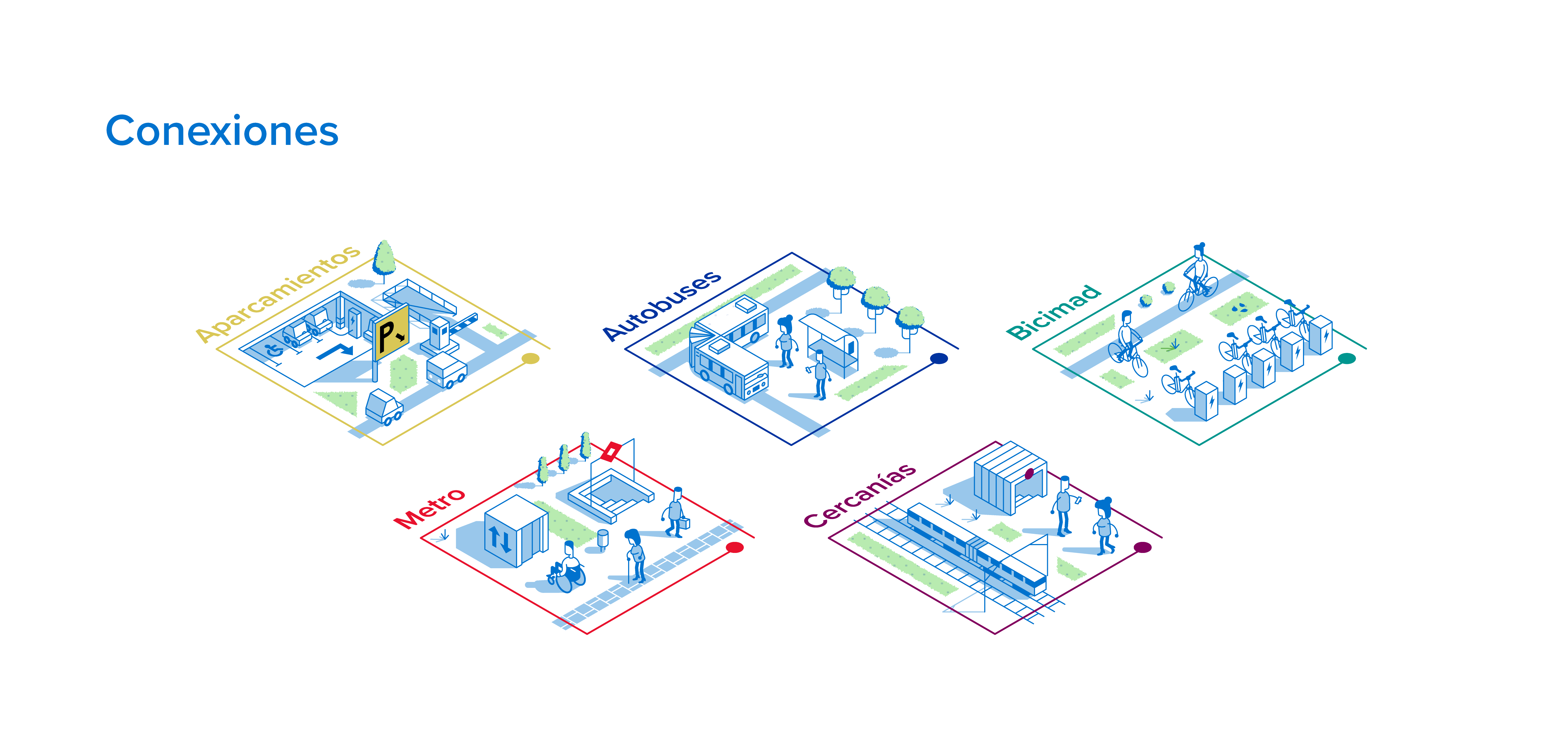 Nuestro objetivo era representar visualmente las conexiones de movilidad que ofrecen los aparcamientos de la EMT desde una perspectiva isométrica, mostrando las calles y edificios más emblemáticos de la zona.
