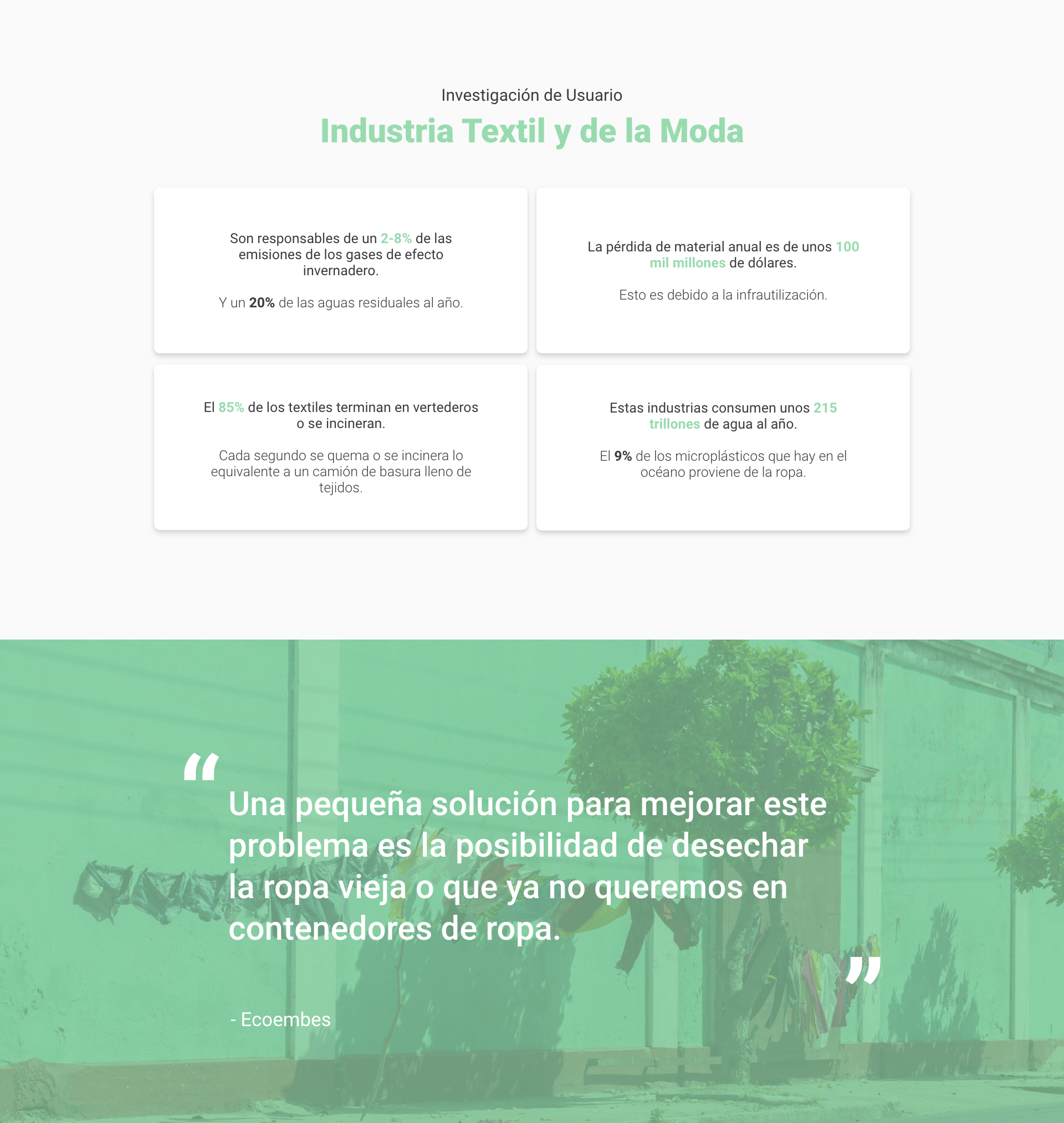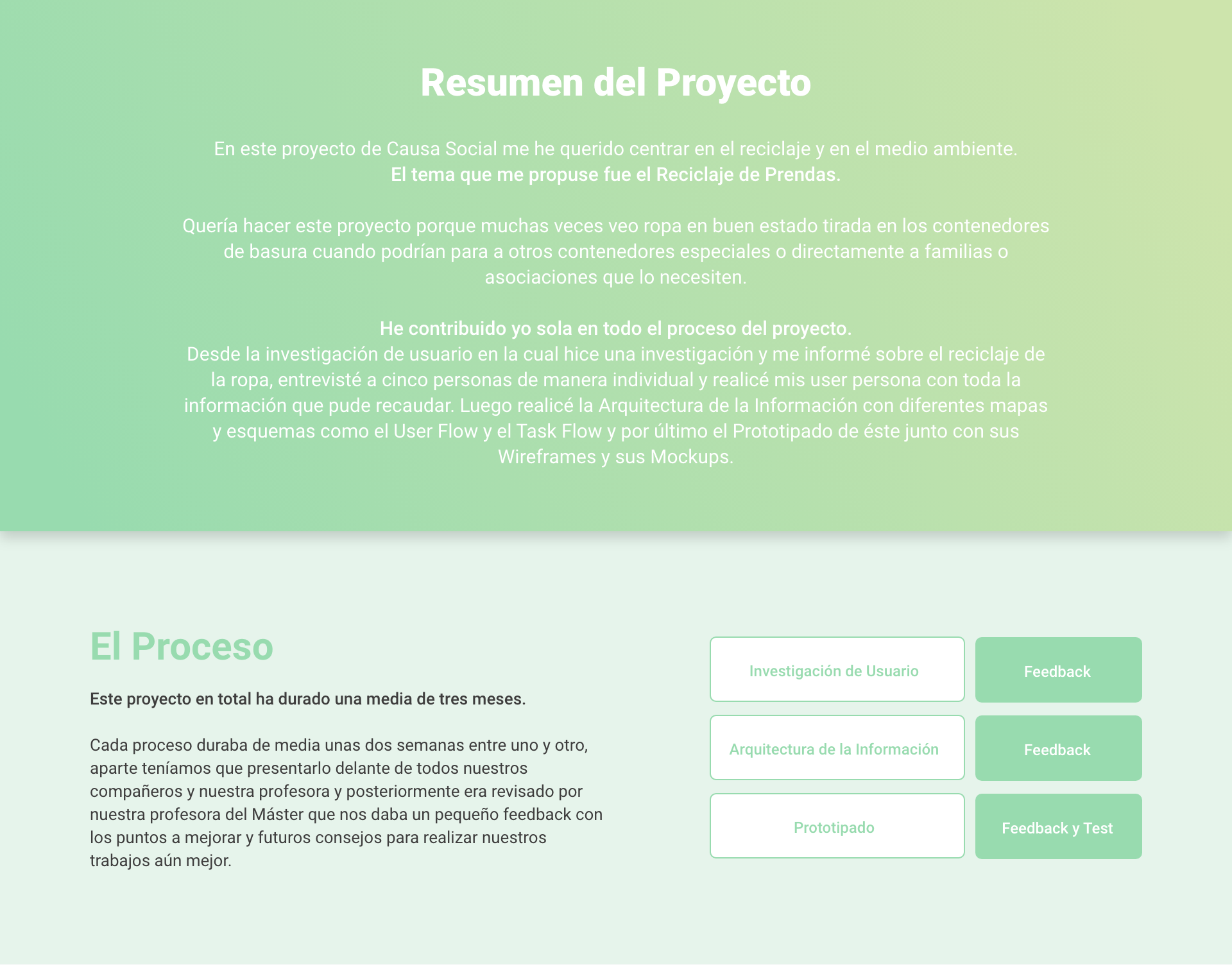 Este es un Proyecto de Causa Social sobre el Reciclaje de Prendas de Vestir que hice el año pasado como uno de mis Proyectos de Clase en el Máster de Aplicaciones y Web UX/UI.
