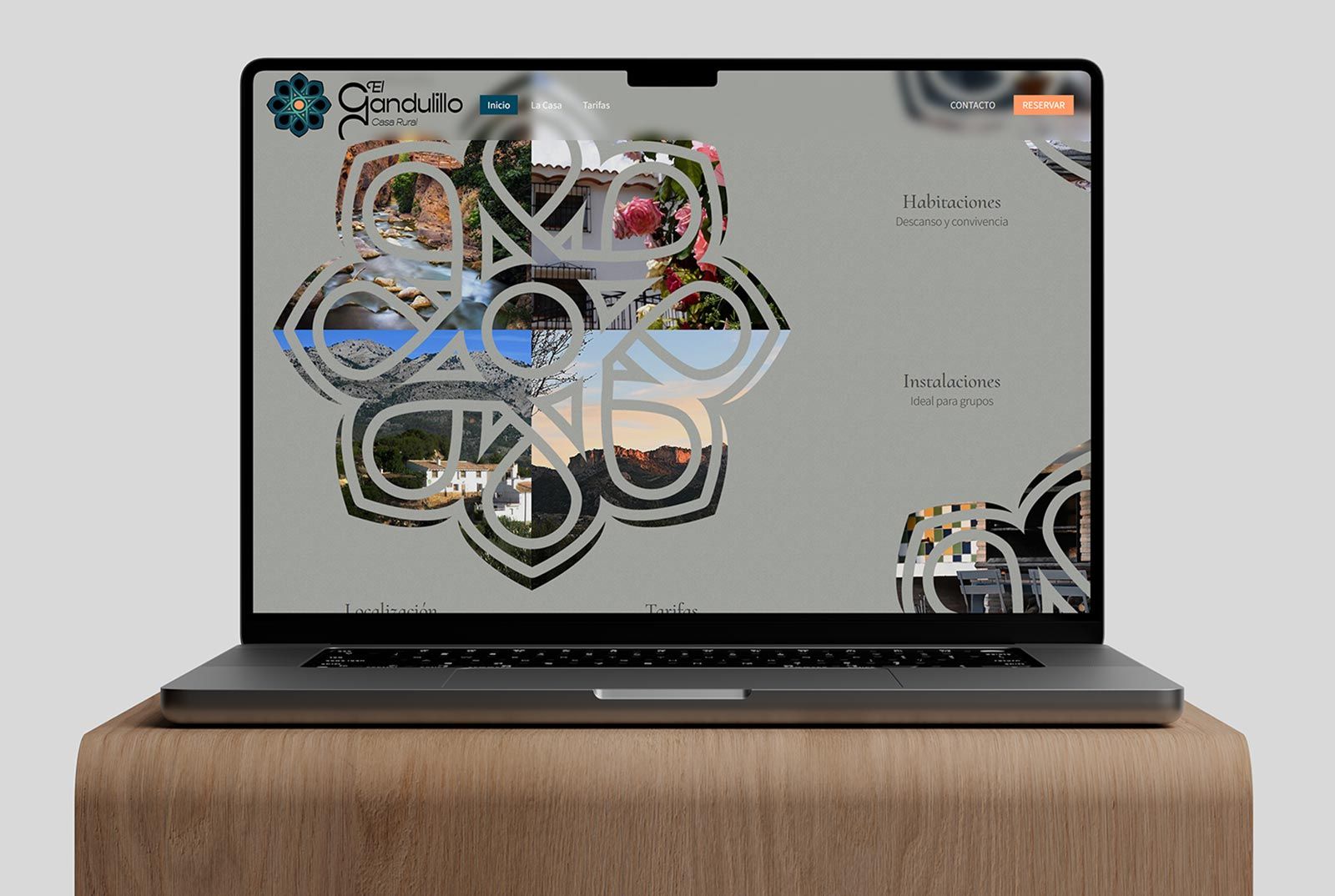 Se realiza un rediseño completo de la página web del alojamiento rural, haciendo hincapié en la necesidad de añadir información útil, desde la misma página de inicio. Para ello, usando máscaras del símbolo desarrollado en la identidad visual de El Gandulillo, se crean áreas interactivas a modo de botones donde el usuario pueda encontrar diversa información.