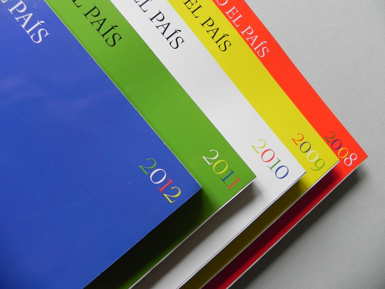 El País es el diario más vendido en España, y su anuario ha sido diseñado en nuestro estudio los últimos 30 años. Con unas portadas basadas en la obra "Diafragma pentafónico" de Cruz Novillo, que mediante las combinaciones sin repetición de cinco colores (cuatro para las cifras del año y uno para el fondo) nos permite crear anuarios distintos durante 120 años.