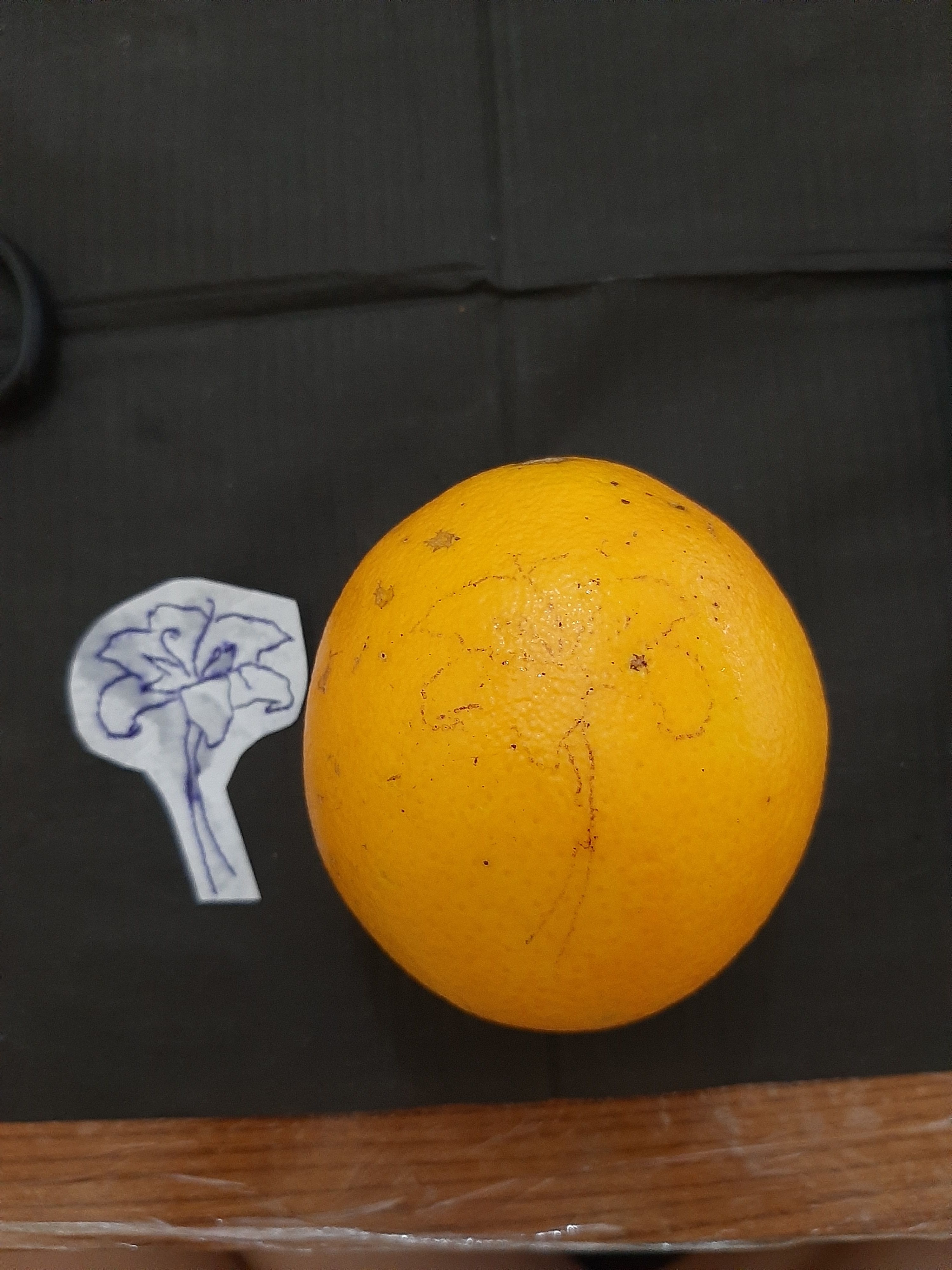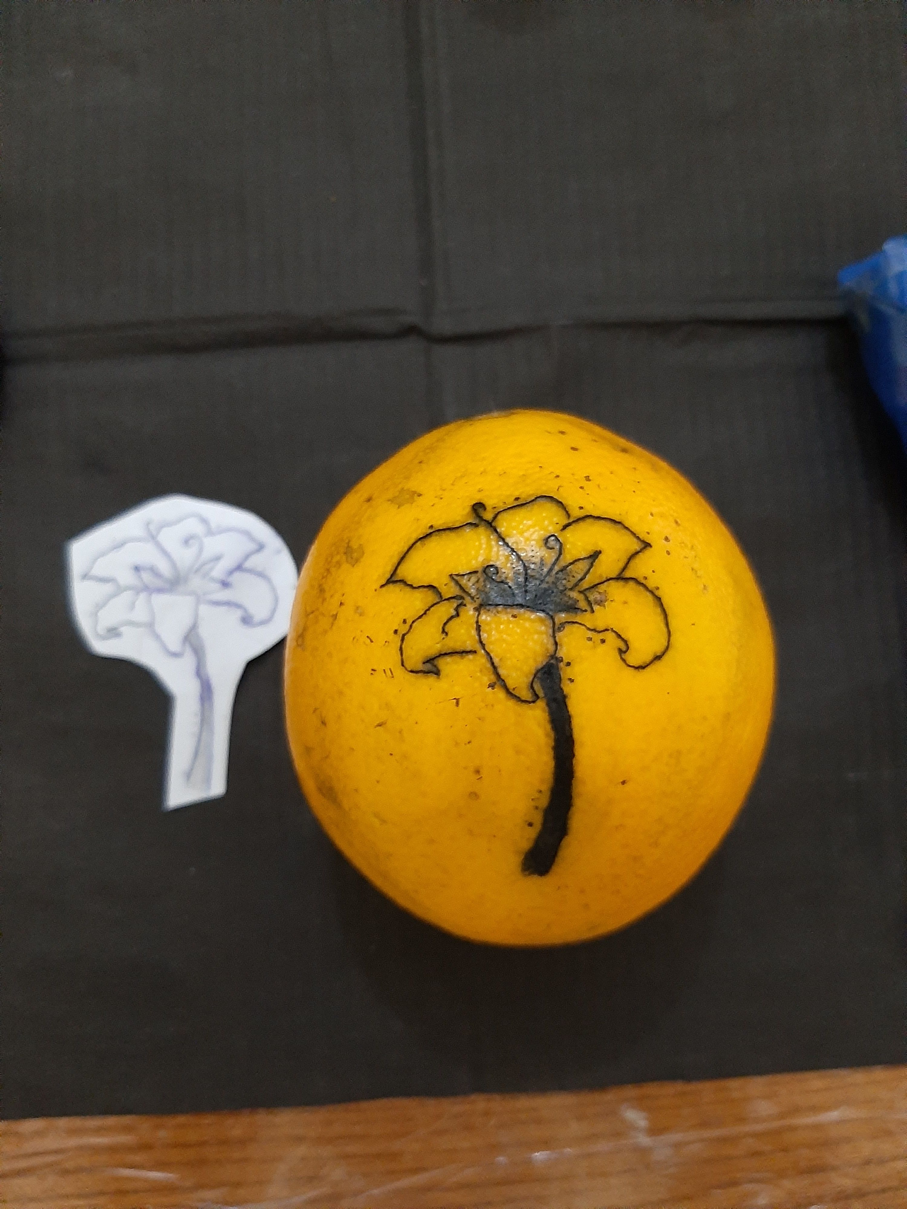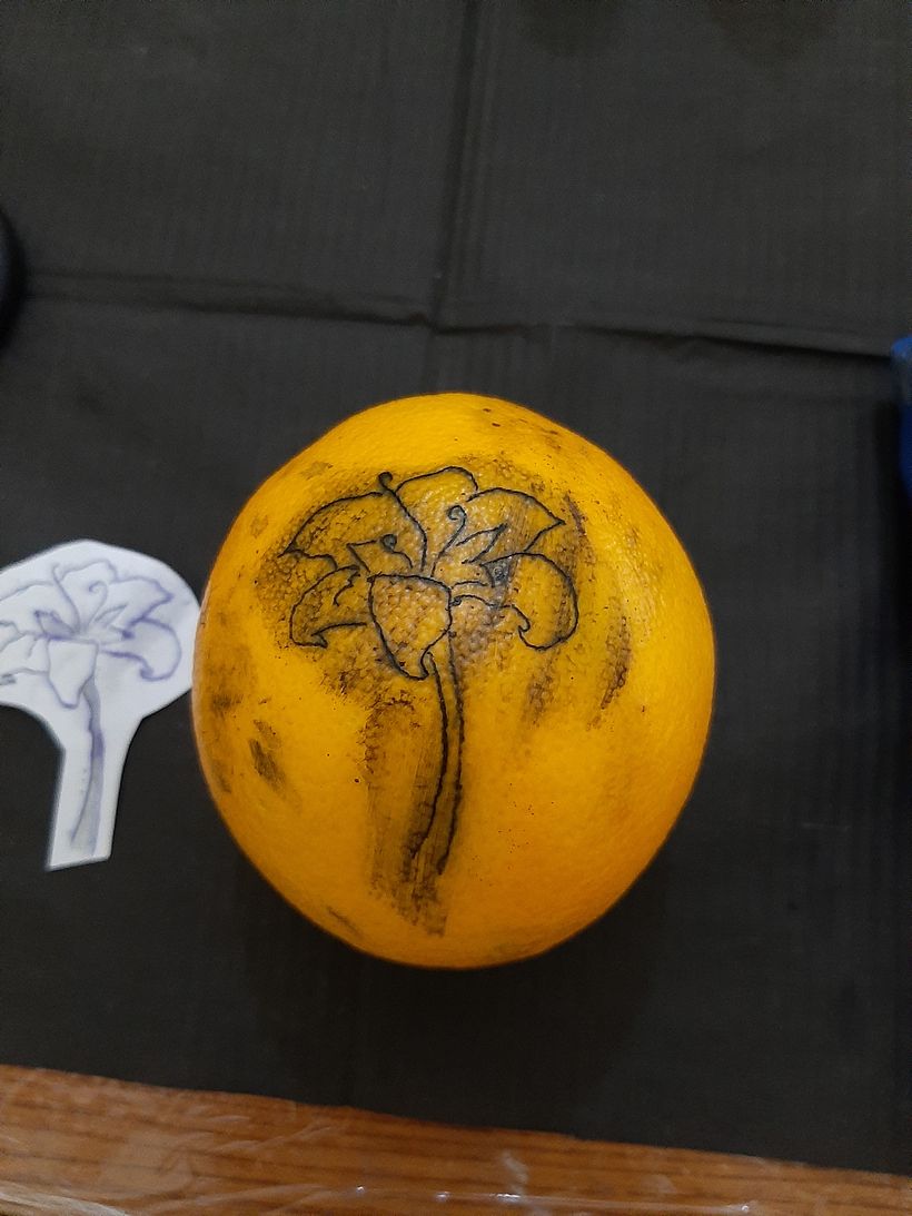 limpie la naranja, aplique el stencil y pegue el diseño. la naranja no pigmenta bien asique fui tatuando por arriba giandome con el dibujo, luego le añadi sombreado y lo rellene.