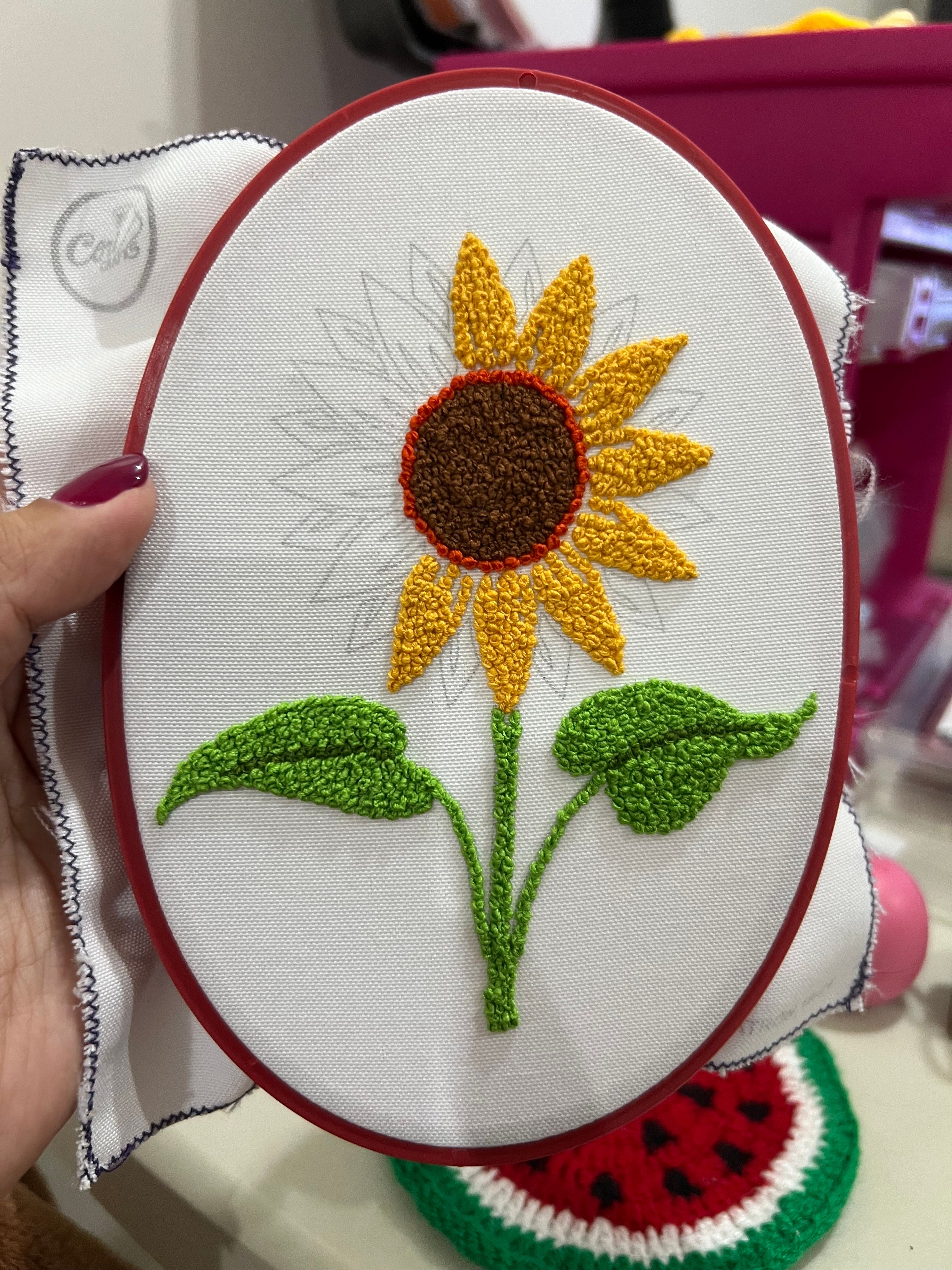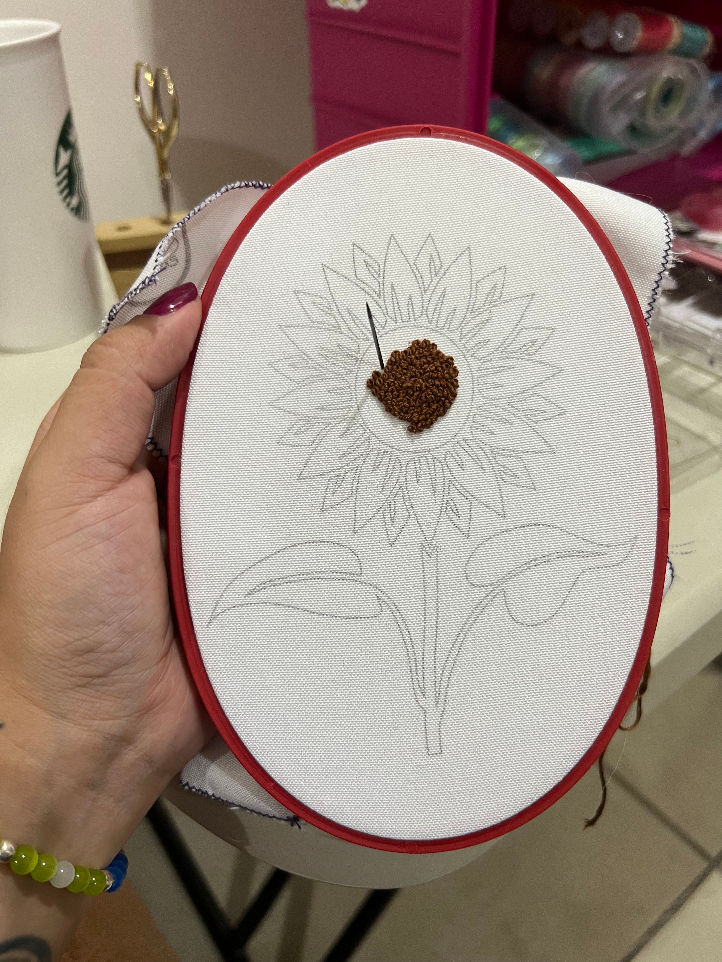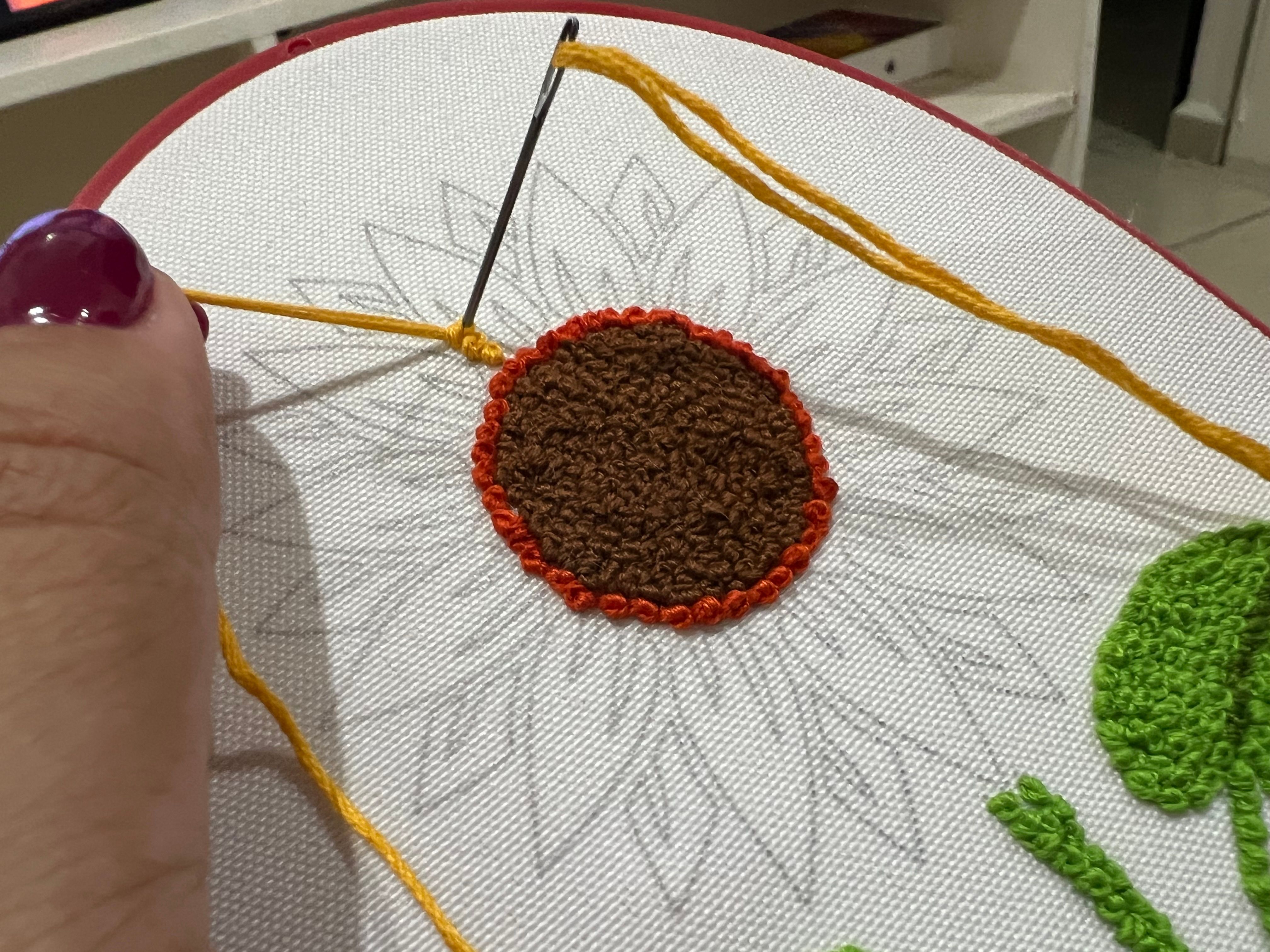 Patrón gratis para bordar Julio 2024Para este patrón decidí usar solamente nudos franceses, empecé por el centro, en café.Agregando los amarillosAgregando los verdes, todo con mucha paciencia, los nudos franceses llevan su tiempo :)Últimos toques usando otro tono de amarilloPieza terminada, close upPieza terminada :)