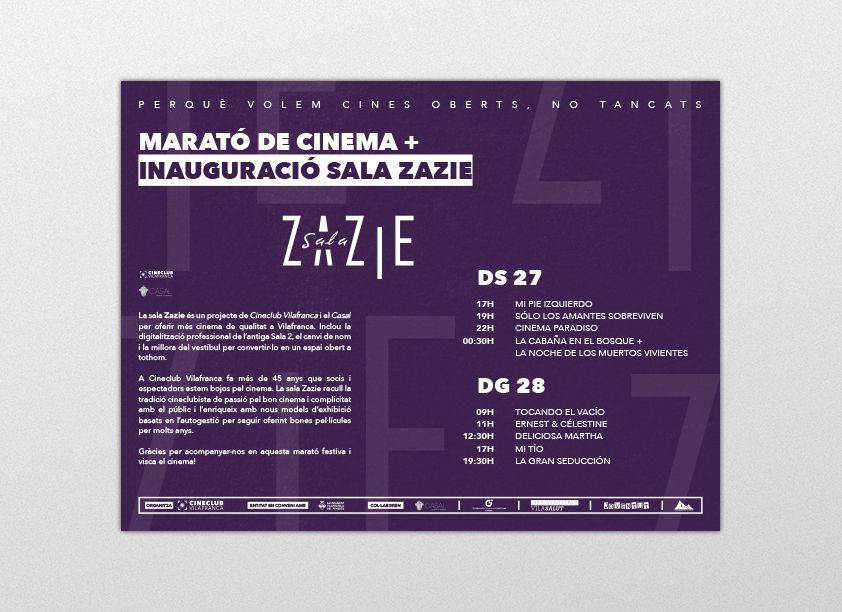 Rediseño integral de la antigua Sala2 de Vilafranca del Penedès. Coincidió con su digitalización, su adecuación a un nuevo espacio-vestíbulo y consecuentemente su nueva imagen cambió. Su nuevo nombre, "Sala Zazie", se inspiró en el carismático personaje de "Zazie dans le mètro", primera película proyectada en este cine.