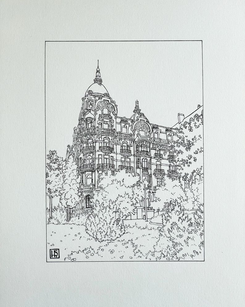 While in Madrid a little while back, I walked past a place called the Casa Gallardo and I thought it looked like a nice place to draw. The lighting on it was amazing and there was a ton of really great architectural details on it. I didn't have the time to sit there and draw it on the spot, so I took a LOT of pictures of it so I could make a drawing of it once I got home. Here's a few pictures of the process!
