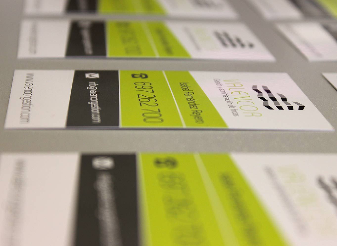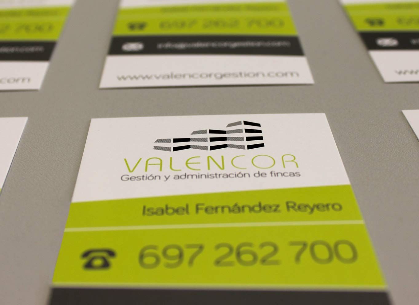 Trabajo realizado en Fiebre Creativa de diseño gráfico de tarjetas de visita e impresión de 5000 tarjetas 350 gr papel estucado brillo para Valencor gestión y administración de fincas.