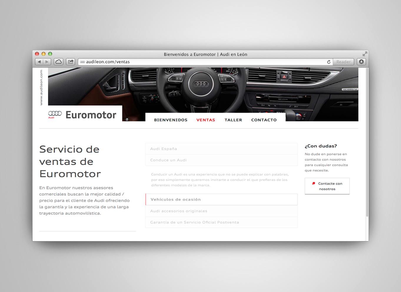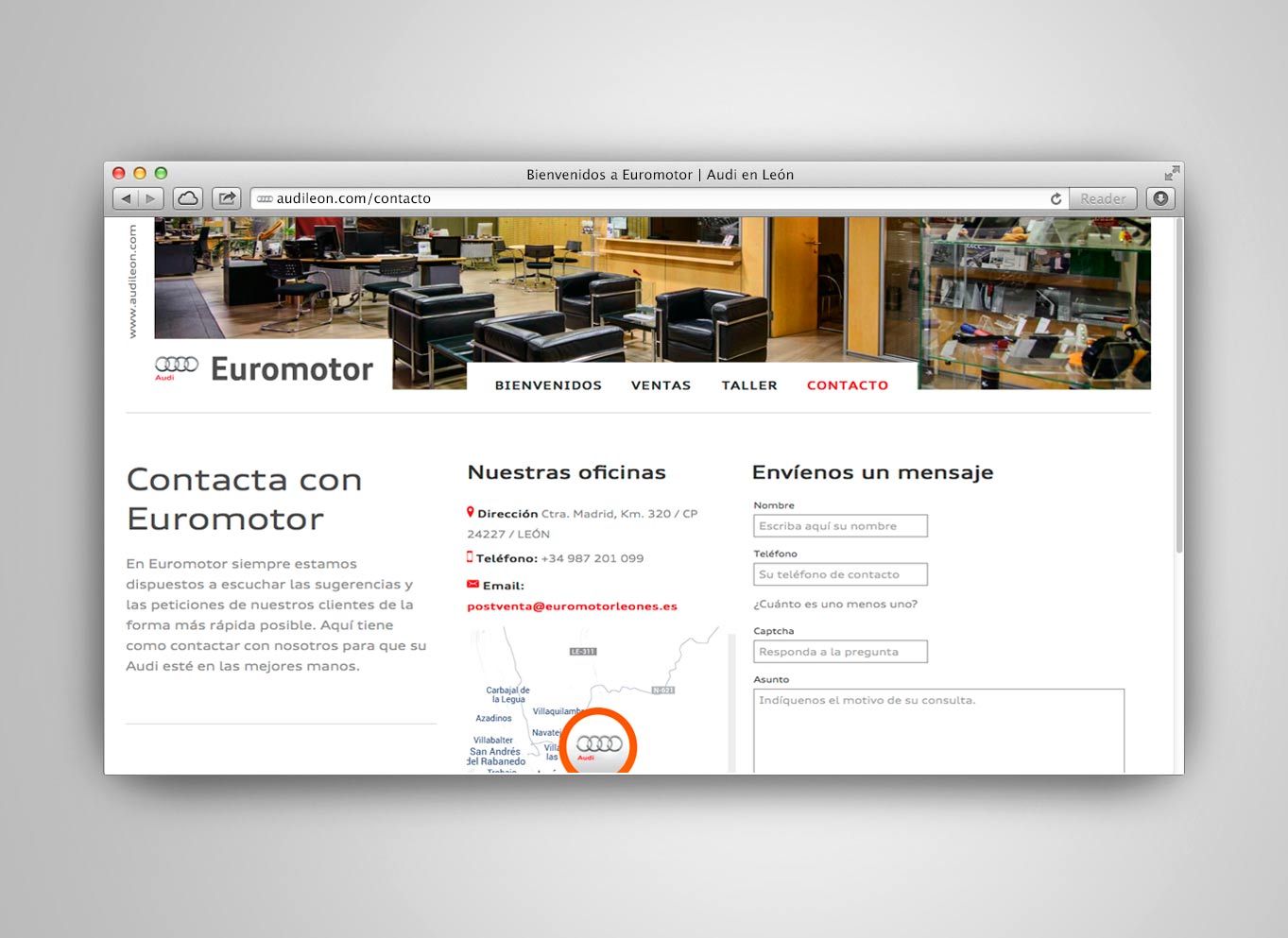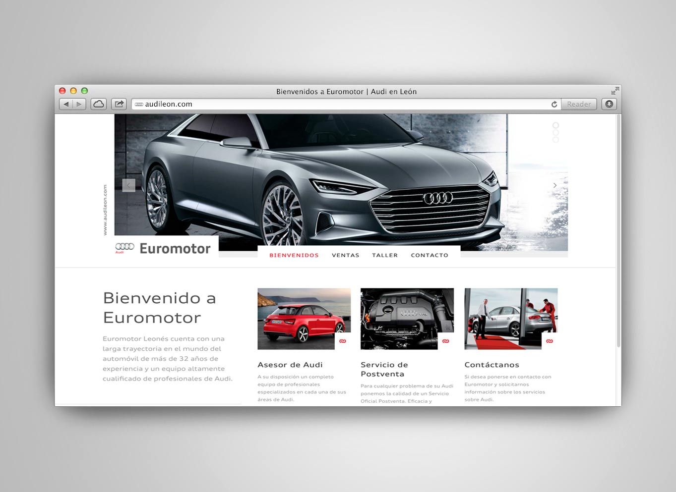 Euromotor Leonés cuenta con una larga trayectoria en el mundo del automóvil de más de 32 años de experiencia y un equipo altamente cualificado de profesionales de ventas y Servicio Oficial Postventa de Audi en León. Landing page audileon.com realizada en HTML5 para Euromotor Leonés.