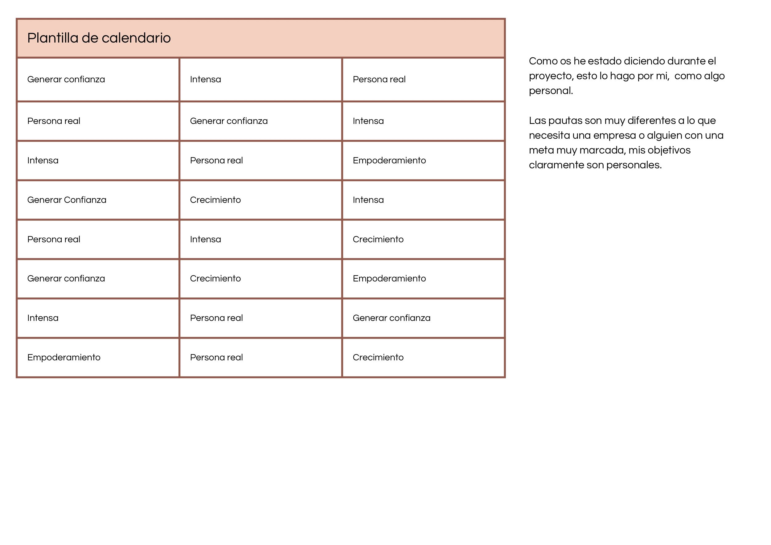 Y con el mapa de contenido hice esta plantilla de calendario, en una semana tres publicaciones, algo sencillo.