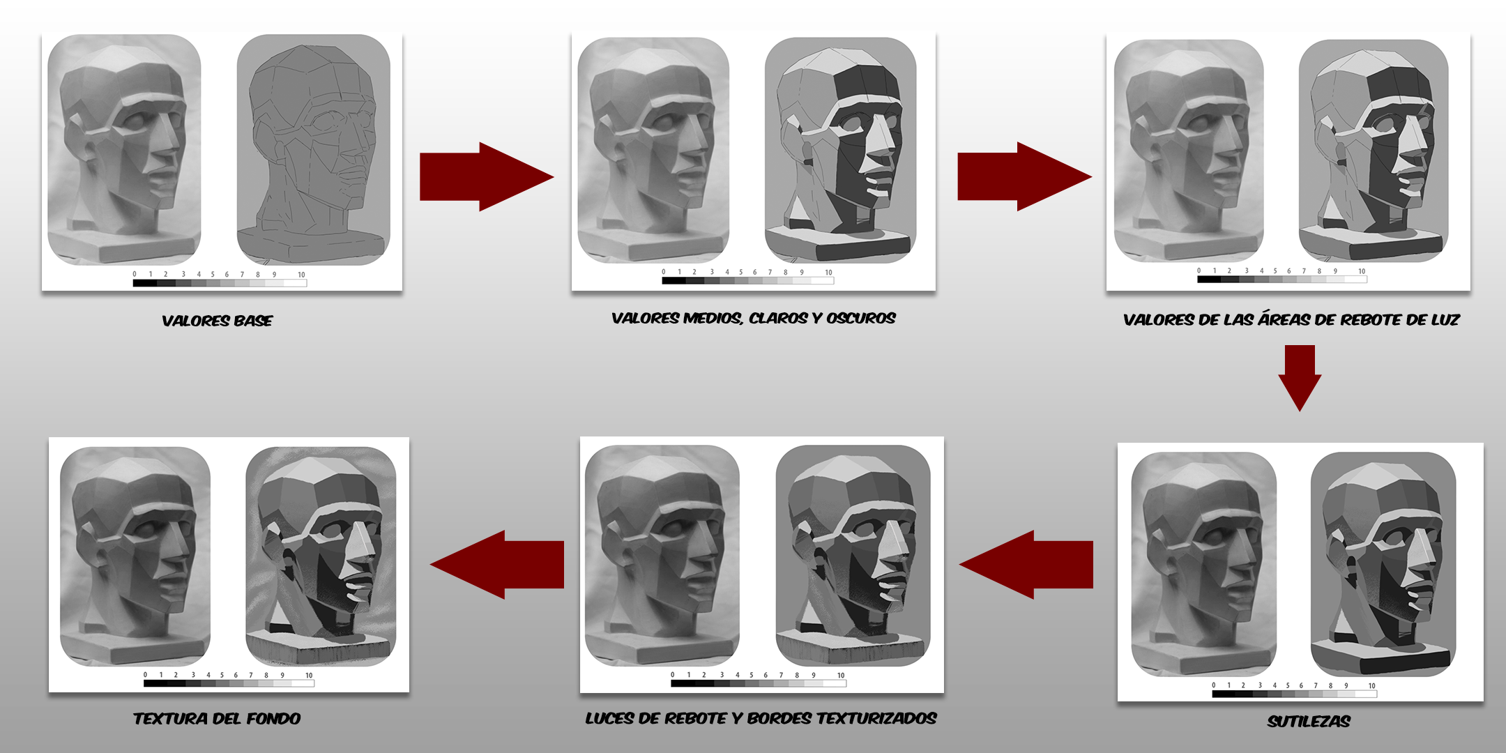 Tomando eso en cuenta, para dibujar tonos medios, puedo moverme entre los valores 3 y 5 para definir tonos más o oscuros o claros, pero aún así permanecer en la banda de tonos medios.