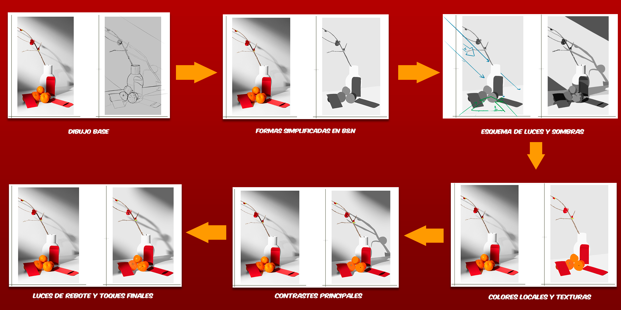 Pero, esto es nuevamente algo que es totalmente normal, y es que habían razones para que dichas sombras fueran de colores diferentes, y es que recordando lo que aprendí, caí en cuenta de que la luz envuelve a todos los objetos que se encontraban en esa composición, por ende habían bastantes zonas en las que la luz rebotaba y se generaban ciertas tonalidades rojizas, marrones, o naranjas en ciertas áreas de la referencia, y por eso las sombras cambiaban, comprender eso me ayudó mucho y decidí trabajar con ese conocimiento y aplicarlo a mi pintura, y al hacerlo finalmente logré desatorarme y seguir adelante, únicamente plasmando por ahora el Contraste Principal (las sombras) de cada objeto.
