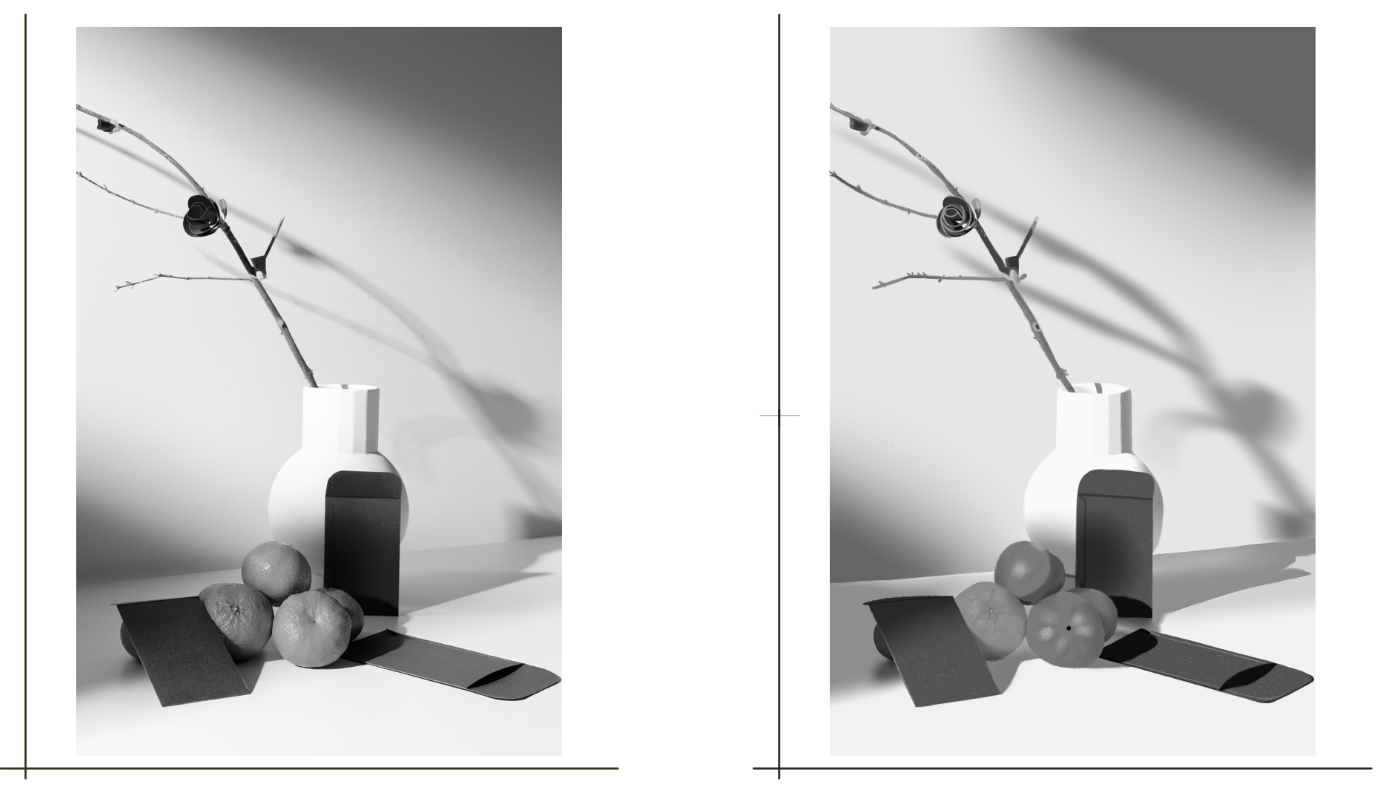Lo siguiente que hice, fue establecer una versión simplificada de la referencia en blanco y negro, plasmando cada uno de los elementos en formas sencillas para ayudarme a comprender la estructura de los objetos y a su vez para simplificar el estudio de las fuentes de luz que estaban presentes en la referencia. Aquí fue donde se complicó un poco la cosa, porque me di cuenta que debido al comportamiento de las sombras proyectadas, y los reflejos en las mandarinas, resulta que no había una sola fuente de luz, sino dos. Una de estas partía desde el punto de vista del observador, y la otra estaba en la parte superior izquierda, dando como resultado una distribución de sombras que concluí que se veían como las que especifiqué.