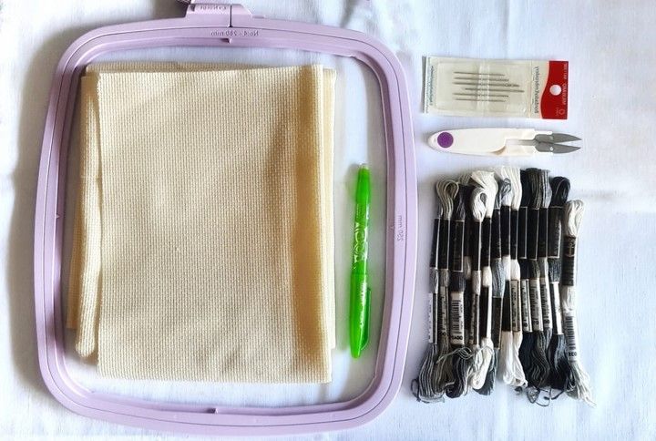 6. Hilos tipo Mouliné en tonos de grises (en mi caso usé 11 tonos de la marca Anchor: 1, 391, 398, 399, 400, 403, 1011, 1041, 1088 y 8581)