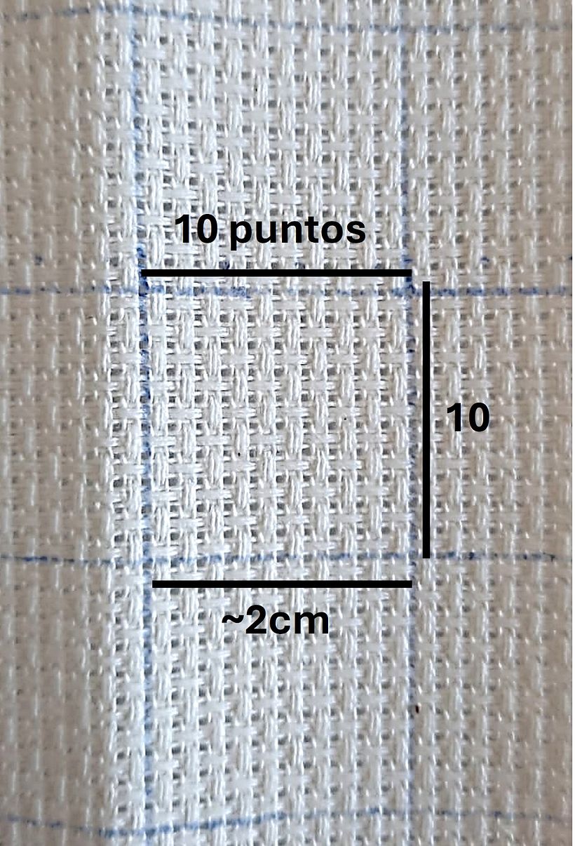 Adicionalmente, necesitarás determinar previamente el tamaño de tu bordado final para usar estas informaciones al momento de crear el gráfico guía de punto cruz que bordaremos. Debido a que las tramas de tejido Aida pueden variar, te recomiendo que calcules cual es el tamaño de 10 puntos en tu tejido y su equivalente en centímetros (Figura 3). Por ejemplo, en mi caso, 10 puntos equivalen a 2cm.