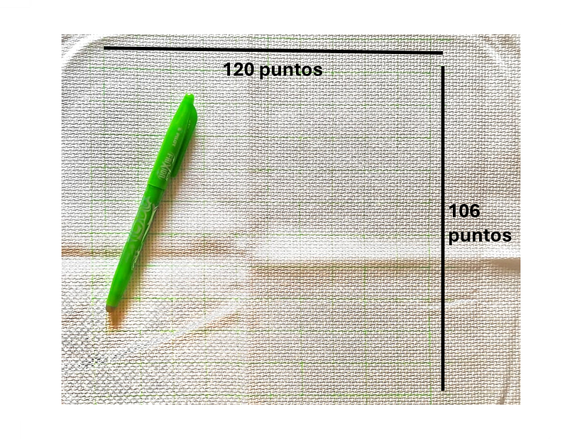 Marca esa cuadrícula en tu tela con bolígrafo termo borrable. En mi caso, la cuadrícula es de 120 puntos de ancho por 106 de largo (Figura 5).
