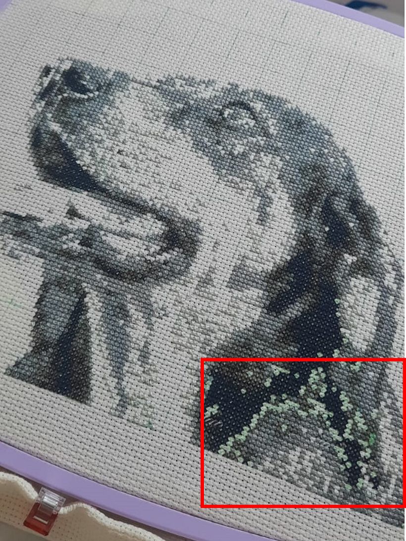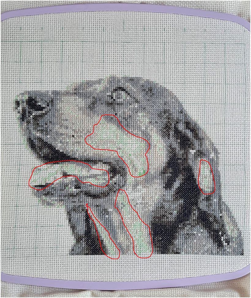 Prefiero bordar siempre color a color y no marcar todos los puntos con diferentes colores en el tejido, pues de ser así, necesitaría varios colores de bolígrafo y corregir errores de marcación puede llegar a ser caótico. Así que, te recomiendo ir bordando un color a la vez. Confía en el proceso, que ya verás que poco a poco el bordado va tomando forma. Aquí te muestro en la Figura 7a-7b, como en la regiones destacadas en rojo, están los puntos hechos con el bolígrafo en medio del resto de colores ya bordados.
