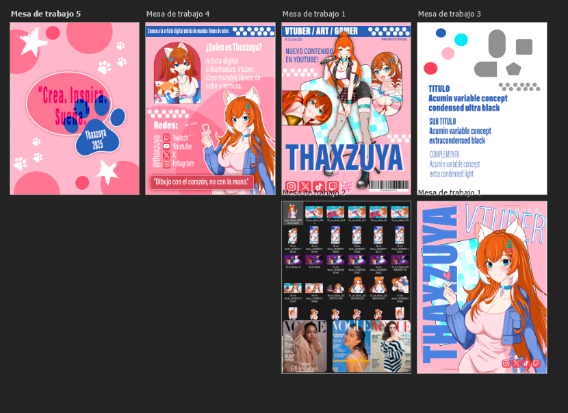 Utilicé capturas e ilustraciones de mi modelo Vtuber actual como base visual para representar mi identidad como creadora de contenido.