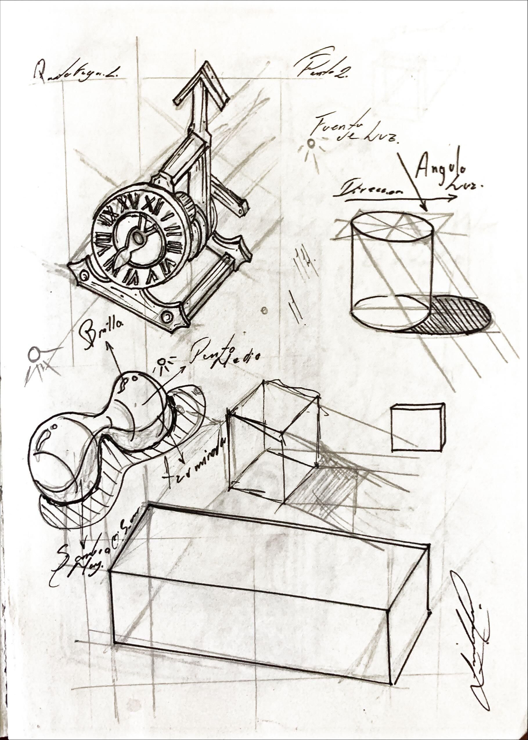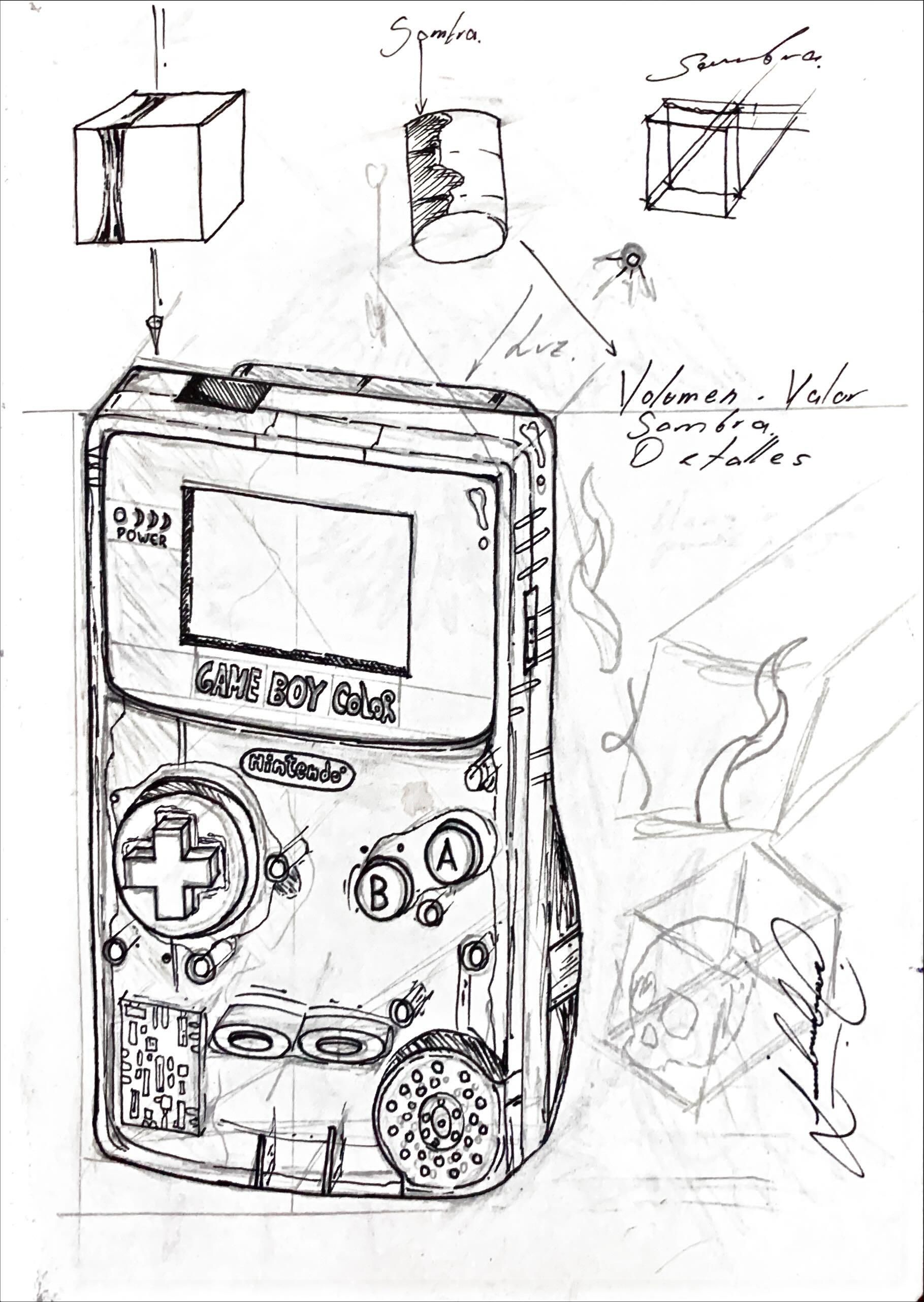 Comencé mi proceso realizando una breve practica de dibujo con referencia visual, utilice una consola gameboy que tengo en mi escritorio, la posicione de manera que fuera un poco complicado determinar su perspectiva y comencé a dibujar basándome en lo que podía ver.
