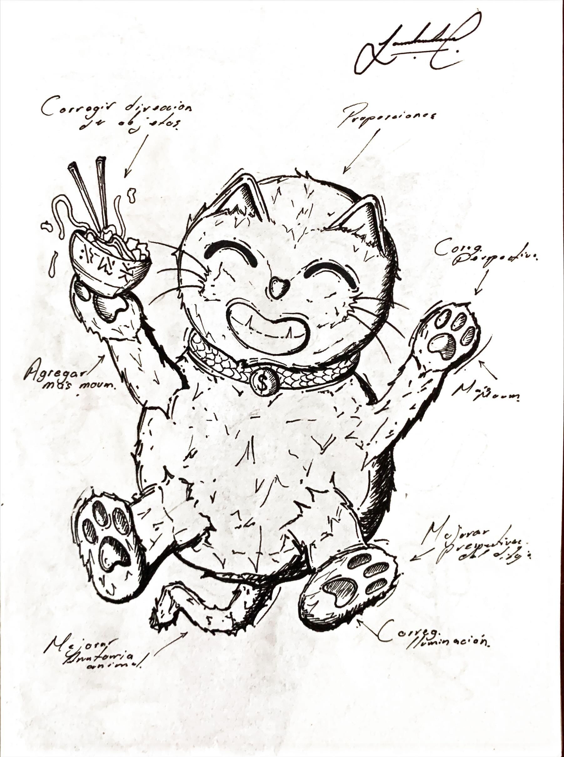 De acuerdo a lo aprendido en las lecciones de la U3, decidí hacer mi primer dibujo imaginativo basándome en la única referencia visual que tenia, mi mascota, comencé con el proceso del boceto, desglosando la imagen en pequeños círculos que conformarían el cuerpo del gato, decidí agregar el plato de ramen para dar una sensación al estilo japones, siendo este uno de mis estilos o referencias visuales favoritas.