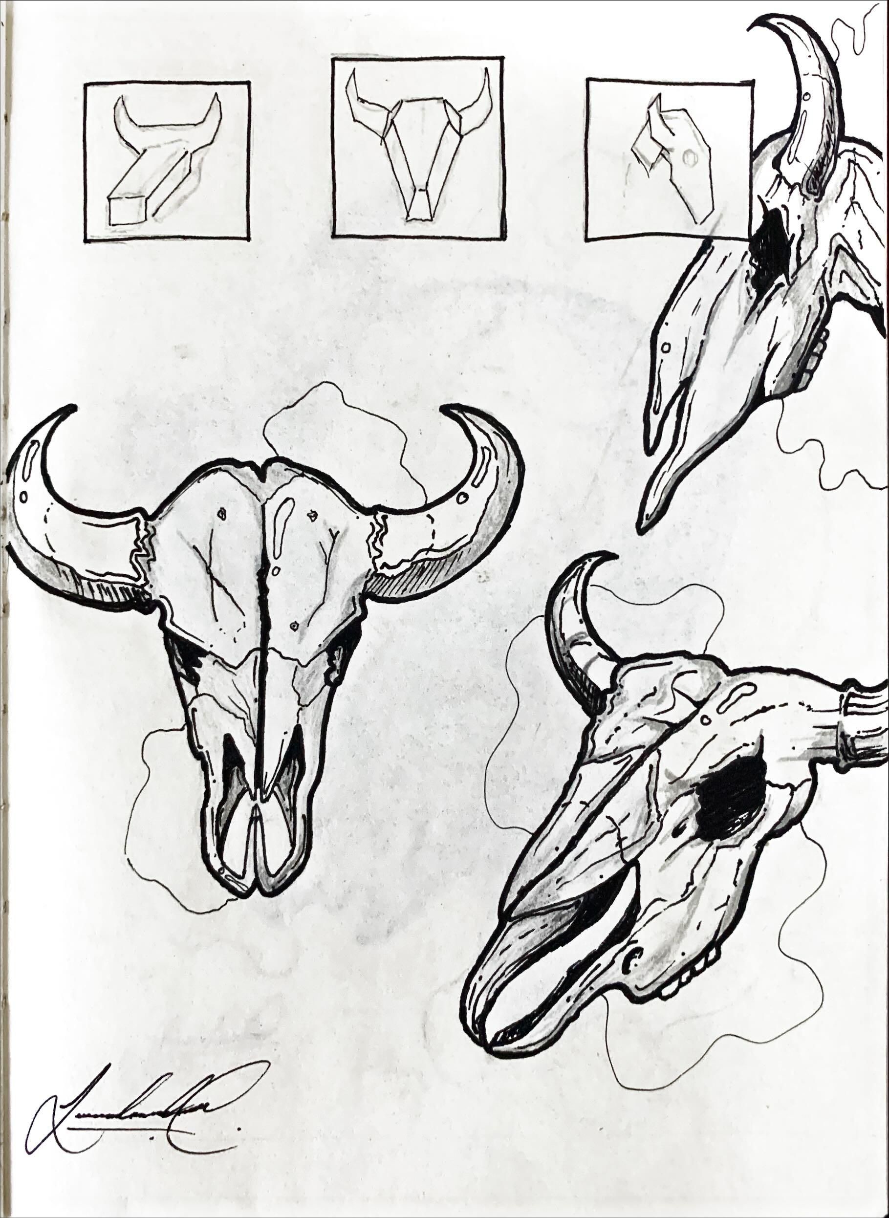 Antes de realizar mi ultimo dibujo realice una breve practica para aprender un poco como desglosar un cráneo animal, en este caso el de una vaca, además de agregar unos mejores efectos de sombra e iluminación.