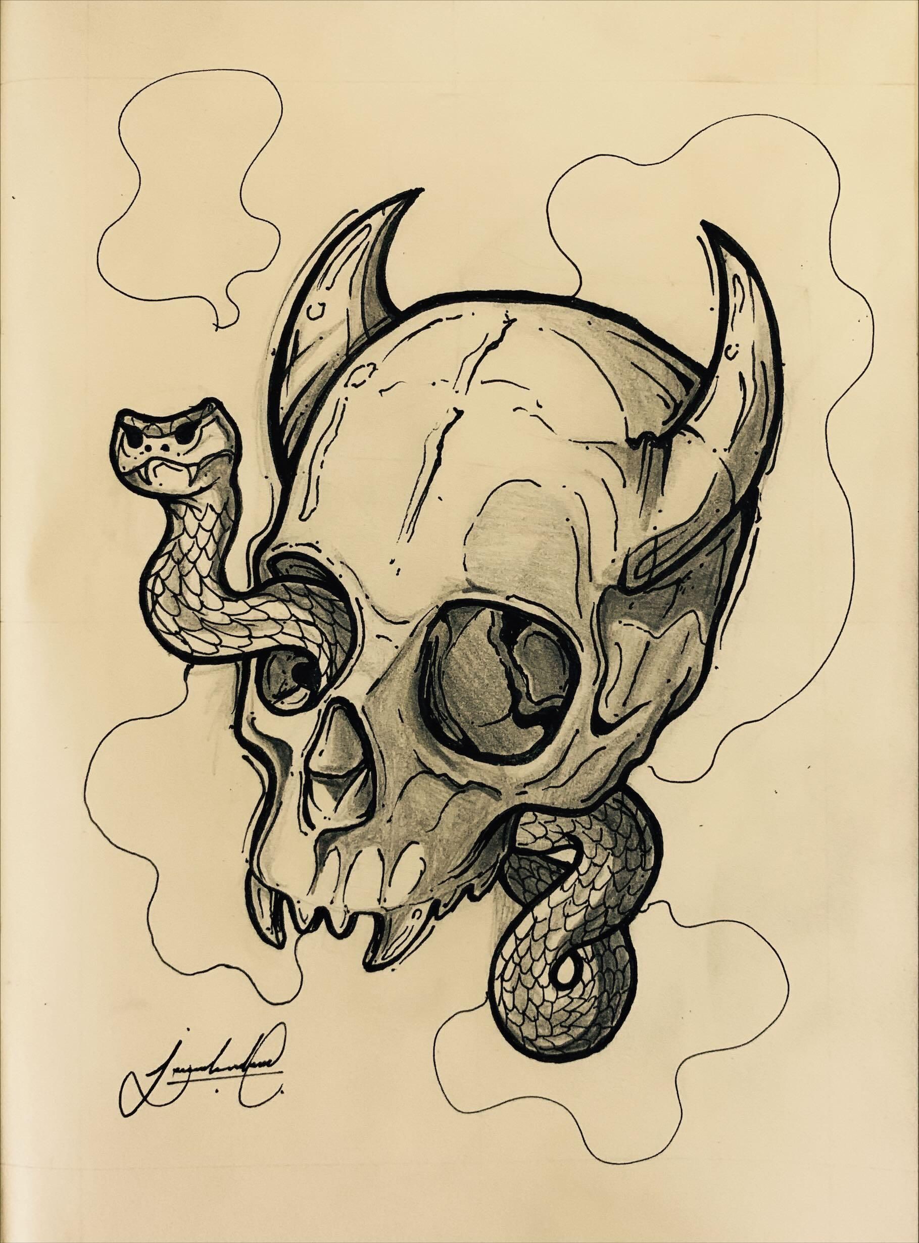 Aplicando todo lo aprendido, decidí tomar como referencia principal un cráneo humano ubicado en una perspectiva de 3/4 a la izquierda, como proceso imaginativo decidí darle cuernos, colmillos, y permitir que una serpiente estuviera ''Viviendo'' en su interior, agregue mas contraste con las sombras y una mejor visualización del punto del que proviene la luz, permitiendo un mejor punto focal hacia la cara del cráneo.