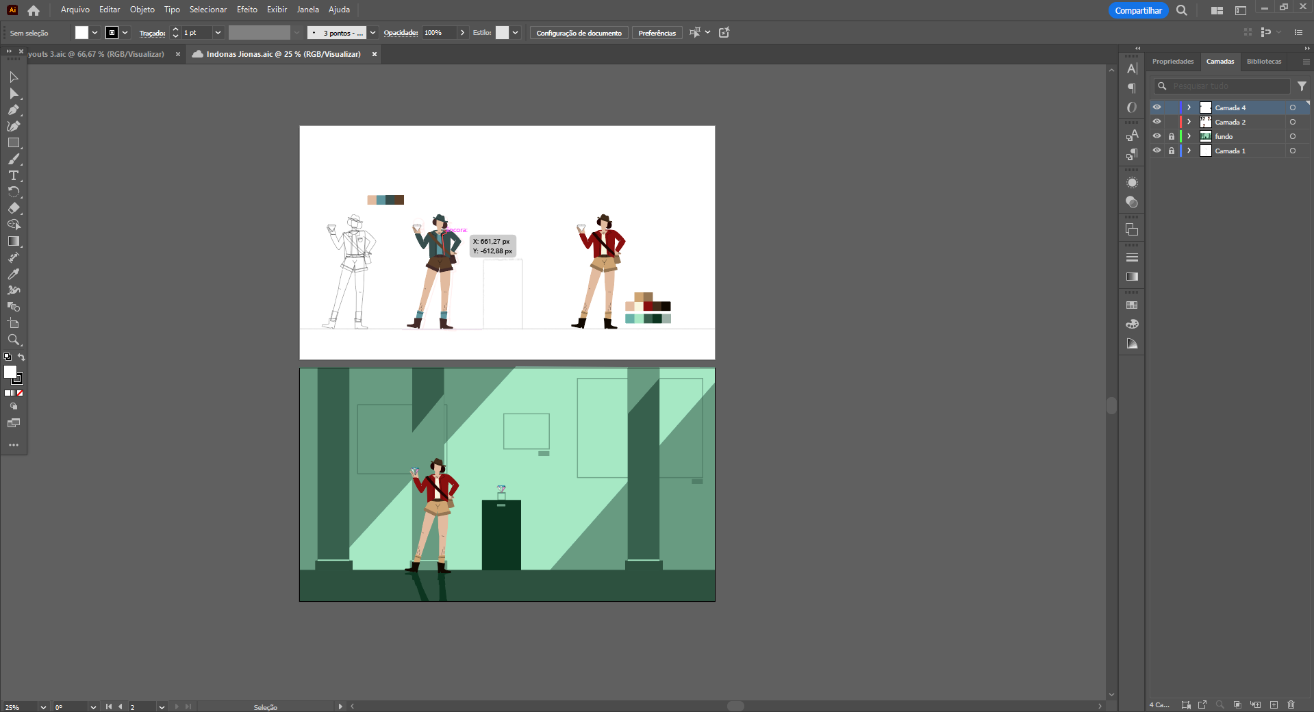 Fazer essa animação foi uma experiência intensa e ao mesmo tempo muito recompensadora. No Illustrator, o começo parecia quase como montar um quebra-cabeça: cada detalhe que eu criava já precisava ser pensado em como iria se mover depois. Foi uma fase mais paciente, de desenhar e organizar camadas, mas também criativa, porque era ali que eu definia a identidade visual do projeto.