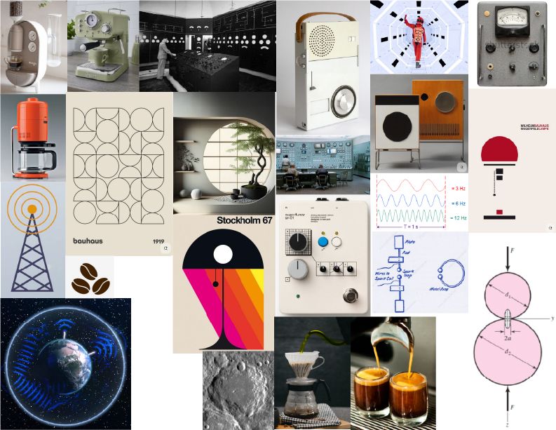 To solidify the direction, I assembled a mood board made up of science-inspired designs, vintage tech objects, and early modernist graphics, paired with modern interior design and contemporary coffee equipment. This mix helped bridge the retro-futuristic inspiration with a more current sensibility. For the design aesthetic, I wanted a clean and flat layout style influenced by Bauhaus principles but not as strictly minimal—structured and professional, but with room for bold colors and playful, experimental touches that match the shop’s concept.