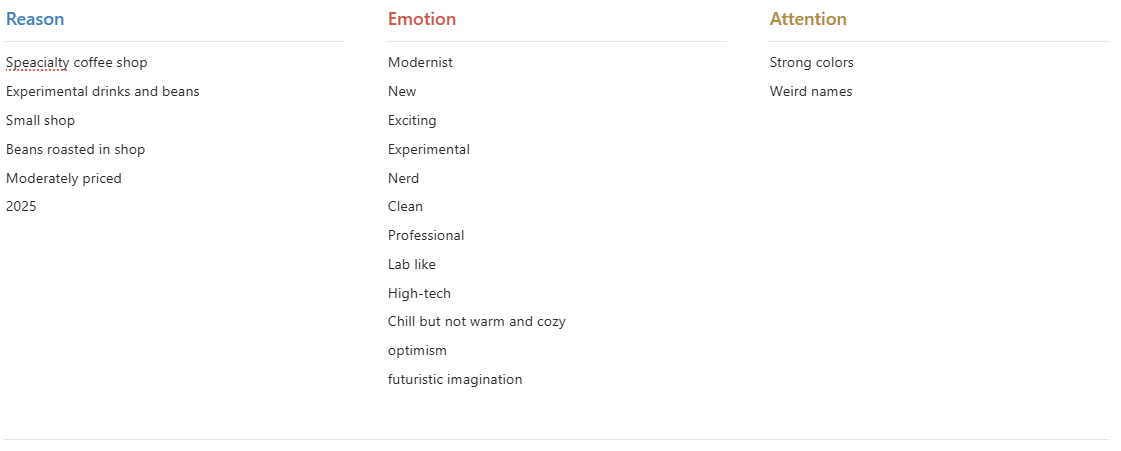 To establish a clear direction for the project, I began by brainstorming the concept and identity of the fictional brand. The idea centers on a specialty coffee shop in 2025 that offers experimental drinks and in-house roasted beans at moderate prices. The goal was to capture a modernist and futuristic feel—something clean, professional, and lab-like, yet still exciting and approachable. I focused on emotions such as optimism, curiosity, and high-tech imagination, while avoiding the typical “warm and cozy” coffee shop aesthetic. For attention, I envisioned strong colors and unusual names that would stand out on Instagram. These elements defined the creative brief and guided the design of three deliverables: