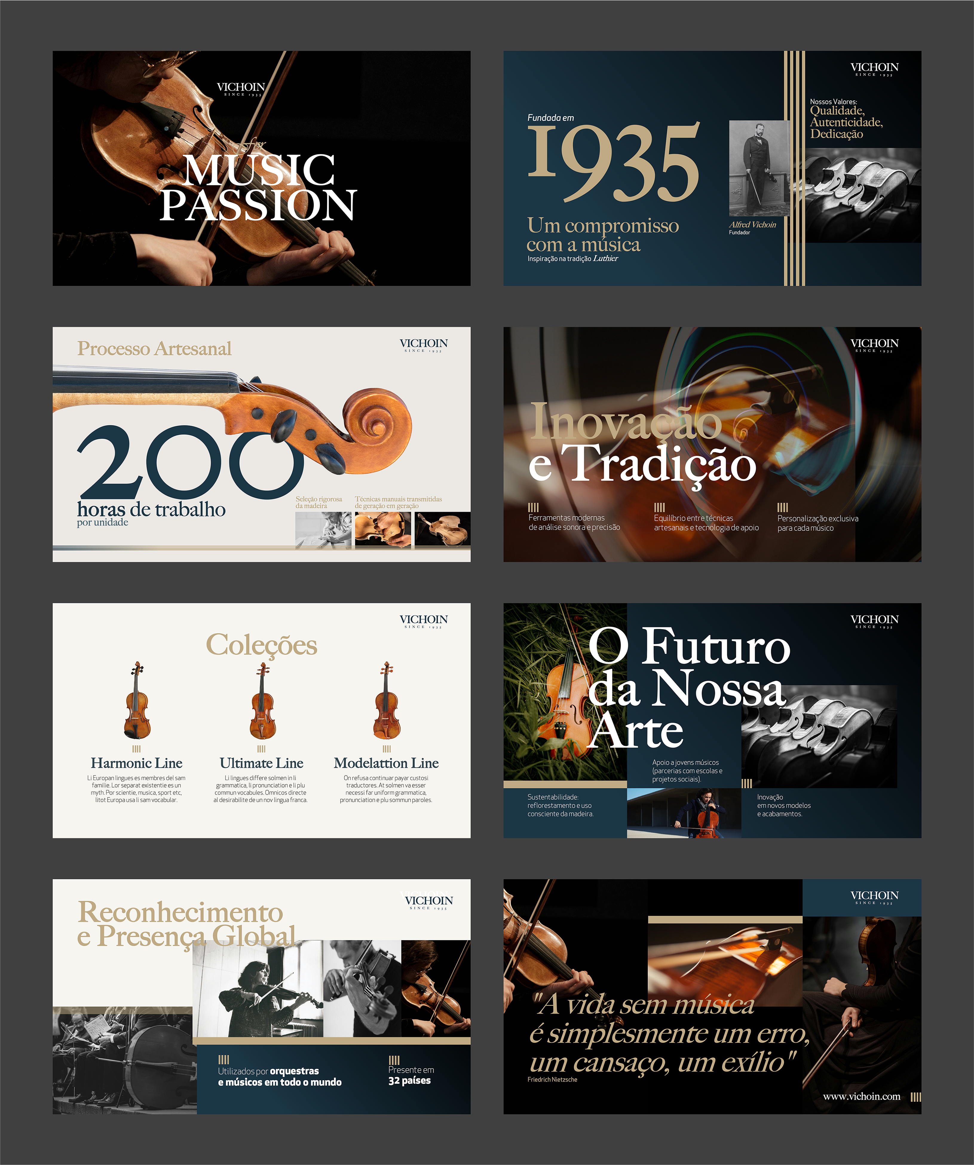 través do Chat GPT obteve-se uma proposta de estrutura para uma hipotética marca de violinos (Vichoin). O PowerPoint foi a ferramenta principal para edição. A adição da extensão BrightSlide, foi particularmente útil para a construção de grelha gráfica e de reposição do valor zero nas caixas de texto.