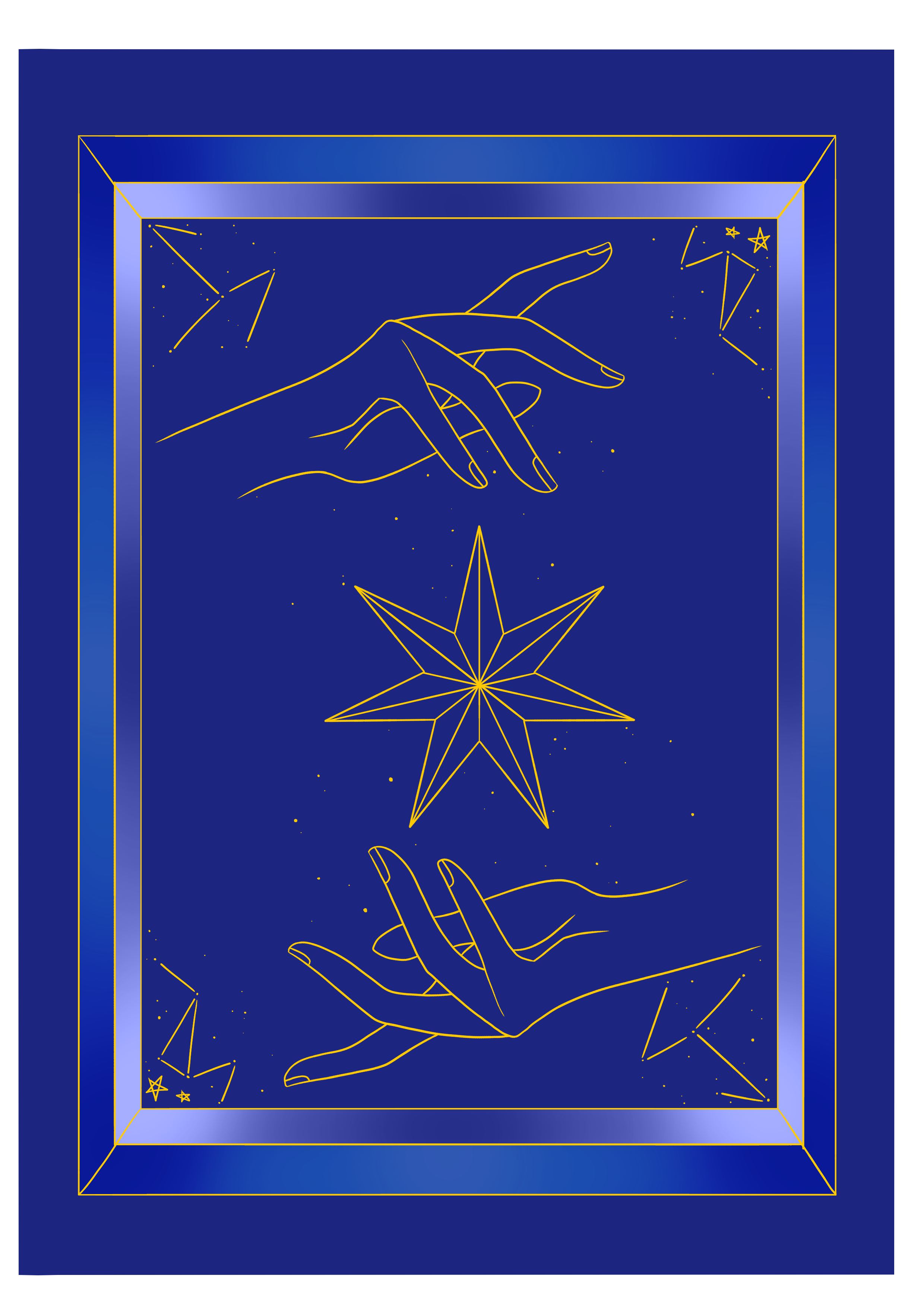 Para la parte trasera de la carta usé un fondo de un tono oscuro de azul, con detalles dorados, manos, estrellas y constelaciones, además de cuadros de colores difuminados que combinen.