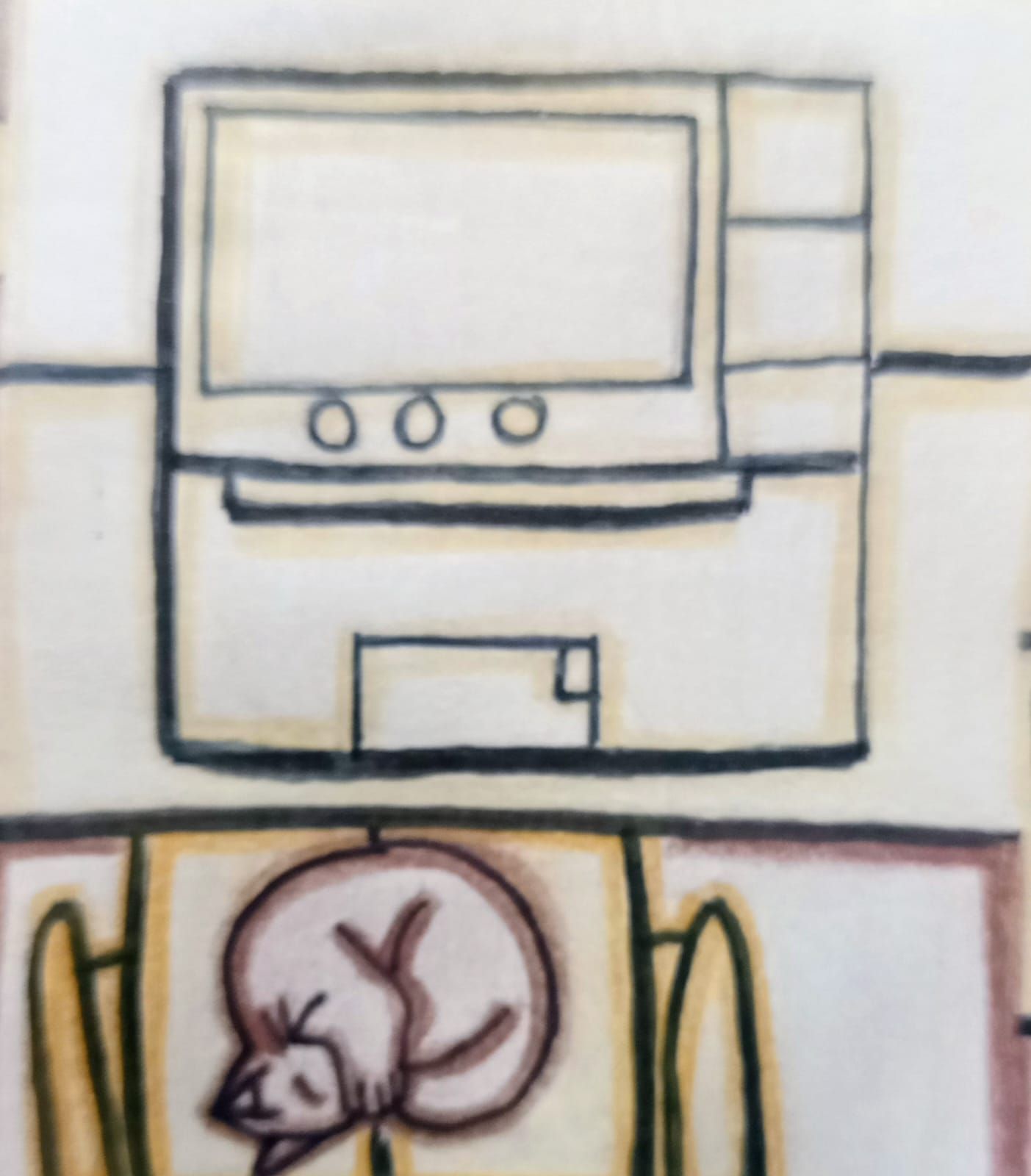 Voy a mostrar solo mis favoritos que hice durante el curso, entre ellos esta un pequeño dibujo de mi mamá y mi gato Júpiter, esta otro de Júpiter en mis piernas, un dibujo de Monserrate una iglesia de mi ciudad natal (Bogotá), un dibujo de pesadillas que tuve durante la noche, un desayuno con cara y un servilletero de vaca que vi después de muchos años, ese servilletero me recuerda a mi niñez.
